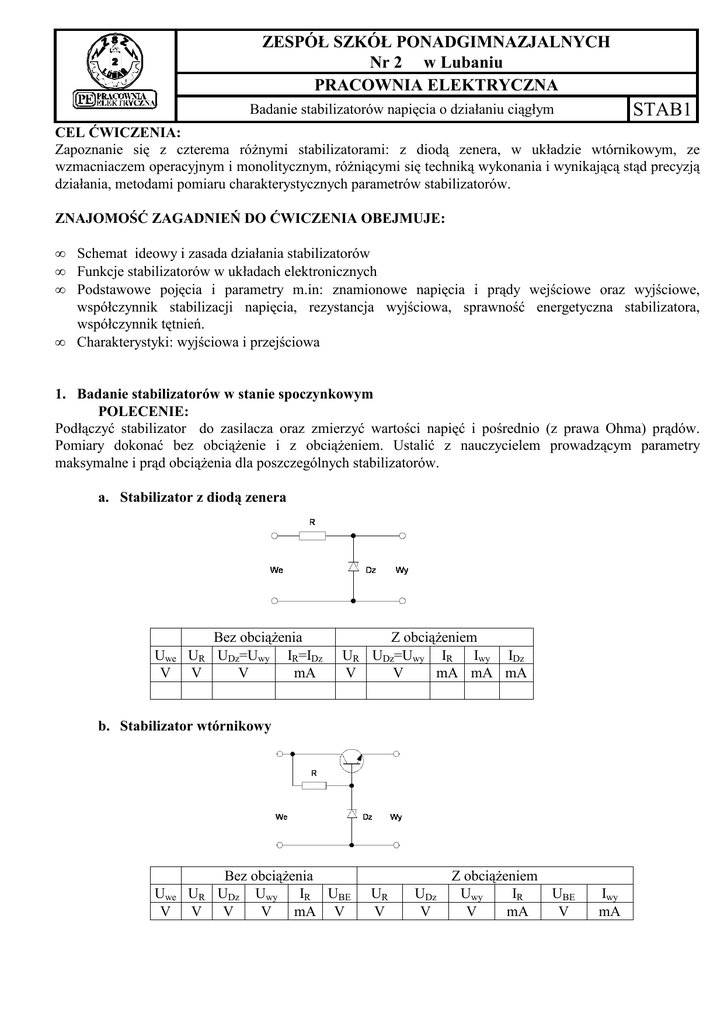 ZESPÓŁ SZKÓŁ PONADGIMNAZJALNYCH Nr 2 w Lubaniu PRACOWNIA ELEKTRYCZNA STAB1 Badanie stabilizatorów napięcia o działaniu ciągłym CEL ĆWICZENIA: Zapoznanie się z czterema róŜnymi stabilizatorami: z diodą zenera, w układzie wtórnikowym, ze wzmacniaczem operacyjnym i monolitycznym, róŜniącymi się techniką wykonania i wynikającą stąd precyzją działania, metodami pomiaru charakterystycznych parametrów stabilizatorów. ZNAJOMOŚĆ ZAGADNIEŃ DO ĆWICZENIA OBEJMUJE: • • • • Schemat ideowy i zasada działania stabilizatorów Funkcje stabilizatorów w układach elektronicznych Podstawowe pojęcia i parametry m.in: znamionowe napięcia i prądy wejściowe oraz wyjściowe, współczynnik stabilizacji napięcia, rezystancja wyjściowa, sprawność energetyczna stabilizatora, współczynnik tętnień. Charakterystyki: wyjściowa i przejściowa 1. Badanie stabilizatorów w stanie spoczynkowym POLECENIE: Podłączyć stabilizator do zasilacza oraz zmierzyć wartości napięć i pośrednio (z prawa Ohma) prądów. Pomiary dokonać bez obciąŜenie i z obciąŜeniem. Ustalić z nauczycielem prowadzącym parametry maksymalne i prąd obciąŜenia dla poszczególnych stabilizatorów. a. Stabilizator z diodą zenera Bez obciąŜenia Uwe UR UDz=Uwy IR=IDz V V V mA Z obciąŜeniem UR UDz=Uwy IR Iwy IDz V V mA mA mA b. Stabilizator wtórnikowy Bez obciąŜenia Uwe UR UDz Uwy IR UBE V V V V mA V UR V UDz V Z obciąŜeniem Uwy IR UBE V mA V Iwy mA c. Stabilizator ze wzmacniaczem operacyjnym Uwe V Bez obciąŜenia UR IR UDz= U+ U- UB UBE Uwy V mA V V V V V UR V IR mA Z obciąŜeniem UDz= U+ UUB V V V UBE V Uwy V Iwy d. Stabilizator monolityczny serii 78XX Uwe V Bez obciąŜenia Uwy V Z obciąŜeniem Uwy Iwy V mA 2. Wyznaczanie charakterystyki wyjściowej stabilizatora POLECENIE: Włączyć stabilizatory do układu pomiarowego przedstawionego poniŜej. Zmieniając wartość prądu obciąŜenia mierzyć wartość napięcia na wyjściu. Wyniki umieścić w tabeli. Na podstawie danych wykreślić charakterystykę stabilizatorów. Iwe przy Uwe = ... mA Iwy mA Uwy V 3. Wyznaczanie charakterystyki przejściowej POLECENIE: Włączyć stabilizatory do układu pomiarowego z p. 2. Zmieniając wartość napięcia wejściowego mierzyć wartość napięcia na wyjściu przy stałym prądzie obciąŜenia. Wyniki umieścić w tabeli. Na podstawie danych wykreślić charakterystykę stabilizatorów. Uwe V Iwe Uwy przy Iwy=..... mA V 4. Obliczenie parametrów stabilizatorów POLECENIE: Na podstawie danych uzyskanych z punktów 2 i 3 obliczyć dla kaŜdego stabilizatora ∆Uwy przy I wy = const ∆Uwe ∆Uwy • Rezystancja wyjściowa Rwy = przy U we = const ∆Iwy Pwe • Sprawność energetyczna dla średnich wartości prądu η = Pwy 5. Pomiar napięcia i współczynnika tętnień POLECENIE: Zmontować układ przedstawiony poniŜej. Ustawić za pomocą oscyloskopu napięcie wejściowe tętnień na wartość 1Vpp. Przy zadanym obciąŜeniu stabilizatora zmierzyć oscyloskopem międzyszczytowe napięcie tętnień i obliczyć współczynnik tętnień dla kaŜdego stabilizatora. • Współczynnik stabilizacji napięcia Współczynnik tętnień kt = Uwet Vpp SU = U wyt U wet Uwyt Vpp kt - Pytania kontrolne: 1. Co to jest stabilizator? 2. Na podstawie schematu ideowego opisz działanie stabilizatora : z diodą zenera, w układzie wtórnikowym i ze wzmacniaczem operacyjnym . 3. Narysuj charakterystyki wyjściową i przejściową stabilizatora napięcia idealnego i rzeczywistego 4. Opisz parametry stabilizatora: znamionowe napięcia i prądu wejściowe oraz wyjściowe, współczynnik stabilizacji napięcia, rezystancja wyjściowa, sprawność energetyczna stabilizatora, współczynnik tętnień. 5. Jak wyznaczyć przedstawione powyŜej parametry i charakterystyki stabilizatorów ?