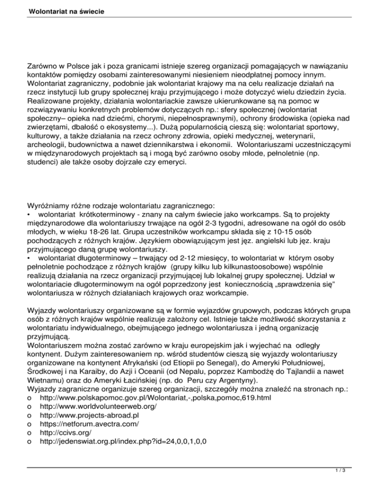 Wolontariat na świecie Zarówno w Polsce jak i poza granicami istnieje szereg organizacji pomagających w nawiązaniu kontaktów pomiędzy osobami zainteresowanymi niesieniem nieodpłatnej pomocy innym. Wolontariat zagraniczny, podobnie jak wolontariat krajowy ma na celu realizacje działań na rzecz instytucji lub grupy społecznej kraju przyjmującego i może dotyczyć wielu dziedzin życia. Realizowane projekty, działania wolontariackie zawsze ukierunkowane są na pomoc w rozwiązywaniu konkretnych problemów dotyczących np.: sfery społecznej (wolontariat społeczny– opieka nad dziećmi, chorymi, niepełnosprawnymi), ochrony środowiska (opieka nad zwierzętami, dbałość o ekosystemy...). Dużą popularnością cieszą się: wolontariat sportowy, kulturowy, a także działania na rzecz ochrony zdrowia, opieki medycznej, weterynarii, archeologii, budownictwa a nawet dziennikarstwa i ekonomii. Wolontariuszami uczestniczącymi w międzynarodowych projektach są i mogą być zarówno osoby młode, pełnoletnie (np. studenci) ale także osoby dojrzałe czy emeryci. Wyróżniamy różne rodzaje wolontariatu zagranicznego: • wolontariat krótkoterminowy - znany na całym świecie jako workcamps. Są to projekty międzynarodowe dla wolontariuszy trwające na ogół 2-3 tygodni, adresowane na ogół do osób młodych, w wieku 18-26 lat. Grupa uczestników workcampu składa się z 10-15 osób pochodzących z różnych krajów. Językiem obowiązującym jest jęz. angielski lub jęz. kraju przyjmującego daną grupę wolontariuszy. • wolontariat długoterminowy – trwający od 2-12 miesięcy, to wolontariat w którym osoby pełnoletnie pochodzące z różnych krajów (grupy kilku lub kilkunastoosobowe) wspólnie realizują działania na rzecz organizacji przyjmującej lub lokalnej grupy społecznej. Udział w wolontariacie długoterminowym na ogół poprzedzony jest koniecznością „sprawdzenia się” wolontariusza w różnych działaniach krajowych oraz workcampie. Wyjazdy wolontariuszy organizowane są w formie wyjazdów grupowych, podczas których grupa osób z różnych krajów wspólnie realizuje założony cel. Istnieje także możliwość skorzystania z wolontariatu indywidualnego, obejmującego jednego wolontariusza i jedną organizację przyjmującą. Wolontariuszem można zostać zarówno w kraju europejskim jak i wyjechać na odległy kontynent. Dużym zainteresowaniem np. wśród studentów cieszą się wyjazdy wolontariuszy organizowane na kontynent Afrykański (od Etiopii po Senegal), do Ameryki Południowej, Środkowej i na Karaiby, do Azji i Oceanii (od Nepalu, poprzez Kambodżę do Tajlandii a nawet Wietnamu) oraz do Ameryki Łacińskiej (np. do Peru czy Argentyny). Wyjazdy zagraniczne organizuje szereg organizacji, szczegóły można znaleźć na stronach np.: o http://www.polskapomoc.gov.pl/Wolontariat,-,polska,pomoc,619.html o http://www.worldvolunteerweb.org/ o http://www.projects-abroad.pl o https://netforum.avectra.com/ o http://ccivs.org/ o http://jedenswiat.org.pl/index.php?id=24,0,0,1,0,0 1/3 Wolontariat na świecie o http://www.wolontariat.org.pl/strona.php?p=8528 o http://mlodziez.org.pl/ o http://www.polskapomoc.gov.pl/Wolontariusze,2010,1277,photo.html o http://gapyear.pl/pomysly/wolontariat-w-afryce.html o http://www.globalvolunteernetwork.org/1/ Wyjazdy na wolontariat związane są często z koniecznością ponoszenia wydatków. Koszty, które pokrywać musi wolontariusz obejmują m.in.: przejazd, ubezpieczenie podróży, ubezpieczenie zdrowotne. Niektóre organizacje przygotowujące wyjazdy pobierają opłatę za pomoc i wsparcie lokalnych pracowników na czas pobytu wolontariusza, monitorowanie przebiegu wolontariatu itp. Tytułem przykładu dwutygodniowy wyjazd wolontariusza np. do Tanzanii to koszt ok. 520 dolarów, półroczna praca w Ghanie wymaga wydatków na poziomie 1050 dolarów. Oferty konkretnych wyjazdów wolontariackich wraz z określeniem kosztów można znaleźć na stronie Global Volunteer Network Foundation. W organizacji wyjazdów na wolontariat zagraniczny pomagają różne organizacje, część z nich dysponuje specjalnymi programami pomocowymi i udziela wsparcia ochotnikom wyjeżdżającym na wolontariat. Przykładem takiego wsparcia może być Program „Wolontariat - polska pomoc”. Konkurs o dotację na realizację ww. zadania ogłasza Ministerstwo Spraw Zagranicznych od 2008 roku. Celem akcji jest pomoc mieszkańcom krajów rozwijających się oraz propagowanie problemów krajów (odbiorców wsparcia) w polskim społeczeństwie. W programie uczestniczą m.in. wolontariusze i polskie organizacje pozarządowe kierujące ochotników wolontariuszy do pracy. W ramach programu wolontariuszem może zostać osoba będąca członkiem działającej w Polsce organizacji pozarządowej, posiadająca m.in. polskie obywatelstwo, ukończone 18 lat, dobry stan zdrowia, wykształcenie co najmniej średnie (w przypadku wyjazdów długoterminowych wykształcenie specjalistyczne i co najmniej 5. letni staż w dziedzinie związanej z celem wolontariatu). Wskazana jest również znajomość języka kraju docelowego lub jęz. angielskiego. Praca wolontariuszy na rzecz społeczności kraju przyjmującego trwa co najmniej 6 tygodni w przypadku wyjazdów krótkoterminowych i co najmniej 3 miesiące w przypadku wyjazdów długoterminowych. Program „Wolontariat - polska pomoc” finansuje koszty podróży, pobytu, ubezpieczenia a także specjalistyczne szkolenia bezpośrednio związane z przewidywanymi w ramach wolontariatu zadaniami. Wolontariusze w ramach programu „Wolontariat – Polska Pomoc” wyjeżdżali w ostatnich latach np. do Autonomii Palestyńskiej, Boliwii, na Jamajkę, do Ghany, Etiopii, Mongolii czy Togo itp. 2/3 Wolontariat na świecie 3/3