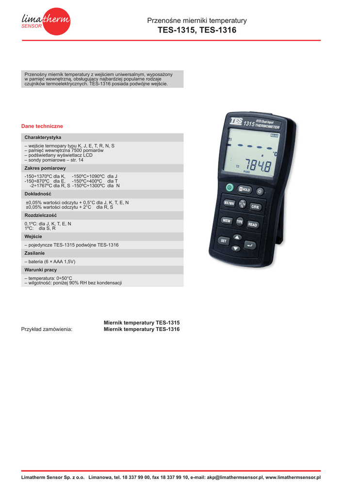 Przenośne mierniki temperatury SENSOR TES-1315, TES-1316 Przenośny miernik temperatury z wejściem uniwersalnym, wyposażony w pamięć wewnętrzną, obsługujący najbardziej popularne rodzaje czujników termoelektrycznych. TES-1316 posiada podwójne wejście. Dane techniczne Charakterystyka – wejście termopary typu K, J, E, T, R, N, S – pamięć wewnętrzna 7500 pomiarów – podświetlany wyświetlacz LCD – sondy pomiarowe – str. 14 Zakres pomiarowy -150÷1370ºC dla K, -150ºC÷1090ºC dla J -150÷870ºC dla E, -150ºC÷400ºC dla T -2÷1767ºC dla R, S -150ºC÷1300ºC dla N Dokładność ±0,05% wartości odczytu + 0,5°C dla J, K, T, E, N ±0,05% wartości odczytu + 2°C dla R, S Rozdzielczość 0,1ºC: dla J, K, T, E, N 1ºC: dla S, R Wejście – pojedyncze TES-1315 podwójne TES-1316 Zasilanie – bateria (6 × AAA 1,5V) Warunki pracy – temperatura: 0÷50°C – wilgotność: poniżej 90% RH bez kondensacji Przykład zamówienia: Miernik temperatury TES-1315 Miernik temperatury TES-1316 Limatherm Sensor Sp. z o.o. Limanowa, tel. 18 337 99 00, fax 18 337 99 10, e-mail: [email protected], www.limathermsensor.pl
