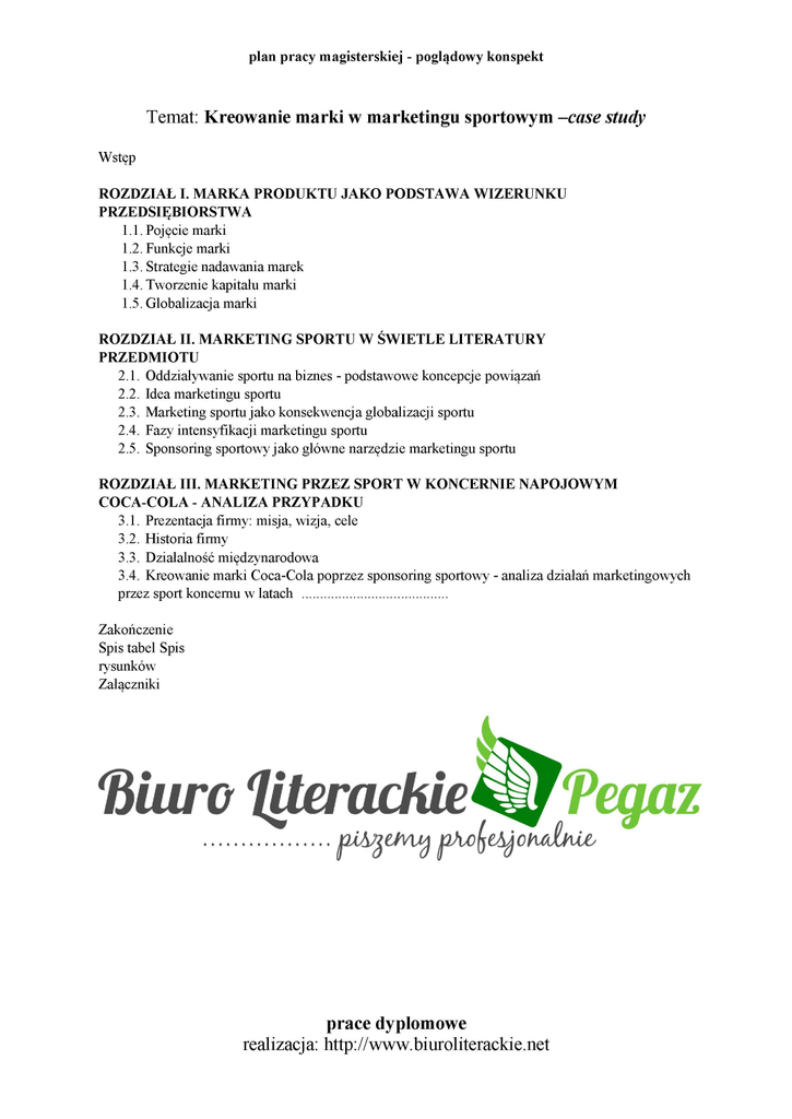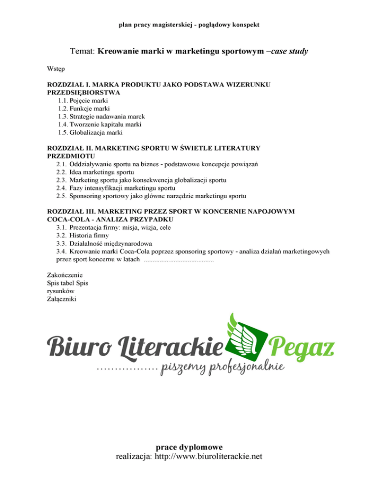 plan pracy magisterskiej - poglądowy konspekt Temat: Kreowanie marki w marketingu sportowym -case study Wstęp ROZDZIAŁ I. MARKA PRODUKTU JAKO PODSTAWA WIZERUNKU PRZEDSIĘBIORSTWA 1.1. Pojęcie marki 1.2. Funkcje marki 1.3. Strategie nadawania marek 1.4. Tworzenie kapitału marki 1.5. Globalizacja marki ROZDZIAŁ II. MARKETING SPORTU W ŚWIETLE LITERATURY PRZEDMIOTU 2.1. Oddziaływanie sportu na biznes - podstawowe koncepcje powiązań 2.2. Idea marketingu sportu 2.3. Marketing sportu jako konsekwencja globalizacji sportu 2.4. Fazy intensyfikacji marketingu sportu 2.5. Sponsoring sportowy jako główne narzędzie marketingu sportu ROZDZIAŁ III. MARKETING PRZEZ SPORT W KONCERNIE NAPOJOWYM COCA-COLA - ANALIZA PRZYPADKU 3.1. Prezentacja firmy: misja, wizja, cele 3.2. Historia firmy 3.3. Działalność międzynarodowa 3.4. Kreowanie marki Coca-Cola poprzez sponsoring sportowy - analiza działań marketingowych przez sport koncernu w latach Zakończenie Spis tabel Spis rysunków Załączniki prace dyplomowe realizacj a: http: //www.biuroliterackie. net