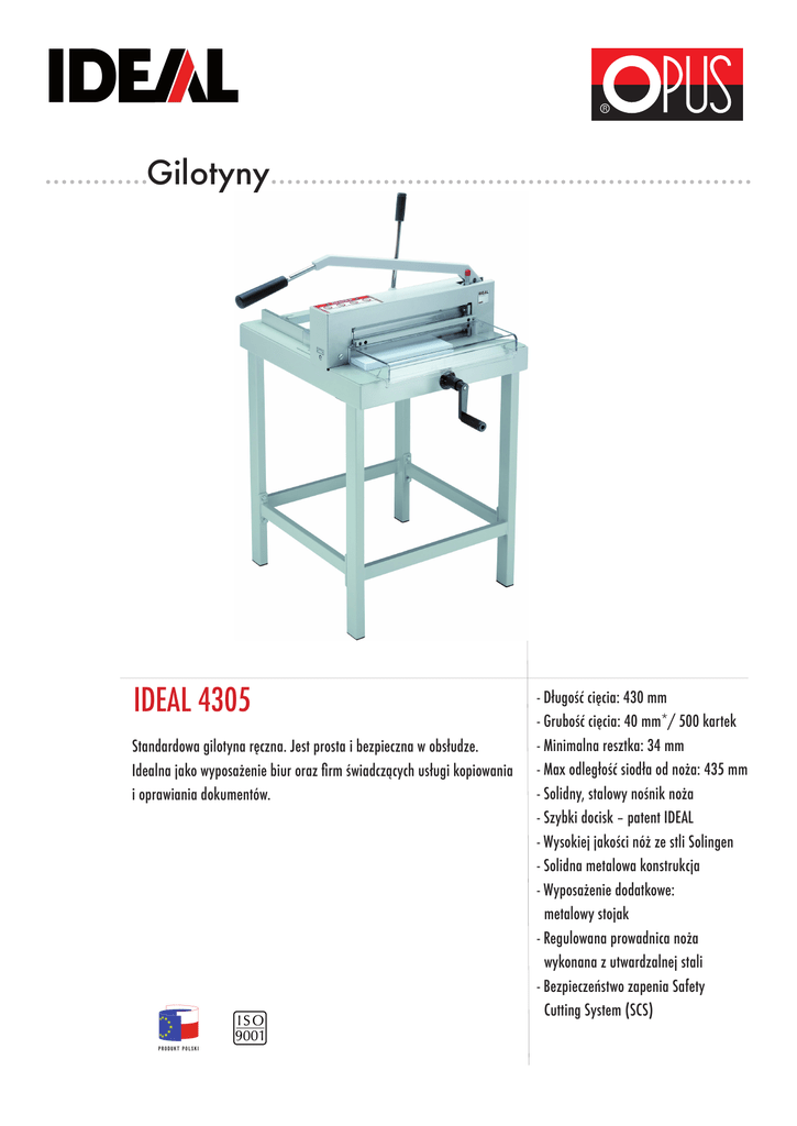 Gilotyny IDEAL 4305 Standardowa gilotyna ręczna. Jest prosta i bezpieczna w obsłudze. Idealna jako wyposażenie biur oraz firm świadczących usługi kopiowania i oprawiania dokumentów. - Długość cięcia: 430 mm - Grubość cięcia: 40 mm*/ 500 kartek - Minimalna resztka: 34 mm - Max odległość siodła od noża: 435 mm - Solidny, stalowy nośnik noża - Szybki docisk – patent IDEAL - Wysokiej jakości nóż ze stli Solingen - Solidna metalowa konstrukcja - Wyposażenie dodatkowe: metalowy stojak - Regulowana prowadnica noża wykonana z utwardzalnej stali - Bezpieczeństwo zapenia Safety Cutting System (SCS)