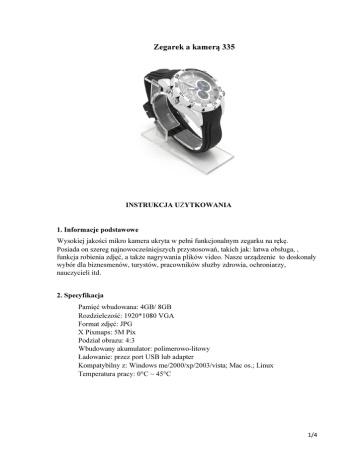 Zegarek a kamerą 335 INSTRUKCJA UŻYTKOWANIA 1. Informacje podstawowe Wysokiej jakości mikro kamera ukryta w pełni funkcjonalnym zegarku na rękę. Posiada on szereg najnowocześniejszych przystosowań, takich jak: łatwa obsługa, , funkcja robienia zdjęć, a także nagrywania plików video. Nasze urządzenie to doskonały wybór dla biznesmenów, turystów, pracowników służby zdrowia, ochroniarzy, nauczycieli itd. 2. Specyfikacja Pamięć wbudowana: 4GB/ 8GB Rozdzielczość: 1920*1080 VGA Format zdjęć: JPG X Pixmaps: 5M Pix Podział obrazu: 4:3 Wbudowany akumulator: polimerowo-litowy Ładowanie: przez port USB lub adapter Kompatybilny z: Windows me/2000/xp/2003/vista; Mac os.; Linux Temperatura pracy: 0°C ~ 45°C 1/4 3. Wygląd i funkcje 1. Tryb robienia zdjęć 2. Port USB 3. Diody IR 4. Kamera 5. Mikrofon 6. Regulacja czasu 7. Włączanie/wyłączanie, nagrywanie video 8. Wskaźnik statusu 4. Przygotowanie urządzenia Aby włączyć urządzenie naciśnij i przytrzymaj przycisk włączający/wyłączający (7) przez parę sekund. Wskaźnik statusu zapali się na niebiesko. Aby wyłączyć urządzenie naciśnij i przytrzymaj przycisk włączający/wyłączający (7) przez parę sekund. Wskaźnik statusu mignie 3 razy na czerwono i zgaśnie. 5.Ustawianie godziny Aby ustawić godzinę na zegarku delikatnie pociągnij przycisk regulacji czasu (6), zegarek przestanie działać i możliwa będzie zmiana godziny, aby ponownie uruchomić zegarek wciśnij przycisk regulacji czasu (6). 6. Ustawianie daty i czasu na nagraniach / zdjęciach - Podłącz urządzenie do komputera za pomocą kabla USB. - Utwórz na pulpicie komputera plik tekstowy ( rozszerzenie .txt ) o nazwie „time” - Otwórz plik i wpisz w pierwszej linijce datę oraz godzinę w następującym formacie: 2013-09-26 22:25:29 Y (pomiędzy datą a godziną oraz godziną i „Y” znajduje się spacja) - Zapisz plik - Skopiuj plik na urządzenie – Folder główny (kopiując plik do folderu z nagraniami nie nadpisze daty) - Odłącz urządzenie i ponownie uruchom. 2/4 - Data i godzina zostały nadpisane. 7. Nagrywanie VIDEO Uruchom urządzenie. Naciśnij przycisk nagrywania video (7) niebieska dioda wskaźnika statusu mignie 3 razy i wyłączy się. Urządzenie rozpoczęło nagrywanie. Aby je zakończyć wciśnij ponownie przycisk nagrywania (7), niebieska dioda wskaźnika statusu zapali się. 8. Czujnik ruchu Uruchom urządzenie. Przyciśnij 2 razy przycisk robienia zdjęć (1), dioda wskaźnika statusu najpierw zapali się na czerwono, a następnie czerwone i niebieskie światło mignie 3 razy. Urządzenie rozpocznie nagrywanie gdy wyczuje ruch. W momencie kiedy ruch ustanie, zegarek będzie nagrywał przez dodatkowe 10s, a następnie zapisze utworzony plik. 9. Robienie zdjęć Uruchom urządzenie. Aby wejść w tryb robienia zdjęć naciśnij przycisk 1, czerwona dioda wskaźnika statusu zapali się. Aby zrobić zdjęcie naciśnij przycisk 7. 10. Podłączanie do komputera Odkręć nakrętkę zakrywającą port USB (2), a następnie za pomocą kabla USB podłącz zegarek do komputera. Uwaga: Niekiedy ‘znalezienie’ zegarka przez komputer może chwilę potrwać. Nie wykonuj wtedy na zegarku żadnych operacji, poczekaj, aż komputer go ‘znajdzie’. Jeżeli po dłuższym czasie zegarek i komputer nie połączą się, spróbuj ponownie odłączyć i podłączyć kabel USB do komputera. 11. Ładowanie Podłącz zegarek do komputera za pomocą kabla USB lub do gniazdka przy użyciu adaptera. Powolne i lekkie świecenie wskaźnika statusu na czerwono oznacza ładowanie. Kiedy wskaźnik zapłonie na czerwono mocnym światłem, zegarek jest w pełni naładowany. Uwaga: Przy pierwszych 5 ładowaniach pozostaw zegarek podłączony do komputera 30minut dłużej. Wpłynie to korzystnie na żywotność baterii. 3/4 12. Resetowanie W razie niepoprawnego funkcjonowania urządzenia przytrzymaj jednocześnie przycisk trybu robienia zdjęć (1) i przycisk włączający (7) przez kilka sekund, urządzenie automatycznie wyłączy się. 13. Uwagi i środki ostrożności -Nie otwieraj urządzenia, gdyż spowoduje to utratę gwarancji. -Nie narażaj urządzenia na ekstremalnie niskie i wysokie temperatury. - Używaj zegarka tylko w miejscach, gdzie jest to dozwolone. -Jeśli przez dłuższy czas zegarek nie był używany, naładuj go. -Zegarka można używać w naświetlonych miejscach. -Nie korzystaj z zegarka w zakurzonych pomieszczeniach. 14. Dodatkowe informacje od sprzedawcy. Wszystkie urządzenia są okresowo modyfikowane przez producenta przez co niektóre funkcje mogą być niezgodne z przedstawioną instrukcją. Niestety nie jesteśmy informowani o wszystkich przeprowadzonych zmianach dlatego też prosimy o wyrozumiałość oraz informację jeśli jakaś zmiana zostanie wykryta podczas używania, co umożliwi nam nadpisanie instrukcji do obecnej wersji urządzenia. 4/4
