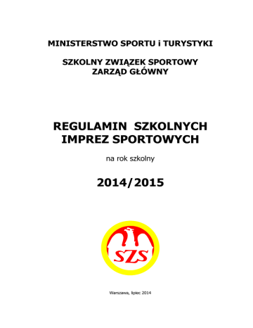 MINISTERSTWO SPORTU i TURYSTYKI SZKOLNY ZWIĄZEK SPORTOWY ZARZĄD GŁÓWNY REGULAMIN SZKOLNYCH IMPREZ SPORTOWYCH na rok szkolny 2014/2015 Warszawa, lipiec 2014 SPIS TREŚCI: 1 2 3 4 5 Do Przewodniczących Samorządów, Starostów, Prezydentów, Burmistrzów, Wójtów, Dyrektorów Szkół, Nauczycieli Wychowania Fizycznego, Rodziców, Działaczy i Uczniów strona 5 Zasady współzawodnictwa sportowego w roku szkolnym 2014/2015 – regulamin ogólny 6 Ramowy terminarz szkolnych imprez sportowych na rok szkolny 2014/2015 8 ROZPORZĄDZENIE MINISTRA ZDROWIA z dnia 29 sierpnia 2009 r. - w sprawie świadczeń gwarantowanych z zakresu podstawowej opieki zdrowotnej (Dz.U. 2009 nr 139 poz. 1138) 11 WYJAŚNIENIE ZARZĄDU GŁÓWNEGO SZKOLNEGO ZWIĄZKU SPORTOWEGO w sprawie wymaganych badań lekarskich dopuszczających młodzież szkolną do zawodów 13 www.szs.pl 2 dofinansowano ze środków Ministerstwa Sportu i Turystyki srs.szs.pl Igrzyska Młodzieży Szkolnej (13 lat i młodsi) Szkoły przystępujące do współzawodnictwa muszą się zarejestrować przez system rejestracji szkół srs.szs.pl zgodnie z kalendarzami wojewódzkimi nie później niż do 30 września 2014 roku. 1 2 3 4 5 6 7 8 9 10 11 12 13 14 15 Minikoszykówka Minisiatkówka Mini piłka ręczna Mini piłka nożna Unihokej /duże bramki/ 4-bój LA Sztafetowe biegi przełajowe Tenis stołowy Badminton Szachy Pływanie drużynowe Dwubój nowoczesny Łyżwiarstwo: - Błękitna Sztafeta - Złoty Krążek Narciarstwo biegowe Konkurs Sport w wyobraźni ucznia 16 17 18 18 19 20 21 21 22 23 23 24 24 25 26 26 G I M N A Z J AD A ( 1 4 – 1 6 L A T ) Szkoły przystępujące do współzawodnictwa muszą się zarejestrować przez system rejestracji szkół srs.szs.pl zgodnie z kalendarzami wojewódzkimi nie później niż do 30 września 2014 roku. 1 2 3 4 5 6 7 8 9 10 11 12 13 14 15 16 Koszykówka Piłka siatkowa Piłka ręczna Piłka nożna Unihokej /duże bramki/ Szkolna Liga LA Sztafetowe biegi przełajowe Tenis stołowy Badminton Szachy Ringo Pływanie drużynowe Dwubój nowoczesny Łyżwiarstwo szybkie Narciarstwo biegowe Piłka siatkowa plażowa www.szs.pl 28 29 29 30 31 31 32 32 33 33 34 34 35 35 36 36 3 dofinansowano ze środków Ministerstwa Sportu i Turystyki srs.szs.pl L I C E A L I A D A (uczniowie dziennych szkół ponadgimnazjalnych) Szkoły przystępujące do współzawodnictwa muszą się zarejestrować przez system rejestracji szkół srs.szs.pl zgodnie z kalendarzami wojewódzkimi nie później niż do 30 września 2014 roku. 1 2 3 4 5 6 7 8 9 10 11 12 13 14 Koszykówka Piłka siatkowa Piłka ręczna Piłka nożna Unihokej Liga Korespondencyjna LA Sztafetowe biegi przełajowe Tenis stołowy Badminton Szachy Pływanie drużynowe Łyżwiarstwo szybkie Narciarstwo biegowe Piłka siatkowa plażowa 38 39 39 40 41 42 43 43 44 44 45 45 45 46 W Licealiadzie pilotażowo wprowadzamy w roku szkolnym 2014/2015 zakaz udziału w rozgrywkach gier sportowych (siatkówka, koszykówka, piłka ręczna, piłka nożna)dla uczniów szkół ponadgimnazjalnych, którzy są zawodnikami posiadającymi licencje właściwych związków sportowych w swojej dyscyplinie. Wykaz Wojewódzkich SZS Tabele punktowe www.szs.pl 47 - na stronie internetowej www.szs.pl 4 dofinansowano ze środków Ministerstwa Sportu i Turystyki srs.szs.pl Szanowni Państwo: Przewodniczący Samorządów, Starostowie, Prezydenci, Burmistrzowie, Wójtowie, Dyrektorzy Szkół, Nauczyciele Wychowania Fizycznego, Rodzice, Działacze i Uczniowie. Przedstawiamy Państwu „Regulamin szkolnych imprez sportowych na rok Szkolny2014/2015", Kalendarz zawiera informacje organizacyjne i regulaminowe oraz ramowe terminy współzawodnictwa sportowego dzieci i młodzieży w trzech kategoriach wiekowych: Mistrzostwa Szkół Podstawowych - jako IGRZYSKA MŁODZIEŻY SZKOLNEJ, Mistrzostwa Szkół Gimnazjalnych - GIMNAZJADA i Mistrzostwa Szkół Ponadgimnazjalnych - LICEALIADA. Pilotażowo wprowadzamy system rejestracji szkół: srs.szs.pl, który ma pomóc i usprawnić działanie naszego systemu zawodów dla szkół. Z satysfakcją odnotowujemy, że zasięg sportowy prowadzonego w poszczególnych województwach współzawodnictwa powiększa się, o czym świadczy liczba sklasyfikowanych w systemie szkół, klubów, gmin i powiatów. W systemie tym bierze udział już około 60% szkół wszystkich szczebli. Dziękujemy wszystkim Jednostkom Samorządu Terytorialnego, które wspierają program usportowienia dzieci i młodzieży widząc w nim zarówno drogę rozwoju szczególnie uzdolnionych, jak i odpowiednią formę profilaktyki zdrowotnej. Mamy nadzieję, że również w nowym roku sprawy sportu szkolnego znajdą właściwe miejsce w budżetach samorządów. Dziękujemy również za ogromne zaangażowanie w realizację tego systemu nauczycielom wychowania fizycznego, dyrekcjom szkół, radom pedagogicznym, rodzicom. Szkolny Związek Sportowy działający w obszarze szkolnej kultury fizycznej przez wiele już lat wypracował dobry, zbieżny z interesami edukacji i wychowania program skierowany do wszystkich uczniów - dostosowany do poziomu ich potrzeb i możliwości ruchowych. Przedstawiony w kalendarzu wachlarz dyscyplin sportowych obok sprawdzianu realizacji programu wychowania fizycznego w szkole, stwarza młodzieży możliwość udziału w rywalizacji sportowej. Zróbmy wspólnie wszystko, aby każdy uczeń mógł brać systematyczny udział w atrakcyjnych zajęciach sportowych a najlepsi zyskali szansę reprezentowania swych szkół w zawodach wyższego szczebla. Każda szkolna sala gimnastyczna oraz boisko sportowe powinny być zapełnione przez rzesze uczniów uprawiających sport oraz uczestniczących w zajęciach rekreacyjno - sportowych. Zapraszamy wszystkie szkoły do udziału w zawodach sportowych organizowanych przez SZS i życzymy Państwu, a przede wszystkim dzieciom i młodzieży, udanego nowego roku szkolnego oraz sukcesów i satysfakcji z osiągniętych wyników sportowych. Szkolny Zwi