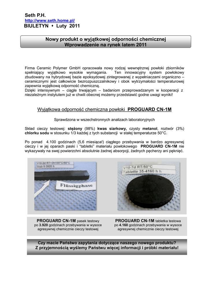 Seth P.H. http://www.seth.home.pl/ BIULETYN Luty 2011 Nowy produkt o wyjątkowej odporności chemicznej Wprowadzenie na rynek latem 2011 Firma Ceramic Polymer GmbH opracowała nowy rodzaj wewnętrznej powłoki zbiorników spełniający wyjątkowo wysokie wymagania. Ten innowacyjny system powłokowy zbudowany na hybrydowej bazie epoksydowej zintegrowanej z wypełniaczami organiczno – ceramicznymi jest całkowicie bezrozpuszczalnikowy i obok wytrzymałości temperaturowej zapewnia wyjątkową odporność chemiczną. Dzięki intensywnym – ciągle trwającym – badaniom przeprowadzanym w kooperacji z niezależnym instytutem już w chwili obecnej możemy przedstawić godne uwagi wyniki! Wyjątkowa odporność chemiczna powłoki PROGUARD CN-1M Sprawdzona w wszechstronnych analizach laboratoryjnych Skład cieczy testowej: stężony (98%) kwas siarkowy, czysty metanol, roztwór (3%) chlorku sodu w stosunku 1/3 każdej z tych substancji w stałej temperaturze 50°C. Po ponad 4.100 godzinach (5,6 miesiąca!) ciągłego przebywania w bardzo agresywnej cieczy i w jej oparach paski i “tabletki” materiału powłokowego PROGUARD CN-1M nie wykazywały na swej powierzchni absolutnie żadnej absorpcji, żadnych pęcherzy ani pęknięć. PROGUARD CN-1M pasek testowy po 3.920 godzinach przebywania w wysoce agresywnej chemicznie cieczy testowej PROGUARD CN-1M tabletka testowa po 4.160 godzinach przebywania w wysoce agresywnej chemicznie cieczy testowej Czy macie Państwo zapytania dotyczące naszego nowego produktu? Z przyjemnością wyślemy Państwu więcej informacji i próbki materiału!