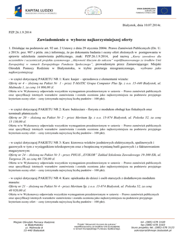 Białystok, dnia 10.07.2014r. PZP.26.1.9.2014 Zawiadomienie o wyborze najkorzystniejszej oferty 1. Działając na podstawie art. 92 ust. 2 Ustawy z dnia 29 stycznia 2004r. Prawo Zamówień Publicznych (Dz. U. z 2013r. poz. 907 z późn. zm.) informuję, że po dokonaniu badania i oceny ofert złożonych w postępowaniu w sprawie udzielenia zamówienia publicznego, znak: PZP.26.1.9.2014, pod nazwą „Kursy zawodowe dla uczestników i uczestniczek projektu systemowego „Aktywność kluczem do sukcesu” współfinansowanego ze środków Unii Europejskiej w ramach Europejskiego Funduszu Społecznego ”, prowadzonym przez Zamawiającego: Miejski Ośrodek Pomocy Rodzinie w Białymstoku, w trybie przetargu nieograniczonego, najkorzystniejszą: wybrano jako - w części dotyczącej PAKIETU NR 1: Kurs: kasjer – sprzedawca z elementami wizażu: Ofertę nr 4 – złożoną na Pakiet Nr 1 - przez T-MATIC Grupa Computer Plus Sp. z o.o. 15-440 Białystok, ul. Malmeda 1, za cenę 14 806,00 zł. Oferta w/w Wykonawcy odpowiada wszystkim wymaganiom przedstawionym w ustawie – Prawo zamówień publicznych oraz specyfikacji istotnych warunków zamówienia i została oceniona jako najkorzystniejsza na podstawie przyjętego kryterium oceny ofert – ceny (otrzymała najwyższą liczbę punktów - 100 pkt). - w części dotyczącej PAKIETU NR 2: Kurs: bukieciarz - florysta z modułem obsługi kas fiskalnych oraz terminali płatniczych: Ofertę nr 20 – złożoną na Pakiet Nr 2 - przez Meritum Sp. z o.o. 15-874 Białystok, ul. Poleska 52, za cenę 15 130,00 zł. Oferta w/w Wykonawcy odpowiada wszystkim wymaganiom przedstawionym w ustawie – Prawo zamówień publicznych oraz specyfikacji istotnych warunków zamówienia i została oceniona jako najkorzystniejsza na podstawie przyjętego kryterium oceny ofert – ceny (otrzymała najwyższą liczbę punktów - 100 pkt). - w części dotyczącej PAKIETU NR 3: Kurs: kierowca wózków jezdniowych elektrycznych, spalinowych i gazowych w tym z wysięgnikiem teleskopowym oraz z bezpieczną wymianą butli gazowych i z fakturowaniem magazynowym: Ofertę nr 24 – złożoną na Pakiet Nr 3 - przez PHUiS „EVIKOR” Zakład Szkolenia Zawodowego 19-300 Ełk, ul. Targowa 28, za cenę 66 720,00 zł. Oferta w/w Wykonawcy odpowiada wszystkim wymaganiom przedstawionym w ustawie – Prawo zamówień publicznych oraz specyfikacji istotnych warunków zamówienia i została oceniona jako najkorzystniejsza na podstawie przyjętego kryterium oceny ofert – ceny (otrzymała najwyższą liczbę punktów - 100 pkt). - w części dotyczącej PAKIETU NR 4: Kurs: opiekunka do dzieci i osób starszych z dodatkowym modułem masażu: Ofertę nr 21 – złożoną na Pakiet Nr 4 - przez Meritum Sp. z o.o. 15-874 Białystok, ul. Poleska 52, za cenę 40 920,00 zł. Oferta w/w Wykonawcy odpowiada wszystkim wymaganiom przedstawionym w ustawie – Prawo zamówień publicznych oraz specyfikacji istotnych warunków zamówienia i została oceniona jako najkorzystniejsza na podstawie przyjętego kryterium oceny ofert – ceny (otrzymała najwyższą liczbę punktów - 100 pkt). - w części dotyczącej PAKIETU NR 5: Kurs: kucharz z modułem kas fiskalnych i terminali płatniczych, cateringu i carvingu: Oferta nr 22 – złożona na Pakiet Nr 5 - przez Meritum Sp. z o.o. 15-874 Białystok, ul. Poleska 52, za cenę 20 900,00 zł. Oferta w/w Wykonawcy odpowiada wszystkim wymaganiom przedstawionym w ustawie – Prawo zamówień publicznych oraz specyfikacji istotnych warunków zamówienia i została oceniona jako najkorzystniejsza na podstawie przyjętego kryterium oceny ofert – ceny (otrzymała najwyższą liczbę punktów - 100 pkt). - w części dotyczącej PAKIETU NR 6: Kurs: księgowość komputerowa: Ofertę nr 5 – złożoną na Pakiet Nr 6 - przez T-MATIC Grupa Computer Plus Sp. z o.o. 15-440 Białystok, ul. Malmeda 1, za cenę 8 240,00 zł. Oferta w/w Wykonawcy odpowiada wszystkim wymaganiom przedstawionym w ustawie – Prawo zamówień publicznych oraz specyfikacji istotnych warunków zamówienia i została oceniona jako najkorzystniejsza na podstawie przyjętego kryterium oceny ofert – ceny (otrzymała najwyższą liczbę punktów - 100 pkt). - w części dotyczącej PAKIETU NR 7: Kurs: pracownik ogólnobudowlany: Ofertę nr 2/2– złożoną na Pakiet Nr 7- przez ANTIDOTUM Beata Obrycka 15-213 Białystok, ul. Mickiewicza 7 m 4, za cenę 13 300,00 zł. Oferta w/w Wykonawcy odpowiada wszystkim wymaganiom przedstawionym w ustawie – Prawo zamówień publicznych oraz specyfikacji istotnych warunków zamówienia i została oceniona jako najkorzystniejsza na podstawie przyjętego kryterium oceny ofert – ceny (otrzymała najwyższą liczbę punktów - 100 pkt). - w części dotyczącej PAKIETU NR 8: Kurs: brukarz: Ofertę nr 2/1– złożoną na Pakiet Nr 8 - przez ANTIDOTUM Beata Obrycka 15-213 Białystok, ul. Mickiewicza 7 m 4, za cenę 9 300,00 zł. Oferta w/w Wykonawcy odpowiada wszystkim wymaganiom przedstawionym w ustawie – Prawo zamówień publicznych oraz specyfikacji istotnych warunków zamówienia i została oceniona jako najkorzystniejsza na podstawie przyjętego kryterium oceny ofert – ceny (otrzymała najwyższą liczbę punktów - 100 pkt). 2. Streszczenie oceny i porównania złożonych ofert. Informacja o ilości punktów przyznanych ofertom podlegającym ocenie. Ocena ofert: Kryteria oceny i ich znaczenie: cena – waga 100%. Informuję, iż w wyniku badania i oceny ofert złożonych w przedmiotowym postępowaniu ofertom niepodlegającym odrzuceniu przyznano następującą punktację: PAKIET NR 1: Firma (nazwa) lub nazwisko oraz adres Wykonawcy T-MATIC Grupa Computer Plus Sp. z o.o. 15-440 Białystok, ul. Malmeda 1 Liczba punktów w kryterium cena 100,00 pkt Centrum Informatyki „ZETO” S.A. 15-048 Białystok, ul. Skorupska 9 62,45 pkt Towarzystwo Wiedzy Powszechnej Odział Regionalny 15-063 Białystok, ul. Warszawska 2 Zakład Doskonalenia Zawodowego 15-365 Bia