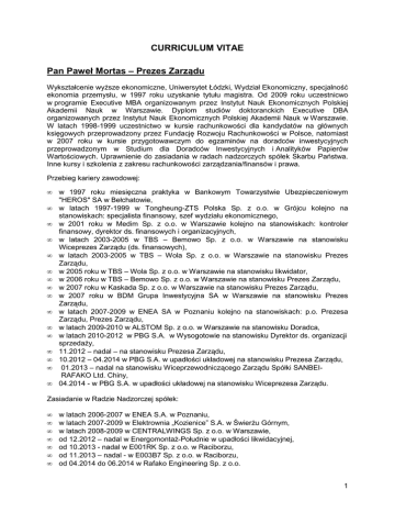 CURRICULUM VITAE Pan Paweł Mortas – Prezes Zarządu Wykształcenie wyższe ekonomiczne, Uniwersytet Łódzki, Wydział Ekonomiczny, specjalność ekonomia przemysłu, w 1997 roku uzyskanie tytułu magistra. Od 2009 roku uczestnicwo w programie Executive MBA organizowanym przez Instytut Nauk Ekonomicznych Polskiej Akademii Nauk w Warszawie. Dyplom studiów doktoranckich Executive DBA organizowanych przez Instytut Nauk Ekonomicznych Polskiej Akademii Nauk w Warszawie. W latach 1998-1999 uczestnictwo w kursie rachunkowości dla kandydatów na głównych księgowych przeprowadzony przez Fundację Rozwoju Rachunkowości w Polsce, natomiast w 2007 roku w kursie przygotowawczym do egzaminów na doradców inwestycyjnych przeprowadzonym w Studium dla Doradców Inwestycyjnych i Analityków Papierów Wartościowych. Uprawnienie do zasiadania w radach nadzorczych spółek Skarbu Państwa. Inne kursy i szkolenia z zakresu rachunkowości zarządzania/finansów i prawa. Przebieg kariery zawodowej: • • • • • • • • • • • • • • • • w 1997 roku miesięczna praktyka w Bankowym Towarzystwie Ubezpieczeniowym "HEROS" SA w Bełchatowie, w latach 1997-1999 w Tongheung-ZTS Polska Sp. z o.o. w Grójcu kolejno na stanowiskach: specjalista finansowy, szef wydziału ekonomicznego, w 2001 roku w Medim Sp. z o.o. w Warszawie kolejno na stanowiskach: kontroler finansowy, dyrektor ds. finansowych i organizacyjnych, w latach 2003-2005 w TBS – Bemowo Sp. z o.o. w Warszawie na stanowisku Wiceprezes Zarządu (ds. finansowych), w latach 2003-2005 w TBS – Wola Sp. z o.o. w Warszawie na stanowisku Prezes Zarządu, w 2005 roku w TBS – Wola Sp. z o.o. w Warszawie na stanowisku likwidator, w 2006 roku w TBS – Bemowo Sp. z o.o. w Warszawie na stanowisku Prezes Zarządu, w 2007 roku w Kaskada Sp. z o.o. w Warszawie na stanowisku Prezes Zarządu, w 2007 roku w BDM Grupa Inwestycyjna SA w Warszawie na stanowisku Prezes Zarządu, w latach 2007-2009 w ENEA SA w Poznaniu kolejno na stanowiskach: p.o. Prezesa Zarządu, Prezes Zarządu, w latach 2009-2010 w ALSTOM Sp. z o.o. w Warszawie na stanowisku Doradca, w latach 2010-2012 w PBG S.A. w Wysogotowie na stanowisku Dyrektor ds. organizacji sprzedaży, 11.2012 – nadal – na stanowisku Prezesa Zarządu, 10.2012 – 04.2014 w PBG S.A. w upadłości układowej na stanowisku Prezesa Zarządu, 01.2013 – nadal na stanowisku Wiceprzewodniczącego Zarządu Spółki SANBEIRAFAKO Ltd. Chiny, 04.2014 - w PBG S.A. w upadłości układowej na stanowisku Wiceprezesa Zarządu. Zasiadanie w Radzie Nadzorczej spółek: • • • • • • • w latach 2006-2007 w ENEA S.A. w Poznaniu, w latach 2007-2009 w Elektrownia „Kozienice” S.A. w Świerżu Górnym, w latach 2008-2009 w CENTRALWINGS Sp. z o.o. w Warszawie, od 12.2012 – nadal w Energomontaż-Południe w upadłości likwidacyjnej, od 10.2013 - nadal w E001RK Sp. z o.o. w Raciborzu, od 11.2013 – nadal - w E003B7 Sp. z o.o. w Raciborzu, od 04.2014 do 06.2014 w Rafako Engineering Sp. z o.o. 1