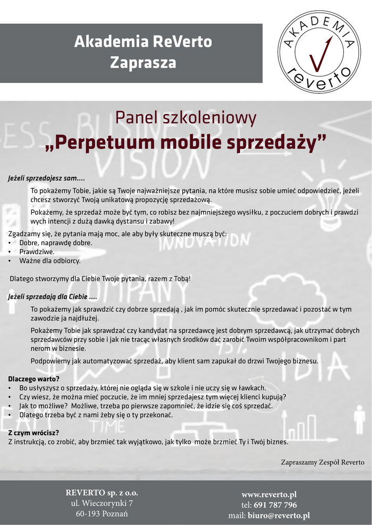 ert o AK r ev IA Akademia ReVerto Zaprasza ADEM Panel szkoleniowy „Perpetuum mobile sprzedaży” Jeżeli sprzedajesz sam…. To pokażemy Tobie, jakie są Twoje najważniejsze pytania, na które musisz sobie umieć odpowiedzieć, jeżeli chcesz stworzyć Twoją unikatową propozycję sprzedażową. Pokażemy, że sprzedaż może być tym, co robisz bez najmniejszego wysiłku, z poczuciem dobrych i prawdzi wych intencji z dużą dawką dystansu i zabawy! Zgadzamy się, że pytania mają moc, ale aby były skuteczne muszą być: • Dobre, naprawdę dobre. • Prawdziwe. • Ważne dla odbiorcy. Dlatego stworzymy dla Ciebie Twoje pytania, razem z Tobą! Jeżeli sprzedają dla Ciebie …. To pokażemy jak sprawdzić czy dobrze sprzedają , jak im pomóc skutecznie sprzedawać i pozostać w tym zawodzie ja najdłużej. Pokażemy Tobie jak sprawdzać czy kandydat na sprzedawcę jest dobrym sprzedawcą, jak utrzymać dobrych sprzedawców przy sobie i jak nie tracąc własnych środków dać zarobić Twoim współpracownikom i part nerom w biznesie. Podpowiemy jak automatyzować sprzedaż, aby klient sam zapukał do drzwi Twojego biznesu. Dlaczego warto? • Bo usłyszysz o sprzedaży, której nie ogląda się w szkole i nie uczy się w ławkach. • Czy wiesz, że można mieć poczucie, że im mniej sprzedajesz tym więcej klienci kupują? • Jak to możliwe? Możliwe, trzeba po pierwsze zapomnieć, że idzie się coś sprzedać. • Dlatego trzeba być z nami żeby się o ty przekonać. Z czym wrócisz? Z instrukcją, co zrobić, aby brzmieć tak wyjątkowo, jak tylko może brzmieć Ty i Twój biznes. Zapraszamy Zespół Reverto REVERTO sp. z o.o. ul. Wieczorynki 7 60-193 Poznań www.reverto.pl tel: 691 787 796 mail: [email protected]