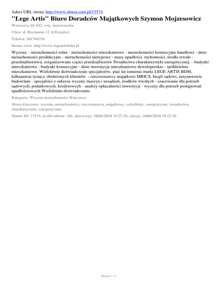 Adres URL strony http://www.ebaza.com.pl/15574 "Lege Artis" Biuro Doradców Majątkowych Szymon Mojzesowicz Warszawa, 01-842, woj. mazowieckie Ulica: al. Reymonta 12 A(II piętro) Telefon: 501766336 Strona www: http://www.legeartisbdm.pl Wycena: - nieruchomości rolne - nieruchomości mieszkaniowe - nieruchomości komercyjne handlowe - duże nieruchomości produkcyjne - nieruchomości nietypowe - masy upadłości, ruchomości, środki trwałe przedsiębiorstwa, zorganizowane części przedsiębiorstw Świadectwa charakterystyki energetycznej: - budynki mieszkaniowe - budynki komercyjne - duże inwestycje mieszkaniowe deweloperskie - spółdzielnie mieszkaniowe. Wieloletnie doświadczenie specjalistów, pięć lat istnienia marki LEGE ARTIS BDM, kilkanaście tysięcy obsłużonych klientów. - rzeczoznawcy majątkowi MRICS, biegli sądowi, inżynierowie budowlani - specjaliści z zakresu wyceny maszyn i urządzeń, środków trwałych - szacowanie dla potrzeb sądowych, podatkowych, kredytowych - analizy opłacalności inwestycji - wyceny dla potrzeb postępowań upadłościowych Wieloletnie doświadczenie. Kategorie: Wycena nieruchomości Warszawa Słowa kluczowe: wycena, nieruchomości, rzeczoznawca, majątkowy, certyfikaty, energetyczne, świadectwa, charakterystyki, energetycznej Numer ID: 15574, liczba odsłon: 104, aktywacja: 10/04/2010 19:25:26, edycja: 10/04/2010 19:25:26 Strona 1 / 1