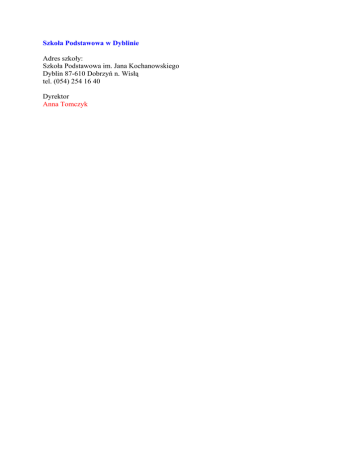 Szkoła Podstawowa w Dyblinie Adres szkoły: Szkoła Podstawowa im. Jana Kochanowskiego Dyblin 87-610 Dobrzyń n. Wisłą tel. (054) 254 16 40 Dyrektor Anna Tomczyk