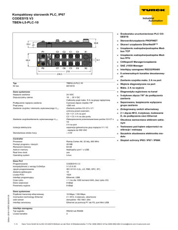 Kompaktowy sterownik PLC, IP67 CODESYS V3 TBEN-L5-PLC-10 ■ Środowisko uruchomieniowe PLC CODESYS ■ Sterownik/urządzenie PROFINET ■ Skaner/ urządzenie EtherNet/IP™ ■ Urządzenie nadrzędne/podrzędne Modbus TCP ■ Urządzenie nadrzędne/podrzędne Modbus RTU ■ CANopen® Manager/urządzenie ■ SAE J1939 Manager ■ Interfejsy szeregowe RS232/RS485 ■ 8 uniwersalnych kanałów dwustanowych ■ Zasilanie czujnika maks. 2 A na port Typ Nr kat. TBEN-L5-PLC-10 6814018 Dane systemowe Napięcie zasilania Dopuszczalny zakres Standardowa strata mocy Controller Processor Pamięć programu i danych Remanent memory Add-on memory Real time clock Operating system Ramię Cortex A8, 32 bity, 800 MHz 20 MB 64 kB Nadrzędny port 1 x USB yes Linux Dane PLC Programowanie kompatybilność z wersją CoDeSys Języki programowania Zadania aplikacyjne Liczba POU Interfejs programujący Czas cyklu Dane wejściowe Parametry wyjścia CODESYS V.3 V 3.5.9.30 IEC 61131-3 (IL, LD, FBD, SFC, ST) 10 1024 Ethernet, USB < 1 ms dla 1000 komend AWL (bez cyklu I/O) 8 kBajt 8 kBajt Dane systemowe Prędkość transmisji ethernetowej Connection technology Ethernet web serwer Interfejs serwisowy 10 Mbps / 100 Mbps 2 × M12, 4-stykowe, odwrócone domyślnie: 192.168.1.254 Ethernet za pomocą P1 lub P2, port Mini USB Interfejs szeregowy Typ sygnału Liczba kanałów RS232 lub RS485 2 Zasilanie czujnika/elementu wykonawczego VAUX2 Edition • 2016-11-09T21:56:53+01:00 Izolacja elektryczna 1/6 ■ Maks. 2 A na wyjście ■ Diagnostyka wyjściowa na kanał 24 VDC 18 … 30 V DC Całkowity prąd maks. 9 A na grupę napięciową 5-pinowe złącze męskie 7/8" <280 mA Zasilanie portów C0–C3 z V1 ochrona przed zwarciem, C0 + C1: 2 A na port C2 + C3: 4 A na oba porty Zabezpieczenie przeciwzwarciowe portów C4-C7 z V2 2 A na port separacja galwaniczna grup napięcia V1 i V2 , napięcia do 500 VAC ð5W Podłączenie napięcia zasilania Prąd pracy Zasilanie czujnika / elementu wykonawczego VAUX1 ■ Wejście diagnostyczne na port ■ 5-stykowe złącza 7/8" do podłączenia zasilania ■ Separowana, bezpiecznie wyłączana grupa zasilania ■ Zintegrowany switch ethernetowy ■ 2 × złącze M12, 4-stykowe, kodowanie D, do podłączenia sieci Ethernet ■ Obudowa wzmacniana włóknem szklanym ■ Testowane pod kątem odporności na wibracje i wstrząsy ■ Szczelnie obudowana elektronika modułu ■ Stopień ochrony IP65 / IP67 / IP69K Hans Turck GmbH & Co.KG ñ D-45472 Mülheim an der Ruhr ñ Witzlebenstraße 7 ñ Tel. 0208 4952-0 ñ Fax 0208 4952-264 ñ [email protected] ñ www.turck.com Kompaktowy sterownik PLC, IP67 CODESYS V3 TBEN-L5-PLC-10 Tryb pracy RS232 Sygnał niskiego poziomu Sygnał wysokiego poziomu Sygnały transmisji Prędkość transmisji Typ transmisji Długość przewodu Tryb pracy RS485 Sygnały transmisji Prędkość transmisji Typ transmisji Rezystor terminujący Bias Impedancja linii Digital inputs Liczba kanałów Connectivity inputs Input type Type of input diagnostics Próg przełączania Sygnał napięciowy niskiego poziomu Sygnał napięciowy wysokiego poziomu Sygnał prądowy niskiego poziomu Sygnał prądowy wysokiego poziomu Zasilanie czujników Izolacja elektryczna Digital outputs Liczba kanałów Connection Technology Outputs Output type Type of output diagnostics Napięcie wyjścia Prąd wyjściowy na kanał Współczynnik równoczesności Typ obciążenia Zabezpieczenie przed zwarciem Zasilanie obiektowe Izolacja elektryczna Zgodność z normą/dyrektywą Test wibracyjny TX/RX+, TX/RX9600 do 230400 bps 2-przewodowy połowiczny dupleks Wewnętrzny lub zewnętrzny Wewnętrzny lub zewnętrzny 120 ò 8 M12, 5-stykowe PNP channel diagnostics EN 61131-2 Typ 3, PNP <5V > 11 V < 1,5 mA > 2 mA 2 A, ochrona przed zwarciem, z V2 separacja galwaniczna P1/P2, napięcie do 500 VDC 8 M12, 5-pol PNP channel diagnostics 24 V DC z V2 2,0 A, zabezpieczenie przeciwzwarciowe, maks. 4,0 A na port 0,56 obciążenie rezystancyjne, indukcyjne, lampowe tak 2 A, ochrona przed zwarciem, z V2 separacja galwaniczna P1/P2, napięcie do 500 VDC przyspieszenie do 20 g zgodnie z EN 60068-2-6 zgodnie z EN 60068-2-27 zgodnie z EN 60068-2-31/IEC 60068-2-32 zgodnie z EN 61131-2 Edition • 2016-11-09T21:56:53+01:00 Test przeciążeniowy/wstrząsowy Spadek i powrót Kompatybilność elektromagnetyczna -18 do -3 V DC 3 do 18 V DC T×D, R×D 9600 do 230400 bps Pełny dupleks 15 m przy pr. 19200 bodów (maks. pojemność linii < 2000 pF) 2/6 Hans Turck GmbH & Co.KG ñ D-45472 Mülheim an der Ruhr ñ Witzlebenstraße 7 ñ Tel. 0208 4952-0 ñ Fax 0208 4952-264 ñ [email protected] ñ www.turck.com Kompaktowy sterownik PLC, IP67 CODESYS V3 TBEN-L5-PLC-10 Dane systemowe Dimensions (W x L x H) Temperatura pracy Temperatura składowania Altitude Klasa ochrony Edition • 2016-11-09T21:56:53+01:00 MTTF materiał obudowy Kolor obudowy Window material Materiał śrub Materiał etykiety Halogen-free Montaż 60.4 x 230.4 x 39mm -40…+70 °C -40…+85°C max.5000 m IP65 IP67 IP69K 75 rok/lata zgodnie z SN 29500 (Ed. 99) 20 °C PA6-GF30 czarny Lexan Stal nierdzewna 303 Poliwęglan yes 2 otwory montażowe � 6,3 mm 3/6 Hans Turck GmbH & Co.KG ñ D-45472 Mülheim an der Ruhr ñ Witzlebenstraße 7 ñ Tel. 0208 4952-0 ñ Fax 0208 4952-264 ñ [email protected] ñ www.turck.com Kompaktowy sterownik PLC, IP67 CODESYS V3 TBEN-L5-PLC-10 Porty Ethernet M12 x 1 Ethernet Przewód Ethernet (przykład): RSSD-RSSD-4414-2M (nr kat. 6441405) Interfejs CAN We CAN Przewód CAN (przykład): RSC-RKC5701-2M (nr kat. 6604833) Rezystor terminujący CAN (przykłady): Złącze żeńskie RKE57-TR2 (nr kat. 6602629) Złącze męskie: RSE57-TR2 (nr kat. 6602308) Wy CAN Interfejsy szeregowe Konfiguracja pinów w trybie RS232 Przewód (przykład): RK4.5T-2-RS4.5T/S2503 (nr kat. 7030331) Konfiguracja styków w trybie pracy RS485 Wejścia i wyjścia dwustanowe Złącze I/O M12 x 1 Przewód elementu wykonawczego i czujnika/przewód PUR (przykład): RKC4.4T-2-RSC4.4T/TXL (nr 