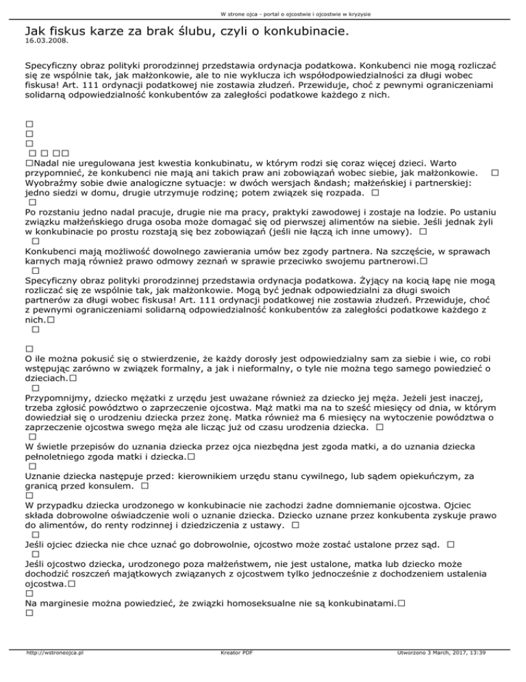 W strone ojca - portal o ojcostwie i ojcostwie w kryzysie Jak fiskus karze za brak ślubu, czyli o konkubinacie. 16.03.2008. Specyficzny obraz polityki prorodzinnej przedstawia ordynacja podatkowa. Konkubenci nie mogą rozliczać się ze wspólnie tak, jak małżonkowie, ale to nie wyklucza ich współodpowiedzialności za długi wobec fiskusa! Art. 111 ordynacji podatkowej nie zostawia złudzeń. Przewiduje, choć z pewnymi ograniczeniami solidarną odpowiedzialność konkubentów za zaległości podatkowe każdego z nich. Nadal nie uregulowana jest kwestia konkubinatu, w którym rodzi się coraz więcej dzieci. Warto przypomnieć, że konkubenci nie mają ani takich praw ani zobowiązań wobec siebie, jak małżonkowie. Wyobraźmy sobie dwie analogiczne sytuacje: w dwóch wersjach – małżeńskiej i partnerskiej: jedno siedzi w domu, drugie utrzymuje rodzinę; potem związek się rozpada. Po rozstaniu jedno nadal pracuje, drugie nie ma pracy, praktyki zawodowej i zostaje na lodzie. Po ustaniu związku małżeńskiego druga osoba może domagać się od pierwszej alimentów na siebie. Jeśli jednak żyli w konkubinacie po prostu rozstają się bez zobowiązań (jeśli nie łączą ich inne umowy). Konkubenci mają możliwość dowolnego zawierania umów bez zgody partnera. Na szczęście, w sprawach karnych mają również prawo odmowy zeznań w sprawie przeciwko swojemu partnerowi. Specyficzny obraz polityki prorodzinnej przedstawia ordynacja podatkowa. Żyjący na kocią łapę nie mogą rozliczać się ze wspólnie tak, jak małżonkowie. Mogą być jednak odpowiedzialni za długi swoich partnerów za długi wobec fiskusa! Art. 111 ordynacji podatkowej nie zostawia złudzeń. Przewiduje, choć z pewnymi ograniczeniami solidarną odpowiedzialność konkubentów za zaległości podatkowe każdego z nich. O ile można pokusić się o stwierdzenie, że każdy dorosły jest odpowiedzialny sam za siebie i wie, co robi wstępując zarówno w związek formalny, a jak i nieformalny, o tyle nie można tego samego powiedzieć o dzieciach. Przypomnijmy, dziecko mężatki z urzędu jest uważane również za dziecko jej męża. Jeżeli jest inaczej, trzeba zgłosić powództwo o zaprzeczenie ojcostwa. Mąż matki ma na to sześć miesięcy od dnia, w którym dowiedział się o urodzeniu dziecka przez żonę. Matka również ma 6 miesięcy na wytoczenie powództwa o zaprzeczenie ojcostwa swego męża ale licząc już od czasu urodzenia dziecka. W świetle przepisów do uznania dziecka przez ojca niezbędna jest zgoda matki, a do uznania dziecka pełnoletniego zgoda matki i dziecka. Uznanie dziecka następuje przed: kierownikiem urzędu stanu cywilnego, lub sądem opiekuńczym, za granicą przed konsulem. W przypadku dziecka urodzonego w konkubinacie nie zachodzi żadne domniemanie ojcostwa. Ojciec składa dobrowolne oświadczenie woli o uznanie dziecka. Dziecko uznane przez konkubenta zyskuje prawo do alimentów, do renty rodzinnej i dziedziczenia z ustawy. Jeśli ojciec dziecka nie chce uznać go dobrowolnie, ojcostwo może zostać ustalone przez sąd. Jeśli ojcostwo dziecka, urodzonego poza małżeństwem, nie jest ustalone, matka lub dziecko może dochodzić roszczeń majątkowych związanych z ojcostwem tylko jednocześnie z dochodzeniem ustalenia ojcostwa. Na marginesie można powiedzieć, że związki homoseksualne nie są konkubinatami. http://wstroneojca.pl Kreator PDF Utworzono 3 March, 2017, 13:39