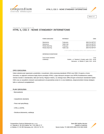 Szkolenie Compendium CE HTML 5, CSS 3 - NOWE STANDARDY INTERNETOWE Strona 1 z 6 Szkolenie: Compendium CE HTML 5, CSS 3 - NOWE STANDARDY INTERNETOWE FORMA SZKOLENIA MATERIAŁY CENA Stacjonarne Tradycyjne 2800 PLN NETTO* Stacjonarne Tablet ctab 3200 PLN NETTO* Metoda dlearning Tradycyjne 2800 PLN NETTO* Metoda dlearning Tablet ctab 2800 PLN NETTO* *(+VAT zgodnie z obowiązującą stawką w dniu wystawienia faktury) INFORMACJE DODATKOWE Czas trwania szkolenia Lokalizacje 3 dni Kraków - ul. Tatarska 5, II piętro, godz. 9:00 - 16:00 Warszawa - ul. Bielska 17, godz. 9:00 - 16:00 OPIS SZKOLENIA Celem szkolenia jest zapoznanie uczestników z nowościami, które przynoszą standardy HTML5 oraz CSS3. W oparciu o liczne ćwiczenia, na zajęciach omówione będą różnice pomiędzy HTML5, a jego starszymi wersjami oraz XHTML.Przedstawione zostaną również nowości w standaradzie, takie jak Canvas, Magazyn lokalny, czy obsługa trybu offline.Drugim omówionym standardem będzie CSS3 wraz ze wszystkimi zmianami wprowadzonymi od poprzedniej wersji (2.1) oraz dodatkowe, eksperymentalne funkcje dostępne tylko w wybranych przeglądarkach. PLAN SZKOLENIA - Wprowadzenie - Uzasadnienie standardu - Prace nad specyfikacją - HTML vs XHTML - Struktura dokumentu, walidacja Compendium Centrum Edukacyjne sp. z o.o. ul. Tatarska 5, 30-103 Kraków, tel.: (12) 298 47 77 ul. Bielska 17, 02-394 Warszawa, tel.: (22) 417 41 70 Bank BPH Spółka Akcyjna Oddział w Krakowie Numer konta: 74 1060 0076 0000 3210 0022 6028 Szkolenie Compendium CE HTML 5, CSS 3 - NOWE STANDARDY INTERNETOWE Strona 2 z 6 - DOCTYPE vs MIME - Przyszłość - Oprogramowanie - 1. Przeglądarki - Wsparcie - Wykrywanie obsługi, Modernizr - Błędy - 2. Edytory - Aptana Studio - CoffeeCup - DOM - Nagłówki, kodowanie - Linki, relacje - Nowe elementy - Microdata - Formularze Compendium Centrum Edukacyjne sp. z o.o. ul. Tatarska 5, 30-103 Kraków, tel.: (12) 298 47 77 ul. Bielska 17, 02-394 Warszawa, tel.: (22) 417 41 70 Bank BPH Spółka Akcyjna Oddział w Krakowie Numer konta: 74 1060 0076 0000 3210 0022 6028 Szkolenie Compendium CE HTML 5, CSS 3 - NOWE STANDARDY INTERNETOWE Strona 3 z 6 - Nowe elementy - Nowe atrybuty - Walidacja - File API - Wskazanie plików - Odczyt - Monitorowanie postępu - Magazyn lokalny - Magazyn vs ciastka (cookies) - Zapis, czytanie - Zapytania SQL - Tryb offline - Manifest - Obsługa - Historia - symulowana nawigacja Compendium Centrum Edukacyjne sp. z o.o. ul. Tatarska 5, 30-103 Kraków, tel.: (12) 298 47 77 ul. Bielska 17, 02-394 Warszawa, tel.: (22) 417 41 70 Bank BPH Spółka Akcyjna Oddział w Krakowie Numer konta: 74 1060 0076 0000 3210 0022 6028 Szkolenie Compendium CE HTML 5, CSS 3 - NOWE STANDARDY INTERNETOWE Strona 4 z 6 - Canvas - Kształy podstawowe - Tekst - Obrazy - Cheat Sheet - Audio, Video - Wsparcie, formaty - Manipulacja, odwtarzanie - Geolokalizacja - Drag and drop - Zdarzenia - Problemy - Kompatybilność - CSS3 - Selektory Compendium Centrum Edukacyjne sp. z o.o. ul. Tatarska 5, 30-103 Kraków, tel.: (12) 298 47 77 ul. Bielska 17, 02-394 Warszawa, tel.: (22) 417 41 70 Bank BPH Spółka Akcyjna Oddział w Krakowie Numer konta: 74 1060 0076 0000 3210 0022 6028 Szkolenie Compendium CE HTML 5, CSS 3 - NOWE STANDARDY INTERNETOWE Strona 5 z 6 - Pseudoklasy - Style i właściwości - Animacje, transformacje - Osadzanie fontów - Kompatybilność - Dodatkowa funkcjonalność - Przydatne strony - Co dalej? - Podsumowanie WYMAGANIA DLA UCZESTNIKA Umiejętność: - dobra znajomość języka HTML do wersji 4 i/lub XHTML oraz CSS do 2.1. - biegłość w projektowaniu stron internetowych, pisaniu kodu bez użycia edytorów WYSIWYG - znajomość JavaScript na poziomie co najmniej średnim. Wymaganą wiedzę i umiejętności można zdobyć na szkoleniach: - Site Development Associate - Web Design Specialist - JavaScript Specialist Compendium Centrum Edukacyjne sp. z o.o. ul. Tatarska 5, 30-103 Kraków, tel.: (12) 298 47 77 ul. Bielska 17, 02-394 Warszawa, tel.: (22) 417 41 70 Bank BPH Spółka Akcyjna Oddział w Krakowie Numer konta: 74 1060 0076 0000 3210 0022 6028 Szkolenie Compendium CE HTML 5, CSS 3 - NOWE STANDARDY INTERNETOWE Strona 6 z 6 CERTYFIKATY Uczestnicy szkolenia otrzymują certyfikat wystawiony imiennie oraz na firmę, sygnowany przez Compendium Centrum Edukacyjne. PROWADZĄCY Wykładowca Compendium Centrum Edukacyjnego. Compendium Centrum Edukacyjne sp. z o.o. ul. Tatarska 5, 30-103 Kraków, tel.: (12) 298 47 77 ul. Bielska 17, 02-394 Warszawa, tel.: (22) 417 41 70 Bank BPH Spółka Akcyjna Oddział w Krakowie Numer konta: 74 1060 0076 0000 3210 0022 6028