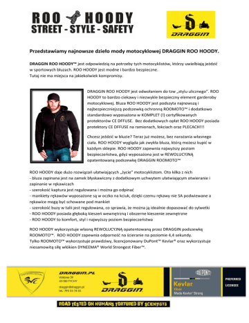 Przedstawiamy najnowsze dzieło mody motocyklowej DRAGGIN ROO HOODY. DRAGGIN ROO HOODY™ jest odpowiedzią na potrzeby tych motocyklistów, którzy uwielbiają jeździć w sportowych bluzach. ROO HOODY jest modne i bardzo bezpieczne. Tutaj nie ma miejsca na jakiekolwiek kompromisy. DRAGGIN ROO HOODY jest odwołaniem do tzw „stylu ulicznego”. ROO HOODY to bardzo ciekawy i niezwykle bezpieczny element garderoby HOODY motocyklowej. Bluza ROO HOODY jest podszyta najnowszą i najbezpieczniejszą podszewką ochronną ROOMOTO™ ROOMOTO i dodatkowo standardowo wyposażona w KOMPLET (!) certyfikowanych protektorów CE DFFUSE. Bez dodatkowych opłat ROO HOODY posiada protektory CE DFFUSE na ramionach, łokciach oraz PLECACH!!! Chcesz jeździć w bluzie? Teraz już możesz, bez narażania własnego ciała. ROO HOODY wygląda jak zwykła bluza, bluza, którą możesz kupić w każdym sklepie. ROO HOODY zapewnia najwyższy poziom bezpieczeństwa, gdyż wyposażona jest w REWOLUCYJNĄ opatentowaną podszewkę DRAGGIN ROOMOTO™ ROOMOTO™ ROO HOODY daje dużo rozwiązań ułatwiających „życie” motocyklistom. Oto kilka z nich - bluza zapinana jest na zamek błyskawiczny z dodatkowym uchwytem ułatwiającym otwieranie i zapinanie w rękawicach - szerokość kaptura jest regulowana i można go odpinać - mankiety rękawów wyposażone są w oczko na kciuk, dzięki czemu rękawy nie SA podwiewane a rękawice mogą być schowane howane pod mankiet - szerokość buzy w talii jest regulowana, co sprawia, że można ją idealnie dopasować do sylwetki - ROO HOODY posiada głęboką kieszeń wewnętrzną i obszerne kieszenie zewnętrzne - ROO HOODY to komfort, styl i najwyższy poziom bezpieczeństwa bezpieczeństw ROO HOODY wykorzystuje własną REWOLUCYJNĄ opatentowaną przez DRAGGIN podszewkę ROOMOTO™. ROO HOODY zapewnia odporność na ścieranie na poziomie 4,4 sekundy. Tylko ROOMOTO™ wykorzystuje prawdziwy, licencjonowany DuPont™ Kevlar® oraz wykorzystuje niesamowitą siłę włókien DYNEEMA® DYNEEMA World Strongest Fiber™.