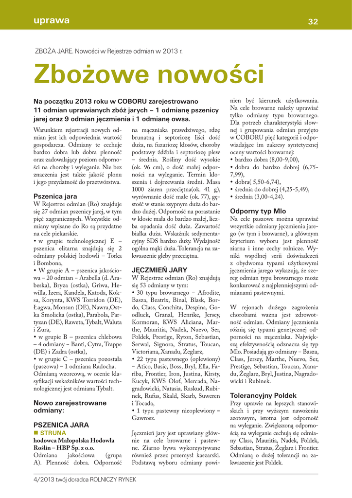 uprawa 32 ZBOŻA JARE. Nowości w Rejestrze odmian w 2013 r. Zbożowe nowości Na początku 2013 roku w COBORU zarejestrowano 11 odmian uprawianych zbóż jarych – 1 odmianę pszenicy jarej oraz 9 odmian jęczmienia i 1 odmianę owsa. Warunkiem rejestracji nowych odmian jest ich odpowiednia wartość gospodarcza. Odmiany te cechuje bardzo dobra lub dobra plenność oraz zadowalający poziom odporności na choroby i wyleganie. Nie bez znaczenia jest także jakość plonu i jego przydatność do przetwórstwa. Pszenica jara W Rejestrze odmian (Ro) znajduje się 27 odmian pszenicy jarej, w tym pięć zagranicznych. Wszystkie odmiany wpisane do Ro są przydatne na cele piekarskie. w grupie technologicznej E – pszenica elitarna znajdują się 2 odmiany polskiej hodowli – Torka i Bombona, W grupie A – pszenica jakościowa – 20 odmian ‒ Arabella (d. Arabeska), Bryza (ostka), Griwa, Hewilla, Izera, Kandela, Katoda, Koksa, Korynta, KWS Torridon (DE), Łagwa, Monsun (DE), Nawra,Ostka Smolicka (ostka), Parabola, Partyzan (DE), Raweta, Tybalt, Waluta i Żura, w grupie B – pszenica chlebowa – 4 odmiany ‒ Banti, Cytra, Trappe (DE) i Zadra (ostka), w grupie C – pszenica pozostała (paszowa) – 1 odmiana Radocha. Odmianą wzorcową, w ocenie klasyfikacji wskaźników wartości technologicznej jest odmiana Tybalt. Nowo zarejestrowane odmiany: PSZENICA JARA ! STRUNA hodowca Małopolska Hodowla Roślin – HBP Sp. z o.o. Odmiana jakościowa (grupa A). Plenność dobra. Odporność na mączniaka prawdziwego, rdzę brunatną i septoriozę liści dość duża, na fuzariozę kłosów, choroby podstawy źdźbła i septoriozę plew – średnia. Rośliny dość wysokie (ok. 96 cm), o dość małej odporności na wyleganie. Termin kłoszenia i dojrzewania średni. Masa 1000 ziaren przeciętna(ok. 41 g), wyrównanie dość małe (ok. 77), gęstość w stanie zsypnym duża do bardzo dużej. Odporność na porastanie w kłosie mała do bardzo małej, liczba opadania dość duża. Zawartość białka duża. Wskaźnik sedymentacyjny SDS bardzo duży. Wydajność ogólna mąki duża. Tolerancja na zakwaszenie gleby przeciętna. JĘCZMIEŃ JARY W Rejestrze odmian (Ro) znajdują się 53 odmiany w tym: 30 typu browarnego ‒ Afrodite, Basza, Beatrix, Binal, Blask, Bordo, Class, Conchita, Despina, Goodluck, Granal, Henrike, Jersey, Kormoran, KWS Aliciana, Marthe, Mauritia, Nadek, Nuevo, Ser, Poldek, Prestige, Ryton, Sebastian, Serwal, Signora, Stratus, Toucan, Victoriana, Xanadu, Żeglarz, 22 typu pastewnego (oplewiony) ‒ Atico, Basic, Boss, Bryl, Ella, Fariba, Frontier, Iron, Justina, Kirsty, Kucyk, KWS Olof, Mercada, Nagradowicki, Natasia, Raskud, Rubinek, Rufus, Skald, Skarb, Suweren i Tocada, 1 typu pastewny nieoplewiony ‒ Gawrosz. Jęczmień jary jest uprawiany głównie na cele browarne i pastewne. Ziarno bywa wykorzystywane również przez przemysł kaszarski. Podstawą wyboru odmiany powi- 4/2013 twój doradca ROLNICZY RYNEK nien być kierunek użytkowania. Na cele browarne należy uprawiać tylko odmiany typu browarnego. Dla potrzeb charakterystyki słownej i grupowania odmian przyjęto w COBORU pięć kategorii i odpowiadające im zakresy syntetycznej oceny wartości browarnej: bardzo dobra (8,00-9,00), dobra do bardzo dobrej (6,757,99), dobra( 5,50-6,74), średnia do dobrej (4,25-5,49), średnia (3,00-4,24). Odporny typ Mlo Na cele paszowe można uprawiać wszystkie odmiany jęczmienia jarego (w tym i browarne), a głównym kryterium wyboru jest plenność ziarna i inne cechy rolnicze. Wyniki wspólnej serii doświadczeń z obydwoma typami użytkowymi jęczmienia jarego wykazują, że szereg odmian typu browarnego może konkurować z najplenniejszymi odmianami pastewnymi. W rejonach dużego zagrożenia chorobami ważna jest zdrowotność odmian. Odmiany jęczmienia różnią się typami genetycznej odporności na mączniaka. Największą efektywnością odznacza się typ Mlo. Posiadają go odmiany ‒ Basza, Class, Jersey, Marthe, Nuevo, Ser, Prestige, Sebastian, Toucan, Xanadu, Żeglarz, Bryl, Justina, Nagradowicki i Rubinek. Tolerancyjny Poldek Przy uprawie na lepszych stanowiskach i przy wyższym nawożeniu azotowym, istotna jest odporność na wyleganie. Zwiększoną odpornością na wyleganie cechują się odmiany Class, Mauritia, Nadek, Poldek, Sebastian, Stratus, Żeglarz i Frontier. Odmianą o dużej tolerancji na zakwaszenie jest Poldek. uprawa W 2013 roku wpisano do Rejestru odmiany: ! OLYMPIC pełnomocnik hodowcy RAGT Semences Polska Sp. z o.o. Odmiana typu browarnego, o dobrej wartości browarnej. Plenność dobra. Odporność na mączniaka prawdziwego dość duża, na plamistość siatkową, rdzę jęczmienia, rynchosporiozę i czarną plamistość – średnia. Rośliny dość niskie (ok 68 cm), o dość dużej odporności na wyleganie. Termin kłoszenia średni, dojrzewania dość późny. Masa 1000 ziaren dość mała (ok. 48 g),zawartość białka w ziarnie i wyrównanie ziarna – średnie. Tolerancja na zakwaszenie gleby słaba. ! KWS ORPHELIA pełnomocnik hodowcy KWS Lochow Polska Sp. z o.o. Odmiana typu browarnego o dobrej wartości browarnej. Plenność dobra. Odporność na mączniaka prawdziwego – dość duża, na plamistość siatkową, rynchosporiozę i czarną plamistość – średnia, na rdzę jęczmienia dość mała. Rośliny niskie (ok. 65 cm) o dość małej odporności na wyleganie. Termin kłoszenia i dojrzewania średni. Masa 1000 ziaren przeciętna, wyrównanie ziarna dość słabe, zawartość białka w ziarnie dość mała. Tolerancja na zakwaszenie gleby – słaba. ! NOKIA pełnomocnik hodowcy KWS Lochow Polska Sp. z o.o. Odmiana typu browarnego o dobrej wartości browarnej. Na Nizinie Śląskiej plenność bardzo dobra. Odporność na mączniaka prawdziwego, plamistość siatkową, rdzę jęczmienia, rynchosporiozę i czarną plamistość – średnia. Rośliny o przeciętnej wysokości (ok. 70 cm) i dość dużej odporności na wyleganie. Term