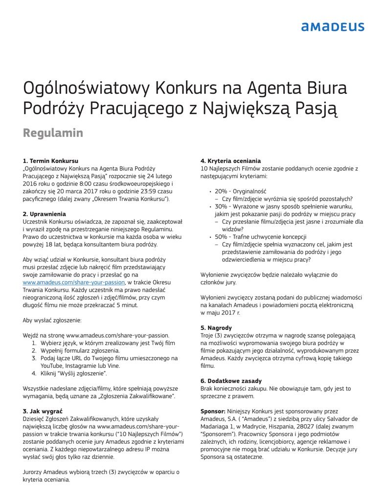 Ogólnoświatowy Konkurs na Agenta Biura Podróży Pracującego z Największą Pasją Regulamin 1. Termin Konkursu „Ogólnoświatowy Konkurs na Agenta Biura Podróży Pracującego z Największą Pasją” rozpocznie się 24 lutego 2016 roku o godzinie 8:00 czasu środkowoeuropejskiego i zakończy się 20 marca 2017 roku o godzinie 23:59 czasu pacyficznego (dalej zwany „Okresem Trwania Konkursu”). 2. Uprawnienia Uczestnik Konkursu oświadcza, że zapoznał się, zaakceptował i wyraził zgodę na przestrzeganie niniejszego Regulaminu. Prawo do uczestnictwa w konkursie ma każda osoba w wieku powyżej 18 lat, będąca konsultantem biura podróży. Aby wziąć udział w Konkursie, konsultant biura podróży musi przesłać zdjęcie lub nakręcić film przedstawiający swoje zamiłowanie do pracy i przesłać go na www.amadeus.com/share-your-passion, w trakcie Okresu Trwania Konkursu. Każdy uczestnik ma prawo nadesłać nieograniczoną ilość zgłoszeń i zdjęć/filmów, przy czym długość filmu nie może przekraczać 5 minut. 4. Kryteria oceniania 10 Najlepszych Filmów zostanie poddanych ocenie zgodnie z następującymi kryteriami: • 20% - Oryginalność – Czy film/zdjęcie wyróżnia się spośród pozostałych? • 30% - Wyrażone w jasny sposób spełnienie warunku, jakim jest pokazanie pasji do podróży w miejscu pracy – Czy przesłanie filmu/zdjęcia jest jasne i zrozumiałe dla widzów? • 50% - Trafne uchwycenie koncepcji – Czy film/zdjęcie spełnia wyznaczony cel, jakim jest przedstawienie zamiłowania do podróży i jego odzwierciedlenia w miejscu pracy? Wyłonienie zwycięzców będzie należało wyłącznie do członków jury. Wyłonieni zwycięzcy zostaną podani do publicznej wiadomości na kanałach Amadeus i powiadomieni pocztą elektroniczną w maju 2017 r. Aby wysłać zgłoszenie: Wejdź na stronę www.amadeus.com/share-your-passion. 1. Wybierz język, w którym zrealizowany jest Twój film 2. Wypełnij formularz zgłoszenia. 3. Podaj łącze URL do Twojego filmu umieszczonego na YouTube, Instagramie lub Vine. 4. Kliknij “Wyślij zgłoszenie”. 5. Nagrody Troje (3) zwycięzców otrzyma w nagrodę szansę polegającą na możliwości wypromowania swojego biura podróży w filmie pokazującym jego działalność, wyprodukowanym przez Amadeus. Każdy zwycięzca otrzyma cyfrową kopię takiego filmu. Wszystkie nadesłane zdjęcia/filmy, które spełniają powyższe wymagania, będą uznane za „Zgłoszenia Zakwalifikowane”. 6. Dodatkowe zasady Brak konieczności zakupu. Nie obowiązuje tam, gdy jest to sprzeczne z prawem. 3. Jak wygrać Dziesięć Zgłoszeń Zakwalifikowanych, które uzyskały największą liczbę głosów na www.amadeus.com/share-yourpassion w trakcie trwania konkursu (“10 Najlepszych Filmów”) zostanie poddanych ocenie jury Amadeus zgodnie z kryteriami oceniania. Z każdego niepowtarzalnego adresu IP można wysłać swój głos tylko raz dziennie. Sponsor: Niniejszy Konkurs jest sponsorowany przez Amadeus, S.A. ( “Amadeus”) z siedzibą przy ulicy Salvador de Madariaga 1, w Madrycie, Hiszpania, 28027 (dalej zwanym “Sponsorem”). Pracownicy Sponsora i jego podmiotów zależnych, ich rodziny, licencjobiorcy, agencje reklamowe i promocyjne nie mogą brać udziału w Konkursie. Decyzje jury Sponsora są ostateczne. Jurorzy Amadeus wybiorą trzech (3) zwycięzców w oparciu o kryteria oceniania. Oświadczenia, gwarancje i odszkodowania: Użytkownik oświadcza, że posiada lub w inny sposób kontroluje wszystkie prawa do przedstawionych treści; że treści te są poprawne; że korzystanie z dostarczonych treści nie narusza Regulaminu Konkursu ani praw do własności intelektualnej osób trzecich i nie narusza praw żadnej osoby czy podmiotu; i że zabezpieczy Sponsora, podmioty z nim powiązane i stowarzyszone przed wszelkimi roszczeniami wynikającymi z dostarczonych treści. Sponsor - wedle uznania - ma prawo do usunięcia bądź anulowania zgłoszenia lub części zgłoszenia, jeżeli zgłoszenie (lub jego część) zawiera fałszywe, nieprawdziwe, obsceniczne lub nieprzyzwoite wypowiedzi lub materiały, lub jeżeli jest ono (lub jego część) niezgodne z obowiązującym prawem. Zwolnienie Sponsora z odpowiedzialności: Uczestnicy i zwycięzcy wyrażają zgodę, aby zwolnić firmę Amadeus oraz jej podmioty stowarzyszone, członków, przedstawicieli członków, pracowników i dyrektorów z wszelkich roszczeń lub szkód wynikających z - lub w związku z - przyjęciem, użytkowaniem, niewłaściwym użytkowaniem, lub posiadaniem nagrody, która może zostać wygrana w tym konkursie, oraz ich udziału w tym konkursie. Media społecznościowe: Konkurs nie jest w żaden sposób sponsorowany, zatwierdzany lub administrowany przez Instagram, YouTube i Vine, ani przez podmioty z nimi powiązane. Informacje dostarczane są do Amadeus. Wszelkie pytania prosimy kierować do Amadeus. Uczestnicy i zwycięzcy zgadzają się chronić od i zwolnić z odpowiedzialności Instagram, YouTube oraz Vine oraz powiązane z nimi jednostki nadrzędne, zależne, stowarzyszone, oraz agencje reklamy i promocji, hurtowników, detalistów, importerów czy dystrybutorów i pracowników, urzędników, dyrektorów i przedstawicieli od wszelkich roszczeń lub szkód wynikających z lub w związku z Konkursem. Dane osobowe: Dane osobowe zebrane podczas konkursu zostaną zapisane w pliku, którego administratorem danych jest Amadeus S.A., i będą wykorzystane w celu organizacji konkursu i umożliwienia Państwa udziału w Konkursie. Mogą Państwo skorzystać z prawa dostępu do tych danych, ich poprawiania, usuwania i wniesienia sprzeciwu za pośrednictwem poczty e-mail: [email protected]. Prawa do wykorzystania filmu/zdjęcia: Nadsyłając zgłoszenie na Konkurs, udzielają Państwo Sponsorowi i jego podmiotom stowarzyszonym niewyłącznego, nieodpłatnego, bezterminowego, nieodwołalnego, opartego na sublicencji prawa do korzystania z, powielania, mo