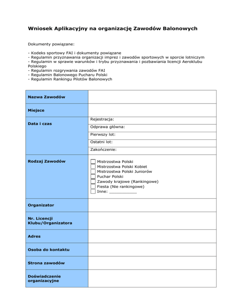 Wniosek Aplikacyjny na organizację Zawodów Balonowych Dokumenty powiązane: - Kodeks sportowy FAI i dokumenty powiązane - Regulamin przyznawania organizacji imprez i zawodów sportowych w sporcie lotniczym - Regulamin w sprawie warunków i trybu przyznawania i pozbawiania licencji Aeroklubu Polskiego - Regulamin rozgrywania zawodów FAI - Regulamin Balonowego Pucharu Polski - Regulamin Rankingu Pilotów Balonowych Nazwa Zawodów Miejsce Rejestracja: Data i czas Odprawa główna: Pierwszy lot: Ostatni lot: Zakończenie: Rodzaj Zawodów Organizator Nr. Licencji Klubu/Organizatora Adres Osoba do kontaktu Strona zawodów Doświadczenie organizacyjne Mistrzostwa Polski Mistrzostwa Polski Kobiet Mistrzostwa Polski Juniorów Puchar Polski Zawody krajowe (Rankingowe) Fiesta (Nie rankingowe) Inne: ___________ Rodzaj zawodów Z loggerami Z obserwatorami Bez loggerów i obserwatorów Dyrektor Zawodów Rzecznik prasowy Otwarcie zawodów Miejsce: Data: Czas: Załączniki: program zdjęcia inne Zakończenie zawodów Miejsce: Data: Czas: Załączniki: Nagrody Szczegóły dotyczące lokalizacji program zdjęcia inne I miejsce II miejsce III miejsce Inne: Zakwaterowanie: Odprawy: Miejsca startów: Załączniki: strona: __________ folder zdjęcia inne: ___________ Szczegóły dotyczące przestrzeni powietrznej Obszar rozgrywania zawodów: Strefy zakazane: Załącznik mapa Dyrektor Sportowy Oficer bezpieczeństwa Przewodniczący Jury Szef scoringu Szef obserwatorów Oficjele Zwrot kosztów podrózy Nocleg Wyżywienie Samochód dyspozycyjny, ilość __ Zwrot kosztów transportu Dodatkowe informacje: __________________ Przewidywana liczba zawodników Sposób klasyfikacji Zgłoszenie Przedpłata Wpłata wpisowego Termin wysłania zgłoszenia Sposób rejestracji Poczta Fax Internet Email Formularz internetowy Inne Koszt wpisowego Wpisowe zawiera Zakwaterowanie dla __ osób Wyżywienie dla __ osób Gaz Mapy Inne: Zawody międzynarodowe Tak Nie Oficjalny język zawodów Koszt protestu Specjalne zalecenia Szczegóły dotyczące mapy Szczegóły dotyczące loggerów Uwagi dotyczące lądowań Inne wymagania: Inne informacje: Strona pierwsza jest obowiązkowa dla Organizacji wszystkich imprez balonowych, które mają być wpisane do Kalendarza Zawodów Balonowych. Pozostałe są obowiązkowe dla organizacji Mistrzostw Polski i Zawodów z cyklu Pucharu Polski. Wszelkie zmiany do informacji zawartych we wniosku aplikacyjnym wymagają akceptacji Komisji Balonowej jednakże nie później niż 14 dni przed Zawodami. Wypełniony wniosek należy wysłać na adres Komisji Balonowej: [email protected] Opłaty za wpis do Kalendarza: - 1500 pln - Mistrzostwa Polski* 1500 pln - Puchar Polski, Mistrzostwa Polski Juniorów, Mistrzostwa Polski Kobiet** 500 pln – zawody Rankingowe 100 pln – inne Zawody/Imprezy (nie Rankingowe) Opłaty się nie dublują. * muszą być rozgrywane na loggerach FAI ** w przypadku rozgrywania na loggerach FAI - 500 pln