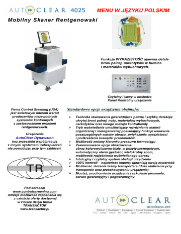 MENU W JĘZYKU POLSKIM Mobilny Skaner Rentgenowski Funkcja WYRAZISTOŚĆ ujawnia detale broni palnej, narkotyków w butelce i materiałów wybuchowych. Czytelny i łatwy w obsłudze Panel Kontrolny urządzenia Firma Control Sreening (USA) jest światowym liderem wśród producentów niezawodnych systemów kontrolnych z zastosowaniem promieni rentgenowskich. Standardowe opcje urządzenia obejmują: Urządzenia AutoClear Dynavision bez przeszkód współpracują z innymi systemami zabezpieczeń nie powodując przy tym zakłóceń. Pod adresem www.controlscreening.com istnieje moŜliwość zapoznania się z całością oferty dostępnej w Polsce dzięki firmie TRANSACTOR www.transactor.pl Technika skanowania gwarantująca pewną i szybką detekcję: ukrytej broni palnej, noŜy, materiałów wybuchowych, narkotyków oraz innego rodzaju kontrabandy Tryb wyświetlania umoŜliwiający rozróŜnianie materii organicznej i nieorganicznej posiadający funkcje usuwania poszczególnych warstw obrazu, zwiększania wyrazistości i podkreślania krawędzi przedmiotów MoŜliwość zmiany kierunku przesuwu taśmociągu Zaawansowane opcje obrazowania: obraz kolorowy/czarno-biały, w pozytywie/negatywie, automatyczny alarm gęstości, wielokrotny zoom, moŜliwość rozjaśnienia wyświetlanego obrazu Intuicyjny i czytelny system obsługi urządzenia 100% kontroli – najcieńsze koperty ujawniają swoją zawartość MoŜliwość złoŜenia taśmy transportera (duŜe ułatwienie przy transporcie oraz przechowywaniu urządzenia) MontaŜ, uruchomienie urządzenia i szkolenie personelu, serwis gwarancyjny i pogwarancyjny www.controlscreening.com Mobilny Skaner Rentgenowski D a n e te c h n i c z n e : Rozmiary tunelu szer. 40 cm / wys. 25,5 cm Wbudowany system pomocy (w języku polskim) Penetracja stali: standard – 10 mm, max. 11 mm Monitor LCD 17”, rozdzielczość 1280 x 1024, 24 bit Dawka promieni rentgenowskich – 1mikroSv (0,1 mRem) Rozdzielczość liniowa 40 AWG (0,08 mm) Bezpieczeństwo filmów fotograficznych – do ISO 1600 (33DIN) Cykl pracy 100% - bez nagrzewania MoŜliwość zmiany kierunku przesuwu taśmociągu Maksymalne obciąŜenie taśmociągu – 150 kg (do 400 kg opcjonalnie) Szybkość taśmociągu – 24 cm/sek. w obu kierunkach Wyświetlanie obiektów organicznych na pomarańczowo, nieorganicznych na niebiesko, mieszanych na zielono, a o duŜej gęstości na kolor czarny, standardowe obrazowanie skanera multienergetycznego Funkcje obróbki obrazu zwiększające czytelność i przejrzystość obrazów (krawędzie, wyrazistość, alarm gęstości, usuwanie warstw obrazu, pseudokolor, negatyw) Cyfrowy zoom do 64 razy przełączany skokowo x2 Zalecane warunki eksploatacji: temperatura od -5 do +55 stopni C, wilgotność do 95% Zasilanie – pobór mocy, prądu: <500VA, przy 200, 220, 240, 250 volt AC + 10%, <2,5 amps. Konstrukcja jednolita, stalowa, kolor szary Urządzenie spełnia wszystkie międzynarodowe standardy dotyczące emisji promieni rentgenowskich Urządzenie posiada znak CE Wymiary urządzenia: patrz rysunek, podane w cm Waga – 186 kg bez opakowania Opcje dodatkowe: Licznik paczek Funkcja TIP Zasilacz awaryjny UPS Wbudowany program treningowy Podajnik rolkowy wejściowy/wyjściowy Logowanie operatora poprzez indywidualne ID Funkcja autoMetalert – auto wykrywania zagroŜeń Drugi monitor i moŜliwość podłączenia drukarki Archiwizacja obrazów i program do zarządzania bazą obrazów Opcja AutoNet – podłączenie do lokalnej sieci komputerowej Urządzenie AutoClear Dynavision 4025 jest zwartym skanerem do inspekcji walizek, neseserów,torebek, plecaków, przesyłek pocztowych oraz innych rodzajów przedmiotów. Model 4025 doskonale sprawdza się w: Szkołach Sądach Zakładach penitencjarnych Ambasadach Biurowcach Instytucjach rządowych Pocztach Szpitalach Podczas organizacji zjazdów, zlotów i imprez TRANSACTOR SP. Z O.O. Ul.SapieŜyńska 10 00-215 Warszawa Tel. 022 635 59 02 Fax 022 635 62 44 Email: [email protected] [email protected] www.transactor.pl