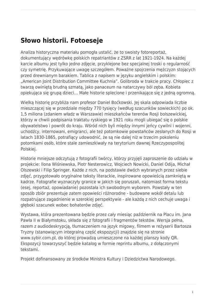 Słowo historii. Fotoeseje Analiza historyczna materiału pomogła ustalić, że to swoisty fotoreportaż, dokumentujący wędrówkę polskich repatriantów z ZSRR z lat 1921-1924. Na każdej karcie albumu jest tylko jedno zdjęcie, przyklejone bez specjalnej troski o regularność czy symetrię. Przykuwające uwagę szczegółem. Poważne spojrzenia mężczyzn stojących przed drewnianym barakiem. Tablica z napisem w języku angielskim i polskim: „American Joint Distribution Committee Kuchnia”. Golibroda w trakcie pracy. Chłopiec z twarzą owiniętą brudną szmatą, jako panaceum na natarczywy ból zęba. Kobieta opiekująca się grupą dzieci… Małe historie splecione i przenikające się z jedną ogromną. Wielką historię przybliża nam profesor Daniel Boćkowski. Jej skala odpowiada liczbie mieszczącej się w przedziale między 770 tysięcy (według szacunków sowieckich) po ok. 1,5 miliona (zdaniem władz w Warszawie) mieszkańców terenów Rosji bolszewickiej, którzy w chwili podpisania traktatu ryskiego w 1921 roku mogli ubiegać się o polskie obywatelstwo i powrót do kraju. Wśród nich byli między innymi jeńcy cywilni i wojenni, uchodźcy, internowani, emigranci, ale też potomkowie powstańców zesłanych do Rosji w latach 1830-1865, potrafiący udowodnić, że są nie dalej niż w trzecim pokoleniu potomkami osób, które stale zamieszkiwały na terytorium dawnej Rzeczypospolitej Polskiej. Historie mniejsze odczytują z fotografii twórcy, którzy przyjęli zaproszenie do udziału w projekcie: Ilona Wiśniewska, Piotr Nesterowicz, Wojciech Nowicki, Daniel Odija, Michał Olszewski i Filip Springer. Każde z nich, na podstawie dwóch wybranych przez siebie zdjęć, przygotowało oryginalne teksty literackie, inspirowane opowieścią zamkniętą w kadrze. Fotografie wyznaczyły granice w jakich się poruszali, natomiast forma tekstu (esej, reportaż, opowiadanie) pozostała ich swobodnym wyborem. Powstały w ten sposób zbiór prezentuje zatem opowieści różnorodne - budowane wokół detalu lub rozpatrujące zagadnienie w szerokiej perspektywie - ale każdą z nich cechuje uwaga i głęboki szacunek wobec bohaterów zdjęć. Wystawa, która prezentowana będzie przez cały miesiąc październik na Placu im. Jana Pawła II w Białymstoku, składa się z fotografii i fragmentów tekstów. Wersja pełna, razem z audiodeskrypcją, tłumaczeniem na język migowy, filmem w reżyserii Bartosza Tryzny (stanowiącym integralną część ekspozycji) znajdzie się na stronie www.sybir.com.pl, do której prowadzą umieszczone na każdej planszy kody QR. Ekspozycji towarzyszyć będzie katalog w formie reprintu albumu, z dołączonymi tekstami. Projekt dofinansowany ze środków Ministra Kultury i Dziedzictwa Narodowego. 1 Patroni medialni „Tygodnik Powszechny”, „Gazeta Wyborcza. Białystok”, „TVP Kultura”, „Platforma Kultury”, „Booklips.pl” Autor projektu: Marcin Koziński Tekst historyczny: Daniel Boćkowski Teksty literackie: Piotr Nesterowicz, Wojciech Nowicki, Daniel Odija, Michał Olszewski, Filip Springer, Ilona Wiśniewska Film: Bartek Tryzna Opracowanie graficzne: Mirosław Myszkiewicz Projekt ekspozytorów: Adrian Łucejko Tłumaczenie na język migowy: Joanna Zembrowska-Wojno, Edyta Milewska Nagrania tłumaczeń: Szczepan Skibicki Audiodeskrypcja: Monika Marciniak Lektor: Marek Tyszkiewicz 2