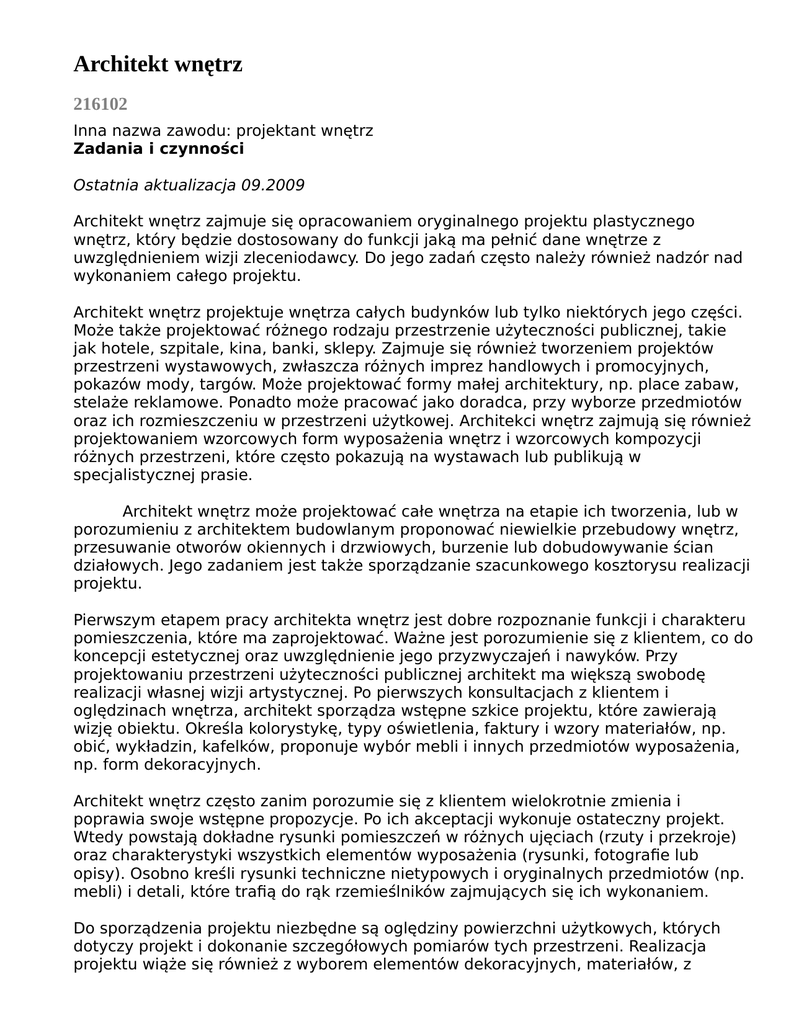 Architekt wnętrz 216102 Inna nazwa zawodu: projektant wnętrz Zadania i czynności Ostatnia aktualizacja 09.2009 Architekt wnętrz zajmuje się opracowaniem oryginalnego projektu plastycznego wnętrz, który będzie dostosowany do funkcji jaką ma pełnić dane wnętrze z uwzględnieniem wizji zleceniodawcy. Do jego zadań często należy również nadzór nad wykonaniem całego projektu. Architekt wnętrz projektuje wnętrza całych budynków lub tylko niektórych jego części. Może także projektować różnego rodzaju przestrzenie użyteczności publicznej, takie jak hotele, szpitale, kina, banki, sklepy. Zajmuje się również tworzeniem projektów przestrzeni wystawowych, zwłaszcza różnych imprez handlowych i promocyjnych, pokazów mody, targów. Może projektować formy małej architektury, np. place zabaw, stelaże reklamowe. Ponadto może pracować jako doradca, przy wyborze przedmiotów oraz ich rozmieszczeniu w przestrzeni użytkowej. Architekci wnętrz zajmują się również projektowaniem wzorcowych form wyposażenia wnętrz i wzorcowych kompozycji różnych przestrzeni, które często pokazują na wystawach lub publikują w specjalistycznej prasie. Architekt wnętrz może projektować całe wnętrza na etapie ich tworzenia, lub w porozumieniu z architektem budowlanym proponować niewielkie przebudowy wnętrz, przesuwanie otworów okiennych i drzwiowych, burzenie lub dobudowywanie ścian działowych. Jego zadaniem jest także sporządzanie szacunkowego kosztorysu realizacji projektu. Pierwszym etapem pracy architekta wnętrz jest dobre rozpoznanie funkcji i charakteru pomieszczenia, które ma zaprojektować. Ważne jest porozumienie się z klientem, co do koncepcji estetycznej oraz uwzględnienie jego przyzwyczajeń i nawyków. Przy projektowaniu przestrzeni użyteczności publicznej architekt ma większą swobodę realizacji własnej wizji artystycznej. Po pierwszych konsultacjach z klientem i oględzinach wnętrza, architekt sporządza wstępne szkice projektu, które zawierają wizję obiektu. Określa kolorystykę, typy oświetlenia, faktury i wzory materiałów, np. obić, wykładzin, kafelków, proponuje wybór mebli i innych przedmiotów wyposażenia, np. form dekoracyjnych. Architekt wnętrz często zanim porozumie się z klientem wielokrotnie zmienia i poprawia swoje wstępne propozycje. Po ich akceptacji wykonuje ostateczny projekt. Wtedy powstają dokładne rysunki pomieszczeń w różnych ujęciach (rzuty i przekroje) oraz charakterystyki wszystkich elementów wyposażenia (rysunki, fotografie lub opisy). Osobno kreśli rysunki techniczne nietypowych i oryginalnych przedmiotów (np. mebli) i detali, które trafią do rąk rzemieślników zajmujących się ich wykonaniem. Do sporządzenia projektu niezbędne są oględziny powierzchni użytkowych, których dotyczy projekt i dokonanie szczegółowych pomiarów tych przestrzeni. Realizacja projektu wiąże się również z wyborem elementów dekoracyjnych, materiałów, z których mają być wykonane elementy wystroju wnętrz. W związku z tym niezbędne jest odwiedzanie sklepów, hurtowni, galerii. Nieco inne zadania zawodowe ma architekt zajmujący się projektowaniem wystaw. Jego zadania są wtedy pokrewne zadaniom scenografa. Architekt wnętrz zatrudniony w galerii handlowej odpowiada przede wszystkim za zgodność proponowanych rozwiązań dla poszczególnych lokali z ogólnymi założeniami galerii, dba o jednolity standard wykończenia, klimat lokalu, sposób oznakowania i użyte materiały wykończeniowe. Ponadto do jego zadań należy także dbanie o ogólny wizerunek galerii dostosowany do pór roku oraz głównych świąt (Bożego Narodzenia, Wielkanocy, Walentynek, itp.). Natomiast architekt wnętrz zatrudniony przez sklep lub firmę obejmującą sieć lokali dba o dopasowanie architektury wnętrza do zastanych powierzchni i warunków. Odpowiada też za zgodność projektu sklepu z normami i wytycznymi galerii handlowej. Czasem ma wpływ również ułożenie towaru, sezonowe aranżacje. Projektowanie wystaw jest specjalizacją, którą można wybrać kończąc studia w Akademii Sztuk Pięknych. Współcześnie architekci wnętrz w swojej pracy wykorzystują komputer, specjalistyczne programy, przyrządy służące do komunikowania się: Internet, telefon, fax., Do podstawowych narzędzi pracy należą też: przyrządy pomiarowe, wzorniki kolorów, próbki materiałów. Finałowym efektem pracy architekta wnętrz jest projekt, który gwarantuje: - oryginalną kompozycję przestrzeni, - funkcjonalność wnętrz, - dostosowanie wnętrz do psychofizycznych cech ich użytkowników - odpowiednią jakość techniczną oraz estetyczną materiałów i przedmiotów.