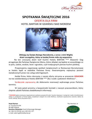 SPOTKANIA ŚWIĄTECZNE 2016 OFERTA DLA FIRM HOTEL BARTAN W GDAŃSKU NAD MORZEM Zbliżają się Święta Bożego Narodzenia, a wraz z nimi Wigilia dzień szczególny, który w każdej firmie miło się wspomina. Na ten uroczysty dzień Szef Kuchni Hotelu BARTAN *** Sławomir Sieg przygotuje dla Państwa Świąteczne Menu, które składać się będzie ze wszystkiego co w polu, sadzie, wodzie, lesie i ogrodzie, czyli tradycyjnych potraw kuchni polskiej. Proponujemy organizację spotkań świątecznych w Restauracji Bursztynowej w hotelu bądź w siedzibie Państwa firmy. Gwarantujemy najwyższy poziom świadczonych przez nas usług cateringowych. Każda firma, która skorzysta z naszej oferty otrzyma w prezencie VOUCHER na noc weekendową w Hotelu BARTAN *** dla 2 osób z pakietem Wellness*. Serdecznie zapraszamy do dokonania rezerwacji wybranego przez Państwa terminu. W razie pytań prosimy o bezpośredni kontakt z naszym pracownikiem, który chętnie udzieli Państwu dodatkowych informacji. *VOUCHER będzie przekazany organizatorowi spotkania powyżej 50 osób. Voucher obejmuje 1 nocleg dla 2 osób w komfortowym pokoju ze śniadaniem w formie bufetu, bezpłatnym wstępem do strefy Wellness, możliwość wypożyczenia rowerów, kijków do nordic walking. Ważny do grudnia 2017 r. Hotel Bartan ul. Turystyczna 9A 80-680 Gdańsk Karolina Wolańska Food & Beverage Manager tel. (58) 323 99 08, kom. 602 651 157 e-mail: [email protected] The Member of Propozycje menu cateringowego na spotkanie wigilijne w formie bufetu (powyżej 20 osób) Menu I 39 zł/os. Barszcz czerwony 300 ml Pierogi własnoręcznie klejone 4 szt. Śledź po żuławsku w oliwie podany z marynowanymi grzybami, plasterkami marchewki i korniszona 80 g Sałatka wigilijna Włoska jarzynowa 100 g Ciepła bułeczka 1 szt. Ciasto wigilijne 1 szt. Woda mineralna w karafkach Menu II 39 zł/os. Barszcz czerwony 300 ml Pierogi własnoręcznie klejone 4 szt. Schab ze śliwką w galarecie 50 g Sałatka wigilijna Włoska jarzynowa 100 g Ciepła bułeczka 1 szt. Ciasto wigilijne 1 szt. Woda mineralna w karafkach Menu III 49 zł/os. Zupa z borowików 300 ml Pierogi własnoręcznie klejone 4 szt. Pstrąg w galarecie z warzywami 50 g Sałatka ziemniaczana po polsku 100 g Ciepła bułeczka 1 szt. Ciasto wigilijne 1 szt. Woda mineralna w karafkach Hotel Bartan ul. Turystyczna 9A 80-680 Gdańsk Karolina Wolańska Food & Beverage Manager tel. (58) 323 99 08, kom. 602 651 157 e-mail: [email protected] The Member of Menu III 49 zł/os. Śledź po żuławsku w oliwie podany z marynowanymi grzybami, plasterkami marchewki i korniszona 80 g Barszcz czerwony 300 ml Pierogi własnoręcznie klejone 4 szt. Gołąbki z kaszą jęczmienną i grzybami we włoskiej kapuście Ciepła bułeczka 1 szt. Ciasto wigilijne 1 szt. Woda mineralna w karafkach Menu IV 60 zł/os. Zupa z borowików 300 ml Pierogi własnoręcznie klejone 4 szt. Śledź po żuławsku w oliwie podany z marynowanymi grzybami, plasterkami marchewki i korniszona 80 g Pstrąg w galarecie z warzywami 50 g Pasztet świąteczny 80g Sałatka wigilijna Włoska jarzynowa 100 g Ciepłe bułeczki 2 szt. Ciasto wigilijne 1 szt. Woda mineralna w karafkach Cydr 150 ml lub sok owocowy 200 ml Hotel Bartan ul. Turystyczna 9A 80-680 Gdańsk Karolina Wolańska Food & Beverage Manager tel. (58) 323 99 08, kom. 602 651 157 e-mail: [email protected] The Member of Pierogi własnoręcznie klejone (do wyboru) : - z kapustą i grzybami - ruskie - z ziemniakami i czosnkiem Ciasta wigilijne ( do wyboru): - sernik - makowiec z bakaliami - piernik z bakaliami - ciastka koktajlowe ( eklerki, ptysie) - rogaliki z wiśniami Wszystkie podane ceny są cenami netto. Do powyższych cen doliczamy (przy usłudze cateringowej) 10% wartości zamówienia za dostawę bez serwisu kelnerskiego 25% wartości zamówienia za dostawę z serwisem kelnerskim (zastawa, obrusy, obsługa) Hotel Bartan ul. Turystyczna 9A 80-680 Gdańsk Karolina Wolańska Food & Beverage Manager tel. (58) 323 99 08, kom. 602 651 157 e-mail: [email protected] The Member of Propozycje menu cateringowego na spotkanie wigilijne w formie bufetu (powyżej 40 osób) Menu I 69 zł/os. Zakąski zimne: 5 zakąsek do wyboru Karp po żydowsku Pstrąg w galarecie z warzywami Terrina rybna na roszponce Ryba po grecku Śledź po żuławsku w oliwie podany z marynowanymi grzybami, plasterkami marchewki i korniszona Tatar ze śledzia na pumperniklu Sałatka wigilijna Włoska jarzynowa Sałatka ziemniaczana po polsku Pasztet świąteczny Tymbaliki drobiowe Indyk z morelą w maladze Terrina drobiowa z bakaliami Schab z morelą lub śliwką w galarecie (Zakąski zimne łącznie 300g/os.) Dania gorące: Barszcz z pasztecikiem/ Zupa grzybowa Dorsz smażony z grzybami Pierogi własnoręcznie klejone Groch z kapustą (Dania gorące łącznie 500g/os.) Desery: Ciasto wigilijne (Desery łącznie 100g/osoba) Napoje: Woda mineralna w karafkach Cydr 150ml lub sok 200ml Hotel Bartan ul. Turystyczna 9A 80-680 Gdańsk Karolina Wolańska Food & Beverage Manager tel. (58) 323 99 08, kom. 602 651 157 e-mail: [email protected] The Member of Menu II 80 zł/os. Zakąski zimne: 7 zakąsek do wyboru Karp po żydowsku Pstrąg w galarecie z warzywami Terrina rybna na roszponce Ryba po grecku Śledź po żuławsku w oliwie podany z marynowanymi grzybami, plasterkami marchewki i korniszona Tatar ze śledzia na pumperniklu Sałatka wigilijna Włoska jarzynowa Sałatka ziemniaczana po polsku Pasztet świąteczny Tymbaliki drobiowe Indyk z morelą w maladze Terrina drobiowa z bakaliami Schab z morelą lub śliwką w galarecie (Zakąski zimne łącznie 400g/os.) Dania gorące: Barszcz z pasztecikiem/ Zupa grzybowa Kaczka luzowana z farszem po polsku Pierogi własnoręcznie klejone Ziemniaki opiekane w ziołach Groch z kapustą (Dania gorące łącznie 500g/os.) Desery: Ciasto wigilijne (Desery łącznie 100g/os.) Napoje: Woda mineralna w karafkach Cydr 150ml lub sok 200ml Hotel Bartan ul. Turystyczna 9A 80-680 G