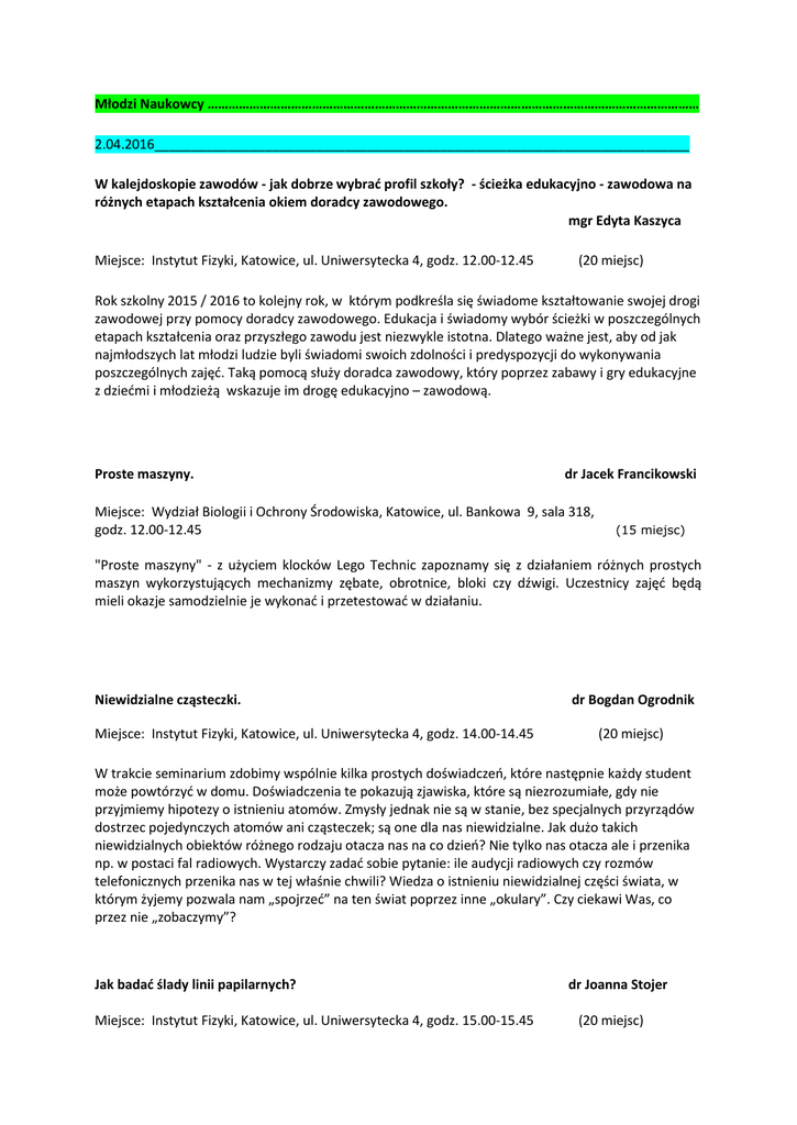 Młodzi Naukowcy …………………………………………………………………………………………………………………………… 2.04.2016_________________________________________________________________________ W kalejdoskopie zawodów - jak dobrze wybrać profil szkoły? - ścieżka edukacyjno - zawodowa na różnych etapach kształcenia okiem doradcy zawodowego. mgr Edyta Kaszyca Miejsce: Instytut Fizyki, Katowice, ul. Uniwersytecka 4, godz. 12.00-12.45 (20 miejsc) Rok szkolny 2015 / 2016 to kolejny rok, w którym podkreśla się świadome kształtowanie swojej drogi zawodowej przy pomocy doradcy zawodowego. Edukacja i świadomy wybór ścieżki w poszczególnych etapach kształcenia oraz przyszłego zawodu jest niezwykle istotna. Dlatego ważne jest, aby od jak najmłodszych lat młodzi ludzie byli świadomi swoich zdolności i predyspozycji do wykonywania poszczególnych zajęć. Taką pomocą służy doradca zawodowy, który poprzez zabawy i gry edukacyjne z dziećmi i młodzieżą wskazuje im drogę edukacyjno – zawodową. Proste maszyny. dr Jacek Francikowski Miejsce: Wydział Biologii i Ochrony Środowiska, Katowice, ul. Bankowa 9, sala 318, godz. 12.00-12.45 (15 miejsc) "Proste maszyny" - z użyciem klocków Lego Technic zapoznamy się z działaniem różnych prostych maszyn wykorzystujących mechanizmy zębate, obrotnice, bloki czy dźwigi. Uczestnicy zajęć będą mieli okazje samodzielnie je wykonać i przetestować w działaniu. Niewidzialne cząsteczki. Miejsce: Instytut Fizyki, Katowice, ul. Uniwersytecka 4, godz. 14.00-14.45 dr Bogdan Ogrodnik (20 miejsc) W trakcie seminarium zdobimy wspólnie kilka prostych doświadczeń, które następnie każdy student może powtórzyć w domu. Doświadczenia te pokazują zjawiska, które są niezrozumiałe, gdy nie przyjmiemy hipotezy o istnieniu atomów. Zmysły jednak nie są w stanie, bez specjalnych przyrządów dostrzec pojedynczych atomów ani cząsteczek; są one dla nas niewidzialne. Jak dużo takich niewidzialnych obiektów różnego rodzaju otacza nas na co dzień? Nie tylko nas otacza ale i przenika np. w postaci fal radiowych. Wystarczy zadać sobie pytanie: ile audycji radiowych czy rozmów telefonicznych przenika nas w tej właśnie chwili? Wiedza o istnieniu niewidzialnej części świata, w którym żyjemy pozwala nam „spojrzeć” na ten świat poprzez inne „okulary”. Czy ciekawi Was, co przez nie „zobaczymy”? Jak badać ślady linii papilarnych? Miejsce: Instytut Fizyki, Katowice, ul. Uniwersytecka 4, godz. 15.00-15.45 dr Joanna Stojer (20 miejsc) Warsztat spędzimy na ujawnianiu i zabezpieczaniu śladów linii papilarnych. Na ujawnianiu - to znaczy, że zobaczymy ślady niewidoczne gołym okiem, zaś zabezpieczenie śladów pozwoli Uczestnikom zabrać ślady do domu. Dowiemy się, jak powstała dziedzina kryminalistyki zwana daktyloskopią oraz jak porównać ze sobą dwa odciski. Uczestnicy będą korzystali z pędzli daktyloskopijnych i proszków do ujawniania śladów z walizki kryminalistycznej. 23.04.2016________________________________________________________________________ Autoprezentacja - kreowanie własnego wizerunku w oczach innych osób. Miejsce: Instytut Fizyki, Katowice, ul. Uniwersytecka 4, godz. 11.00-11.45 Bruno Żółtowski (20 miejsc) Seminarium poświęcone nabywaniu samoświadomości w zakresie własnej autoprezentacji. Porusza tematykę kultury osobistej, mowy ciała, autoprezentacji podczas wystąpień publicznych i oficjalnych spotkań oraz wydarzeń. Od zabawy do ekologii. dr Maja Głowacka Miejsce: Instytut Fizyki, Katowice, ul. Uniwersytecka 4, godz. 12.00-12.45 (20 miejsc) Spotkanie wypełnią zabawy ale nie takie, których jedynym celem jest przyjemne spędzenie czasu. Będą to zabawy, które uczą różnych ważnych praw ekologii. Jak to jest być nietoperzem polującym na ćmy? Co się dzieje z mieszkańcami lasu, gdy każdy posiada inne potrzeby a środków do ich zaspokojenia nie ma za dużo. Czy budowa nowej drogi przecinającej las na dwie części zmienia coś w ekosystemie lasu czy niekoniecznie? Czy łatwo jest się skradać lisowi w kierunku zająca? Jak wspólne zbudować wielki baobab. Na czym polegają sieci troficzne? To nie są wszystkie zabawy jakie czekają na studentów, którzy lubią się i uczyć i bawić. Zawód: Prawnik. mgr Aleksandra Makarucha Miejsce: Instytut Fizyki, Katowice, ul. Uniwersytecka 4, godz. 12.00-12.45 (20 miejsc) Co robi adwokat? Czym zajmuje się radca prawny? Dlaczego o wykonywaniu zawodu sędziego mówi się jako o ukoronowaniu kariery prawniczej? Czy prokurator większość czasu spędza za biurkiem czy w terenie? Czym zajmuje się notariusz? Dlaczego komornik to najtrudniejszy z zawodów prawniczych? Jeśli chcesz znać odpowiedź na powyższe pytania, a także przymierzyć prawdziwą togę – przyjdź na zajęcia :) Rozrusznik serca, co to jest? Miejsce: Instytut Fizyki, Katowice, ul. Uniwersytecka 4, godz. 14.00-14.45 dr Iwona Nowak (20 miejsc) Na warsztatach zobaczymy kilka modeli rozrusznika serca i dowiemy się do czego służą. Dowiemy się także kto jest jego wynalazcą i w jaki sposób rozrusznik pomaga sercu. Będzie można posłuchać jak bije nasze własne serce za pomocą specjalnego urządzenia. 14.05.2016 ________________________________________________________________________ Kryminał na wesoło, czyli krótka historia „Serenady”. Miejsce: Instytut Fizyki, Katowice, ul. Uniwersytecka 4, godz. 11.00-11.45 mgr. Lidia Bień (15 miejsc) Seminarium poświęcone będzie umiejętnemu budowaniu postaci, poprzez aktorską zabawę stereotypem oraz żartobliwymi dialogami. W oparciu o wybrane fragmenty jednoaktówki Mrożka, podejmiemy temat złożonych relacji międzyludzkich jako alegorii… kurnika. W działaniu aktorskim, postaramy się uchwycić typowe cechy zachowań i interakcji pomiędzy wszystkimi bohaterami – kurami, kogutem i lisem, prowadzących do nieuchronnej tragedii. 
