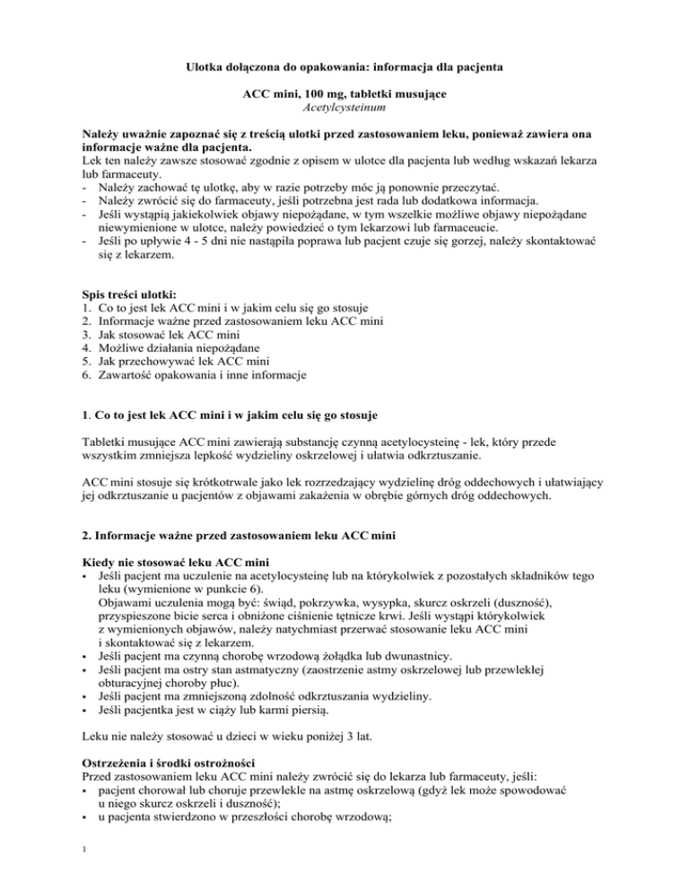 Ulotka dołączona do opakowania: informacja dla pacjenta ACC mini, 100 mg, tabletki musujące Acetylcysteinum Należy uważnie zapoznać się z treścią ulotki przed zastosowaniem leku, ponieważ zawiera ona informacje ważne dla pacjenta. Lek ten należy zawsze stosować zgodnie z opisem w ulotce dla pacjenta lub według wskazań lekarza lub farmaceuty. - Należy zachować tę ulotkę, aby w razie potrzeby móc ją ponownie przeczytać. - Należy zwrócić się do farmaceuty, jeśli potrzebna jest rada lub dodatkowa informacja. - Jeśli wystąpią jakiekolwiek objawy niepożądane, w tym wszelkie możliwe objawy niepożądane niewymienione w ulotce, należy powiedzieć o tym lekarzowi lub farmaceucie. - Jeśli po upływie 4 - 5 dni nie nastąpiła poprawa lub pacjent czuje się gorzej, należy skontaktować się z lekarzem. Spis treści ulotki: 1. Co to jest lek ACC mini i w jakim celu się go stosuje 2. Informacje ważne przed zastosowaniem leku ACC mini 3. Jak stosować lek ACC mini 4. Możliwe działania niepożądane 5. Jak przechowywać lek ACC mini 6. Zawartość opakowania i inne informacje 1. Co to jest lek ACC mini i w jakim celu się go stosuje Tabletki musujące ACC mini zawierają substancję czynną acetylocysteinę - lek, który przede wszystkim zmniejsza lepkość wydzieliny oskrzelowej i ułatwia odkrztuszanie. ACC mini stosuje się krótkotrwale jako lek rozrzedzający wydzielinę dróg oddechowych i ułatwiający jej odkrztuszanie u pacjentów z objawami zakażenia w obrębie górnych dróg oddechowych. 2. Informacje ważne przed zastosowaniem leku ACC mini Kiedy nie stosować leku ACC mini Jeśli pacjent ma uczulenie na acetylocysteinę lub na którykolwiek z pozostałych składników tego leku (wymienione w punkcie 6). Objawami uczulenia mogą być: świąd, pokrzywka, wysypka, skurcz oskrzeli (duszność), przyspieszone bicie serca i obniżone ciśnienie tętnicze krwi. Jeśli wystąpi którykolwiek z wymienionych objawów, należy natychmiast przerwać stosowanie leku ACC mini i skontaktować się z lekarzem. Jeśli pacjent ma czynną chorobę wrzodową żołądka lub dwunastnicy. Jeśli pacjent ma ostry stan astmatyczny (zaostrzenie astmy oskrzelowej lub przewlekłej obturacyjnej choroby płuc). Jeśli pacjent ma zmniejszoną zdolność odkrztuszania wydzieliny. Jeśli pacjentka jest w ciąży lub karmi piersią. Leku nie należy stosować u dzieci w wieku poniżej 3 lat. Ostrzeżenia i środki ostrożności Przed zastosowaniem leku ACC mini należy zwrócić się do lekarza lub farmaceuty, jeśli: pacjent chorował lub choruje przewlekle na astmę oskrzelową (gdyż lek może spowodować u niego skurcz oskrzeli i duszność); u pacjenta stwierdzono w przeszłości chorobę wrzodową; 1 pacjent ma obecnie lub miał w przeszłości niewydolność oddechową; pacjent jest uczulony na histaminę, gdyż lek ACC mini może wywołać u niego objawy nietolerancji (takie jak ból głowy, zapalenie błony śluzowej nosa, świąd); pacjent jest w podeszłym wieku (powyżej 65 lat). Jeśli w trakcie stosowania leku ACC mini wystąpią u pacjenta zmiany na skórze lub błonach śluzowych, należy przerwać przyjmowanie leku i niezwłocznie zwrócić się do lekarza. Inne leki i lek ACC mini Należy powiedzieć lekarzowi lub farmaceucie o wszystkich lekach przyjmowanych obecnie lub ostatnio, a także o lekach, które pacjent planuje stosować. Nie należy stosować leku ACC mini jednocześnie z lekami przeciwkaszlowymi, gdyż osłabiają one odruch kaszlowy i mogą utrudnić odkrztuszanie rozrzedzonej przez ACC mini wydzieliny. Acetylocysteina (substancja czynna leku ACC mini) może osłabiać działanie niektórych antybiotyków (zwłaszcza półsyntetycznych penicylin, tetracyklin, cefalosporyn i aminoglikozydów). Aby temu zapobiec, lek ACC mini należy przyjmować po 2 godzinach od zażycia antybiotyku. Nie dotyczy to takich antybiotyków, jak cefiksym, lorakarbef, amoksycylina, doksycyklina, erytromycyna, tiamfenikol i cefuroksym. W razie wątpliwości należy poradzić się lekarza. ACC mini może nasilić działanie nitrogliceryny i innych azotanów (leków stosowanych w chorobach układu krążenia i w chorobie niedokrwiennej serca). Jeśli pacjent przyjmuje nitroglicerynę lub inny podobnie działający lek z grupy azotanów, powinien zasięgnąć porady lekarza przed zażyciem leku ACC mini. Lek ACC mini z jedzeniem i piciem Lek należy przyjmować po posiłku. Podczas leczenia należy wypijać odpowiednio dużą ilość płynów (co najmniej 1,5 l dziennie). Ciąża i karmienie piersią W ciąży i w okresie karmienia piersią lub gdy istnieje podejrzenie, że kobieta jest w ciąży albo planuje ciążę, przed zastosowaniem tego leku należy poradzić się lekarza lub farmaceuty. Leku ACC mini nie należy stosować w okresie ciąży i karmienia piersią. Prowadzenie pojazdów i obsługiwanie maszyn Nie dowiedziono, aby lek ACC mini zaburzał zdolność prowadzenia pojazdów i obsługiwania maszyn. Lek ACC mini zawiera laktozę i sód. Tabletki musujące ACC mini zawierają laktozę. Jeżeli stwierdzono wcześniej u pacjenta nietolerancję niektórych cukrów, pacjent powinien skontaktować się z lekarzem przed przyjęciem leku. Jedna tabletka musująca ACC mini zawiera 95,9 mg sodu, co należy wziąć pod uwagę u pacjentów z osłabioną czynnością nerek i u pacjentów kontrolujących zawartość sodu w diecie (dieta ubogosodowa lub bezsolna). 3. Jak stosować lek ACC mini Ten lek należy zawsze stosować zgodnie z zaleceniami zawartymi w ulotce. W razie wątpliwości należy zwrócić się do lekarza lub farmaceuty. Zwykle stosuje się następujące dawkowanie: Dorośli i młodzież w wieku powyżej 14 lat 2 tabletki musujące ACC mini dwa lub trzy razy na dobę (co odpowiada 400 mg do 600 mg acetylocysteiny na dobę w 2 lub 3 dawkach podzielonych). 2 Dzieci w wieku od 7 do 14 lat 1 tabletka musująca ACC mini cztery razy na dobę lub 2 tabletki musujące AC