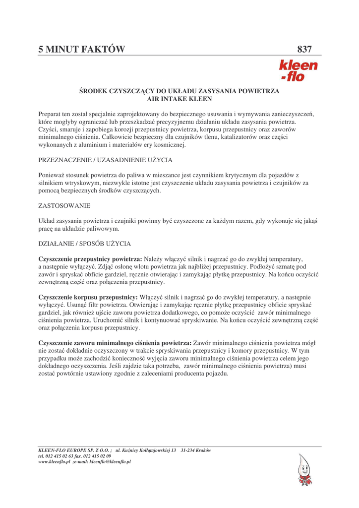 5 MINUT FAKTÓW 837 RODEK CZYSZCZ CY DO UKŁADU ZASYSANIA POWIETRZA AIR INTAKE KLEEN Preparat ten został specjalnie zaprojektowany do bezpiecznego usuwania i wymywania zanieczyszcze , które mogłyby ogranicza lub przeszkadza precyzyjnemu działaniu układu zasysania powietrza. Czy ci, smaruje i zapobiega korozji przepustnicy powietrza, korpusu przepustnicy oraz zaworów minimalnego ci nienia. Całkowicie bezpieczny dla czujników tlenu, katalizatorów oraz cz ci wykonanych z aluminium i materiałów ery kosmicznej. PRZEZNACZENIE / UZASADNIENIE U YCIA Poniewa stosunek powietrza do paliwa w mieszance jest czynnikiem krytycznym dla pojazdów z silnikiem wtryskowym, niezwykle istotne jest czyszczenie układu zasysania powietrza i czujników za pomoc bezpiecznych rodków czyszcz cych. ZASTOSOWANIE Układ zasysania powietrza i czujniki powinny by czyszczone za ka dym razem, gdy wykonuje si jak prac na układzie paliwowym. DZIAŁANIE / SPOSÓB U YCIA Czyszczenie przepustnicy powietrza: Nale y wł czy silnik i nagrza go do zwykłej temperatury, a nast pnie wył czy . Zdj osłon wlotu powietrza jak najbli ej przepustnicy. Podło y szmat pod zawór i spryska obficie gardziel, r cznie otwieraj c i zamykaj c płytk przepustnicy. Na ko cu oczy ci zewn trzn cz oraz poł czenia przepustnicy. Czyszczenie korpusu przepustnicy: Wł czy silnik i nagrza go do zwykłej temperatury, a nast pnie wył czy . Usun filtr powietrza. Otwieraj c i zamykaj c r cznie płytk przepustnicy obficie spryska gardziel, jak równie uj cie zaworu powietrza dodatkowego, co pomo e oczy ci zawór minimalnego ci nienia powietrza. Uruchomi silnik i kontynuowa spryskiwanie. Na ko cu oczy ci zewn trzn cz oraz poł czenia korpusu przepustnicy. Czyszczenie zaworu minimalnego ci nienia powietrza: Zawór minimalnego ci nienia powietrza mógł nie zosta dokładnie oczyszczony w trakcie spryskiwania przepustnicy i komory przepustnicy. W tym przypadku mo e zachodzi konieczno wyj cia zaworu minimalnego ci nienia powietrza celem jego dokładnego oczyszczenia. Je li zajdzie taka potrzeba, zawór minimalnego ci nienia powietrza) musi zosta powtórnie ustawiony zgodnie z zaleceniami producenta pojazdu. KLEEN-FLO EUROPE SP. Z O.O. ; ul. Ku nicy Kołł tajowskiej 13 31-234 Kraków tel. 012 415 02 63 fax. 012 415 02 09 www.kleenflo.pl ;e-mail: [email protected] 5 MINUT FAKTÓW 837 MIEJSCA SPRZEDA Y / ZASTOSOWANIA · · · · · · · · hurtownicy sprzedawcy cz ci samochodowych warsztaty samochodowe firmy dysponuj ce własnym taborem pojazdów stacje obsługi sprzedawcy samochodów nowych i u ywanych specjalistyczne warsztaty naprawcze punkty serwisowe sprz tu motorowodnego KORZY CI DLA NABYWCY / ODBIORCY · · · · · · · · Czy ci, smaruje i ochrania. Po usuni ciu osadów stwarza podwójn ochron za pomoc inhibitora korozji oraz rodka smaruj cego poł czonego z olejem, które zapobiegaj powstawaniu nad erek i nagromadzeniu si osadów na cz ciach o niskiej tolerancji. Dysza 360 °, rozpylaj ca we wszystkich kierunkach. Specjalnie przystosowany do komputerowo sterowanego układu zasysania powietrza. Zwi ksza oszcz dno paliwa. Zmniejsza emisj . Poprawia komfort jazdy i kontrol nad pojazdem. Bezpiecznie czy ci przepustnic , korpus przepustnicy i zawór minimalnego ci nienia powietrza w silnikach wtryskowych. Bezpieczny dla czujników tlenu, katalizatorów, aluminium i materiałów ery kosmicznej. OPAKOWANIA Numer katalogowy 837 -- 12 x 418 g KLEEN-FLO EUROPE SP. Z O.O. ; ul. Ku nicy Kołł tajowskiej 13 31-234 Kraków tel. 012 415 02 63 fax. 012 415 02 09 www.kleenflo.pl ;e-mail: [email protected]