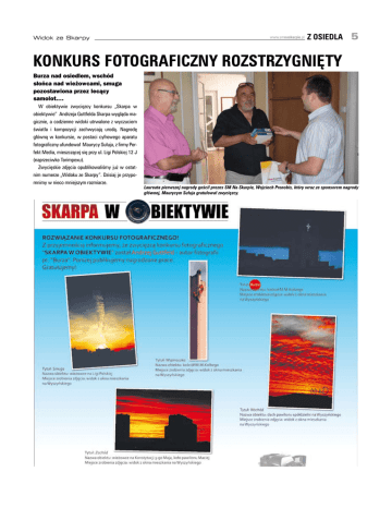 Widok ze Skarpy www.smnaskarpie.pl z osiedla 5 Konkurs Fotograficzny rozstrzygnięty Burza nad osiedlem, wschód słońca nad wieżowcami, smuga pozostawiona przez lecący samolot.… W obiektywie zwycięzcy konkursu „Skarpa w obiektywie” Andrzeja Guttfelda Skarpa wygląda magicznie, a codzienne widoki utrwalone z wyczuciem światła i kompozycji zachwycają urodą. Nagrodę główną w konkursie, w postaci cyfrowego aparatu fotograficzny ufundował Maurycy Sułuja, z firmy Perfekt Media, mieszczącej się przy ul. Ligi Polskiej 12 J (naprzeciwko Torimpexu). Zwycięskie zdjęcia opublikowaliśmy już w ostatnim numerze „Widoku ze Skarpy”. Dzisiaj je przypomnimy w nieco mniejszym rozmiarze. Laureata pierwszej nagrody gościł prezes SM Na Skarpie, Wojciech Pronobis, który wraz ze sponsorem nagrody głównej, Maurycym Sułuja gratulował zwycięzcy.