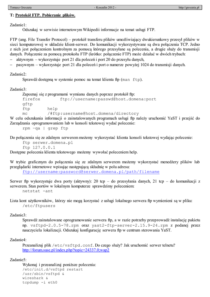 Tomasz Greszata - Koszalin 2012 - http://greszata.pl T: Protokół FTP. Pobieranie plików. Zadanie1: Odszukaj w serwisie internetowym Wikipedii informacje na temat usługi FTP. FTP (ang. File Transfer Protocol) – protokół transferu plików umożliwiający dwukierunkowy przesył plików w sieci komputerowej w układzie klient-serwer. Do komunikacji wykorzystywane są dwa połączenia TCP. Jedno z nich jest połączeniem kontrolnym za pomocą którego przesyłane są polecenia, a drugie służy do transmisji danych. Połączenie za pomocą protokołu FTP (krótko: połączenie FTP) może działać w dwóch trybach: aktywnym – wykorzystuje port 21 dla poleceń i port 20 do przesyłu danych, pasywnym – wykorzystuje port 21 dla poleceń i port o numerze powyżej 1024 do transmisji danych. Zadanie2: Sprawdź dostępną w systemie pomoc na temat klienta ftp (man ftp). Zadanie3: Zapoznaj się z programami wymianu danych poprzez protokół ftp: firefox ftp://username:[email protected]:port gftp ftp help mc /#ftp:[email protected]/directory W celu odszukania informacji o zainstalowanych programach usługi ftp należy uruchomić YaST i przejść do Zarządzania oprogramowaniem lub w konsoli tekstowej wydać polecenie: rpm –qa | grep ftp Do połączenia się ze zdalnym serwerem możemy wykorzystać klienta konsoli tekstowej wydając polecenie: ftp serwer.domena.pl ftp 127.0.0.1 Dostępne polecenia klienta tekstowego możemy wywołać poleceniem help. W trybie graficznym do połączenia się ze zdalnym serwerem możemy wykorzystać menedżery plików lub przeglądarki internetowe wpisując następującą składnię w polu adresu: ftp://username:[email protected]/path/filename Serwer ftp wykorzystuje dwa porty (aktywny): 20 tcp – do przesyłania danych, 21 tcp – do komunikacji z serwerem. Stan portów w lokalnym komputerze sprawdzimy poleceniem: netstat -ant Lista kont użytkowników, którzy nie mogą korzystać z usługi lokalnego serwera ftp wymienieni są w pliku: /etc/ftpusers Zadanie3: Sprawdź zainstalowane oprogramowanie serwera ftp, a w razie potrzeby przeprowadź instalację pakietu np. vsftpd-2.0.5-78.rpm oraz yast2-ftp-server-2.15.9-24.rpm z podanej przez nauczyciela lokalizacji. Odszukaj konfigurację serwera ftp w centrum sterowania YaST. Zadanie4: Przeanalizuj plik /etc/vsftpd.conf. Do czego służy? Jak uruchomić serwer telnetu? http://forum.suse.pl/index.php?topic=24337.0;wap2 Zadanie5: Wykonaj i przeanalizuj poniższe polecenia: /etc/init.d/vsftpd restart /usr/sbin/vsftpd & wireshark & tcpdump -i eth0 Tomasz Greszata - Koszalin 2012 - http://greszata.pl Oto kolejne czynności, które należy wykonać gdy wystąpią błędy serwera dla localhost (błędy programistów) : /etc/init.d/xinetd stop mkdir /etc/vsftpd mv /etc/vsftpd.conf /etc/vsftpd/vsftpd.conf /etc/init.d/xinetd start Serwer vsftpd może być uruchamiany z poziomu xinetd, wówczas należy przeanalizować plik /etc/xinetd.d/vsftpd, którego treść może być następująca: service ftp { # log_on_success # log_on_failure socket_type protocol wait user server disable } += DURATION USERID += USERID = stream = tcp = no = root = /usr/sbin/vsftpd = yes Za pomocą parametru disable można włączyć (no) bądź wyłączyć (yes) serwer ftp. Przykładowa treść pliku /etc/vsftpd.conf: listen=YES listen_port=21 local_enable=YES #uprawnienia plików tworzonych przez użytkowników 0=rwx,1=rw-,2=r-x, #0-prefiks dla liczb ósemkowych, 3=r--,4=-wx,5=-w-,6=--x,7=---, #domyślnie 022=rwxr-xr-x local_umask=0027 Zadanie6: Wykonaj sprawozdanie na temat instalacji, konfiguracji i sprawdzenia poprawności działania usługi vsftpd w systemie Linux OpenSUSE. Pracę zachowaj pod nazwą $nazwisko_ftp.doc.