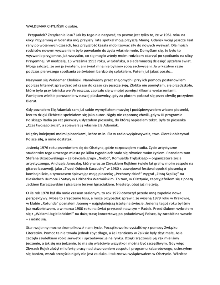 WALDEMAR CHYLIOSKI o sobie. Przypadek? Zrządzenie losu? Jak by tego nie nazywad, to pewne jest tylko to, że w 1951 roku na ulicy Przyjemnej w Gdaosku mój przyszły Tata spotkał moją przyszłą Mamę. Gdaosk wciąż jeszcze lizał rany po wojennych czasach, lecz przyszłośd kazała mobilizowad siły do nowych wyzwao. Dla moich rodziców nowym wyzwaniem było powołanie do życia właśnie mnie. Domyślam się, że było to wyzwanie przyjemne, jak wszystko, co się mogło wtedy moim rodzicom zdarzyd po spotkaniu na ulicy Przyjemnej. W niedzielę, 13 września 1953 roku, w Gdaosku, o siedemnastej dziesięd ujrzałem świat. Mogę założyd, że ani ja światem, ani świat mną nie byliśmy sobą zachwyceni. Ja w każdym razie podczas pierwszego spotkania ze światem bardzo się spłakałem. Potem już jakoś poszło... Nazywam się Waldemar Chylioski. Namówiony przez znajomych i przy ich pomocy postanowiłem poprzez Internet sprawdzad od czasu do czasu czy jeszcze żyję. Żłobka nie pamiętam, ale przedszkole, które było przy lotnisku we Wrzeszczu, zapisało się w mojej pamięci kilkoma wydarzeniami. Pamiętam wielkie poruszenie w naszej piaskownicy, gdy za płotem pokazał się przez chwilę prezydent Bierut. Gdy poznałem Elę Adamiak sam już sobie wymyślałem muzykę i podśpiewywałem własne piosenki, lecz to dzięki Elżbiecie spełniałem się jako autor. Nigdy nie zapomnę chwili, gdy w III programie Polskiego Radia po raz pierwszy usłyszałem piosenkę, do której napisałem tekst. Była to piosenka „Czas twojego życia”, a śpiewała ją właśnie Ela Adamiak. Między kolejnymi moimi piosenkami, które m.in. Ela w radio wyśpiewywała, tow. Gierek obiecywał Polsce siłę, a mnie dostatek. Jesienią 1976 roku przeniosłem się do Olsztyna, gdzie rozpocząłem studia. Życie artystyczne studentów tego uroczego miasta po kilku tygodniach stało się również moim życiem. Poznałem tam Stefana Brzozowskiego – założyciela grupy „Niebo”, Romualda Trębskiego – organizatora życia artystycznego, Andrzeja Janeczkę, który wraz ze Zbyszkiem Rojkiem (wiele lat grał w moim zespole na gitarze basowej), jako „Trzeci Oddech Kaczuchy” w 1980 r. zawojował festiwal opolski piosenką o kombajniście, a tymczasem śpiewając moją piosenkę „Pechowy dzieo” wygrał „Złotą Szpilkę” na Biesiadach Humoru i Satyry w Lidzbarku Warmioskim. To tam, w Olsztynie, zaprzyjaźniłem się z poetą Jackiem Karaszewskim i pisarzem Jerzym Ignaciukiem. Niestety, obaj już nie żyją. O ile rok 1978 był dla mnie czasem szalonym, to rok 1979 otworzył przede mną zupełnie nowe perspektywy. Może to zrządzenie losu, a może przypadek sprawił, że wiosną 1979 roku w Krakowie, w klubie „Rotunda” poznałem Joannę – najpiękniejszą istotę na świecie. Jesienią tegoż roku byliśmy już małżeostwem, a w marcu 1980 roku na świat przyszedł nasz syn – Radek. Przed ślubem wybrałem się z „Wałami Jagiellooskimi” na dużą trasę koncertową po południowej Polsce, by zarobid na wesele – i udało się. Stan wojenny mocno skomplikował nam życie. Początkowo korzystaliśmy z pomocy Związku Literatów. Pomoc ta nie trwała jednak zbyt długo, a że i tantiemy w Zaiksie były zbyt małe, Asia zaczęła szydełkiem robid serwetki i sprzedawad je na rynku. Dzięki zręczności jej rąk mieliśmy jedzenie, a jak się ma jedzenie, to ma się właściwie wszystko i można byd szczęśliwym. Gdy więc Zbyszek Rojek złożył mi ofertę pracy nad stworzeniem zespołu i programu kabaretowego, ucieszyłem się bardzo, wszak szczęścia nigdy nie jest za dużo. I tak znowu wylądowałem w Olsztynie. Wkrótce potem, w 1983 roku powstał przedziwny zespół „Kaczki z Nowej Paczki”. Piszę „przedziwny”, bo wszystko w tym zespole było dziwne. Wszystko się dzieliło i łączyło jednocześnie. Wszyscy dobrze znaliśmy się z czasów studenckich i jednocześnie stawaliśmy się w tym „po-studenckim” życiu coraz bardziej obcy. Mieszanka kabareciarzy, muzyków, kompozytorów, tekściarzy i poetów po kilkudziesięciu próbach gotowa była do wybuchu. Powstanie takiego zespołu, przejechanie z koncertami Polski wzdłuż i wszerz, nagranie płyty, która okazała się złotą (200 000 egz.), zdobycie Grand Prix na Ogólnopolskim Przeglądzie Widowisk Estradowych w Rzeszowie, tryumfalny występ w Opolu, nagranie kilku programów telewizyjnych, prowadzenie autorskiej audycji w III programie Polskiego Radia, to dla takiej posklejanej formacji był wyczyn nie lada. A jednak wbrew moim (i nie tylko moim) obawom „Kaczki...” okazały się sukcesem. Gdy się z zespołem rozstawałem żal mi było ogromnie. Niestety, w tamtym czasie nie miałem innego wyjścia. Czułem odchodząc, że tak jak „Trzeci Oddech Kaczuchy” po odejściu Zbyszka Rojka, tak i ten zespół po moim odejściu, już nigdy tak pięknie nie „wybuchnie”. Moje przeczucie podzielał wówczas jedynie Stefan Brzozowski, który niedługo potem znakomicie poradził sobie zakładając świetny zespół „Czerwony Tulipan”. W niecały rok po wydaniu płyty „A może tylko nam się zdaje” rozpocząłem pracę nad kolejną, tym razem zupełnie nową. Do studia Radia Gdaosk, w którym za stołem realizatorskim zasiedli Michał Mielnik i Jacek Puchalski, wszedłem z takimi muzykami, jak Wojtek Staroniewicz, Maciej Grzywacz, Sławek Jaskułke, Tomek Sowioski, Janusz „Macek” Mackiewicz, Piotr Lemaoczyk, Olo Walicki, Józek Kaniecki i Małgorzata Kuziemska-Sławek. Także Beata Bartelik od początku do kooca była dobrym duchem, gościem specjalnym i twórcą wszystkich drugich, trzecich i czwartych głosów na nowej płycie, na której znalazły się też nowe wersje kilku starych piosenek. Wszystko to działo się przede wszystkim dzięki firmie Merkury S.J. , ale też i spółce SIGNET. Dzięki obu tym warszawskim firmom, tuż przed swoimi pięddziesiątymi urodzinami trzymałem w rękach