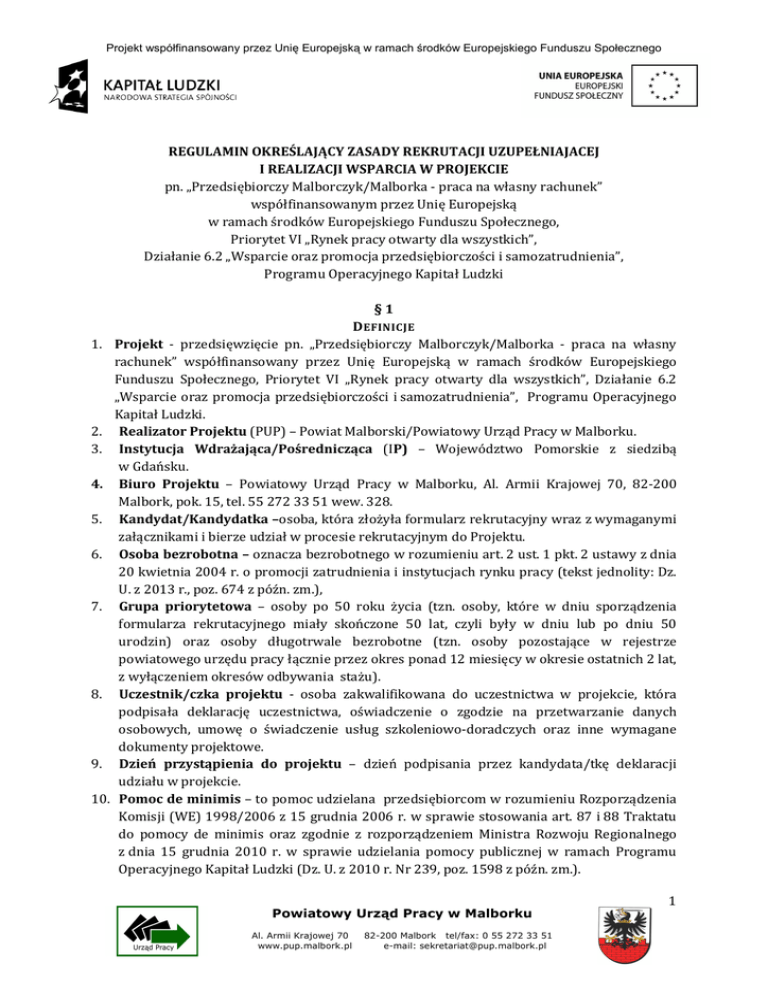 Projekt współfinansowany przez Unię Europejską w ramach środków Europejskiego Funduszu Społecznego REGULAMIN OKREŚLAJĄCY ZASADY REKRUTACJI UZUPEŁNIAJACEJ I REALIZACJI WSPARCIA W PROJEKCIE pn. „Przedsiębiorczy Malborczyk/Malborka - praca na własny rachunek” współfinansowanym przez Unię Europejską w ramach środków Europejskiego Funduszu Społecznego, Priorytet VI „Rynek pracy otwarty dla wszystkich”, Działanie 6.2 „Wsparcie oraz promocja przedsiębiorczości i samozatrudnienia”, Programu Operacyjnego Kapitał Ludzki §1 D EFINICJE 1. Projekt - przedsięwzięcie pn. „Przedsiębiorczy Malborczyk/Malborka - praca na własny rachunek” współfinansowany przez Unię Europejską w ramach środków Europejskiego Funduszu Społecznego, Priorytet VI „Rynek pracy otwarty dla wszystkich”, Działanie 6.2 „Wsparcie oraz promocja przedsiębiorczości i samozatrudnienia”, Programu Operacyjnego Kapitał Ludzki. 2. Realizator Projektu (PUP) – Powiat Malborski/Powiatowy Urząd Pracy w Malborku. 3. Instytucja Wdrażająca/Pośrednicząca (IP) – Województwo Pomorskie z siedzibą w Gdańsku. 4. Biuro Projektu – Powiatowy Urząd Pracy w Malborku, Al. Armii Krajowej 70, 82-200 Malbork, pok. 15, tel. 55 272 33 51 wew. 328. 5. Kandydat/Kandydatka –osoba, która złożyła formularz rekrutacyjny wraz z wymaganymi załącznikami i bierze udział w procesie rekrutacyjnym do Projektu. 6. Osoba bezrobotna – oznacza bezrobotnego w rozumieniu art. 2 ust. 1 pkt. 2 ustawy z dnia 20 kwietnia 2004 r. o promocji zatrudnienia i instytucjach rynku pracy (tekst jednolity: Dz. U. z 2013 r., poz. 674 z późn. zm.), 7. Grupa priorytetowa – osoby po 50 roku życia (tzn. osoby, które w dniu sporządzenia formularza rekrutacyjnego miały skończone 50 lat, czyli były w dniu lub po dniu 50 urodzin) oraz osoby długotrwale bezrobotne (tzn. osoby pozostające w rejestrze powiatowego urzędu pracy łącznie przez okres ponad 12 miesięcy w okresie ostatnich 2 lat, z wyłączeniem okresów odbywania stażu). 8. Uczestnik/czka projektu - osoba zakwalifikowana do uczestnictwa w projekcie, która podpisała deklarację uczestnictwa, oświadczenie o zgodzie na przetwarzanie danych osobowych, umowę o świadczenie usług szkoleniowo-doradczych oraz inne wymagane dokumenty projektowe. 9. Dzień przystąpienia do projektu – dzień podpisania przez kandydata/tkę deklaracji udziału w projekcie. 10. Pomoc de minimis – to pomoc udzielana przedsiębiorcom w rozumieniu Rozporządzenia Komisji (WE) 1998/2006 z 15 grudnia 2006 r. w sprawie stosowania art. 87 i 88 Traktatu do pomocy de minimis oraz zgodnie z rozporządzeniem Ministra Rozwoju Regionalnego z dnia 15 grudnia 2010 r. w sprawie udzielania pomocy publicznej w ramach Programu Operacyjnego Kapitał Ludzki (Dz. U. z 2010 r. Nr 239, poz. 1598 z późn. zm.). 1 Powiatowy Urząd Pracy w Malborku Al. Armii Krajowej 70 www.pup.malbork.pl 82-200 Malbork tel/fax: 0 55 272 33 51 e-mail: [email protected] Projekt współfinansowany przez Unię Europejską w ramach środków Europejskiego Funduszu Społecznego 11. Wykonawca – podmiot, któremu Beneficjent zlecił wykonanie poszczególnych zadań lub czynności w ramach Projektu. 12. Komisja rekrutacyjna – należy przez to rozumieć 3 osobowy zespół powołany przez Dyrektora Powiatowego Urzędu Pracy w Malborku stosownym zarządzeniem dokonujący kwalifikacji Kandydatów/Kandydatek do projektu, w tym: formalnie i merytorycznie oceniający przedłożone przez nich w odpowiedzi na prowadzony nabór formularze rekrutacyjne i badający ich predyspozycje do prowadzenia działalności gospodarczej. 13. Działalność gospodarcza – oznacza to działalność w rozumieniu przepisów ustawy z dnia 02 lipca 2004r. o swobodzie działalności gospodarczej (t.j. Dz. U. z 2010r., poz. 1447 z późn. zm.). 14. Przeciętnym wynagrodzeniu – oznacza to przeciętne wynagrodzenie w poprzednim kwartale, od pierwszego dnia następnego miesiąca po ogłoszeniu przez Prezesa Głównego Urzędu Statystycznego w Dzienniku Urzędowym Rzeczypospolitej Polskiej "Monitor Polski", na podstawie art. 20 pkt. 2 ustawy z dnia 17 grudnia 1998 r. o emeryturach i rentach z Funduszu Ubezpieczeń Społecznych (Dz. U. z 2004r. poz.353 z późn. zm.). 15. Indywidualny Plan Działania (IPD) – oznacza to plan działań obejmujący podstawowe usługi rynku pracy wspierane instrumentami rynku pracy w celu zatrudnienia bezrobotnego, w przypadku niniejszego Projektu w celu podjęcia samozatrudnienia przez osobę bezrobotną. §2 POSTANOWIENIA OGÓLNE 1. Niniejszy regulamin określa zasady rekrutacji uzupełniającej, kryteria kwalifikowalności oraz warunki uczestnictwa w projekcie pn. „Przedsiębiorczy Malborczyk/Malborka - praca na własny rachunek”. 2. Zgodnie z zapisami Szczegółowego Opisu Priorytetów Programu Operacyjnego 2007 – 2013 z dnia 1 stycznia 2012 r. zaakceptowanego przez Ministerstwo Rozwoju Regionalnego i obowiązującymi wytycznymi Instytucji Zarządzającej, Powiatowy Urząd Pracy w Malborku realizuje projekt w zakresie zgodnym z ustawą o promocji zatrudnienia i instytucjach rynku pracy (tekst jedn.: Dz.U. z 2013 r., poz. 674 z późn. zm.) i przepisami rozporządzenia Ministra Pracy i Polityki Społecznej z dnia 23 kwietnia 2012 r. w sprawie dokonywania z Funduszu Pracy refundacji kosztów wyposażenia lub doposażenia stanowiska pracy dla skierowanego bezrobotnego oraz przyznawania środków na podjęcie działalności gospodarczej (Dz. U. z 2012 r. poz. 457). 1. 2. 3. §3 INFORMACJE O PROJEKCIE Projekt „Przedsiębiorczy Malborczyk/Malborka - praca na własny rachunek” realizowany jest przez Powiat Malborski/Powiatowy Urząd Pracy w Malborku. Projekt jest współfinansowany przez Unię Europejską w ramach środków Europejskiego Funduszu Społecznego. Celem projektu jest „wzrost do 04.15 r. poziomu samozatrudnienia na terenie powiatu malborskiego poprzez udzielenie kompleksowego wsparcia 28 bez