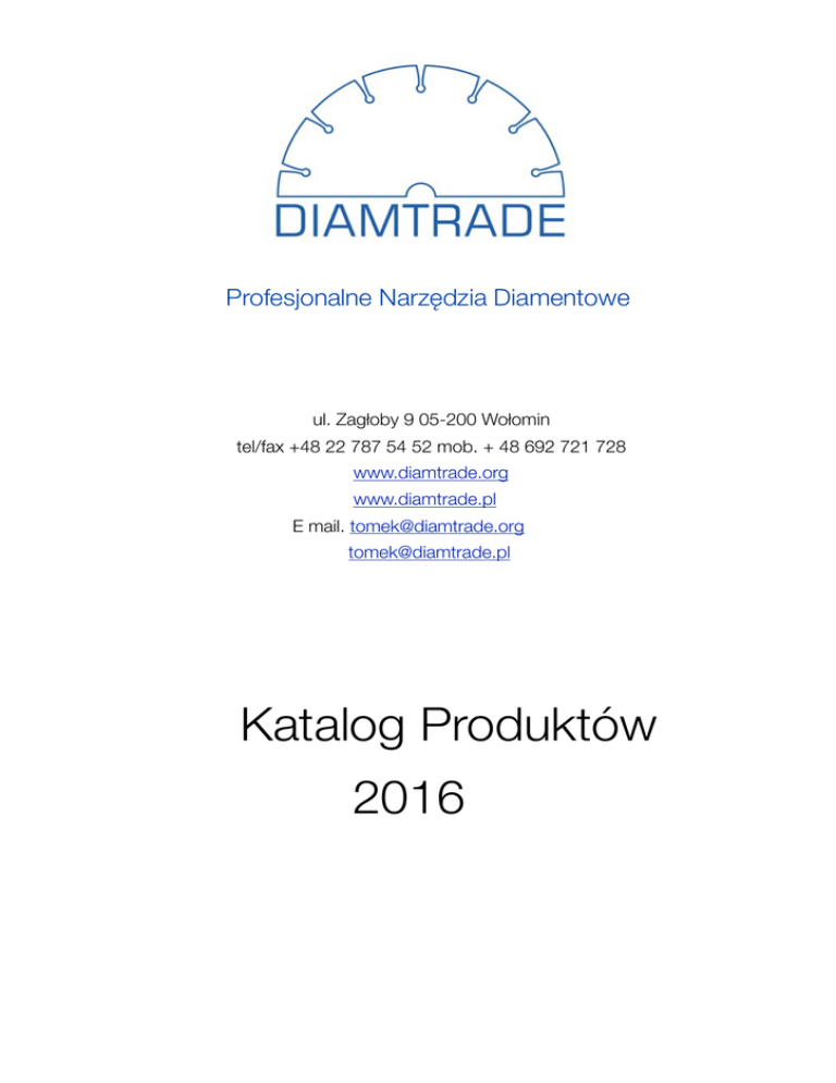Profesjonalne Narzędzia Diamentowe ul. Zagłoby 9 05-200 Wołomin tel/fax +48 22 787 54 52 mob. + 48 692 721 728 www.diamtrade.org www.diamtrade.pl E mail. [email protected] [email protected] Katalog Produktów 2016 Laser Beton Universal Średnica Segment Mocowanie 115 10 mm 22,23 125 10 mm 22,23 150 230 10 mm 10 mm 22,23 22,23 300 350 10 mm 10 mm 20/25,4 20/25,4 Zaprojektowana specjalnie dla optymalnego ciecia w materiałach budowlanych. Zastosowanie: Cegła, bloczki betonowe, beton, materiały ogólnobudowlane . Asfafight Średnica 300 350 Segment 10 mm 10 mm Mocowanie 20/25,4 20/25,4 Segmenty Slant zapewniają skuteczną ochronę podczas cięcia materiałów ściernych. Przecinarki do 13 km. Zastosowanie: Asfalt, asfalt na betonie, wapien. LFU Beton Zbrojony Średnica 300 350 400 450 500 600 Segment 12 mm 12 mm 12 mm Mocowanie 25,4/20 25,4/20 25,4/20 12 mm 12 mm 12 mm 25,4 25,4 25,4 Specyfikacja techniczna: Bardzo wąskie szczeliny i wysokiej jakości spiek, zapewniając szybkie, sprawne i długie cięcia. Przecinarki do 20 hp. Zastosowanie: Beton, beton zbrojony. 2 # Marathone Średnica 125 230 Segment 12 mm 12 mm Mocowanie 22,2 22,2 Zastosowanie : Beton zbrojony, granit PDA Średnica Segment 230 300 350 12 mm 12 mm 12 mm Mocowanie 22,2 20/25,4 20/25,4 PDA to tarcze wykonane w nowej technologi. Diamenty są poukładane dzięki zastosowaniu specjalnej matrycy w czasie spiekania. Technologia ta zwiększa żywotność tarczy o około 70 % przy jednoczesnym zwiększeniu prędkości o około 30 %. Zastosowanie: beton, beton zbrojony, granit. Asfamax Średnica Segment Mocowanie 350 400 450 12 mm 12 mm 12 mm 25,4/20 25,4/20 25,4 500 600 12 mm 12 mm 25,4 25,4 Specyfikacja techniczna: Bardzo wąskie szczeliny i wysokiej jakości spiek, zapewniając szybkie, sprawne i długie cięcia. Przecinarki do 20 hp. Zastosowanie: Asfalt, asfalt na betonie, świeży beton z włóknem stalowym. 3 # Laser PDA Fresh Conrete Średnica Segment 300 12 mm 350 12 mm Mocowanie 25,4 25,4 Zastosowanie: Tarcza PDA do świeżego betonu przecinarki do 25 KM. Technologia poukładanego diamentu. Mixtar Średnica 230 300 350 400 Segment 10 mm 10 mm 10 mm 10 mm Mocowanie 22,2 20 20/25,4 20/25,4 Specyfikacja:Tarcza specjalnie wyprodukowana do prac w budynkach. «K otwory» maja poprawić chłodzenie w czasie cięcia. Przecinarki drogowe i ręczne.. Zastosowanie: beton, asfalt, stal, miękki granit i materiały ogniotrwałe. Porcelanto Średnica 115 125 150 180 200 230 250 300 350 Segment 8 mm 8 mm 10 mm 10 mm 10 mm 10 mm 10 mm 10 mm 10 mm Mocowanie 22,2 22,2 25,4/22,2 25,4/22,2 25,422,2 22,2 25,4/22,2 25,4 25,4 Specyfikacja techniczna: matryca opracowana typowo dla profesjonalnych wykonawców. Szybki i długi okres cięcia doskonałe wykończenie. FEPA D 181 Zastosowanie: Płyty granitowe i marmurowe, porcelana 4 # Silentek Średnica 150 180 200 230 250 300 350 Segment 10 mm 10 mm 10 mm 10 mm 10 mm 10 mm 10 mm Mocowanie 25,4/22,2 25,4/22,2 25,4/22,2 25,4/22,2 25,4/22,2 25,4/22,2 25,4/22,2 Specyfikacja techniczna: Zaprojektowana z cienką obręczą z myślą o szybkim i precyzyjnym cięciu. Cięcie laserowe typu C przechodzące przez obręcz tarczy odciąża korpus tarczy przez co daje uniknąć chwiania się tarczy podczas cięcia. FEPA D252 Zastosowanie: Marmur, kamień naturalny. KQ Granit Średnica 300 350 Segment 10 mm 10 mm 400 10 mm Mocowanie 25,4 /20 25,4/20 25,4/20 Specyfikacja: Specjalnie zaprojektowane ostrza dla profesjonalnych ciężkich prac. Maksymalizację prędkości i długości cięcia. Otwory pozwalają na szybkie chłodzenie. Double Row Średnica 105 115 125 180 Segment 5 mm 5 mm 5 mm 5 mm Mocowanie 22,2 22,2 22,2 22,2 Specyfikacja: DR z podwójnym segmentem diamentowym. SR z pojedynczym segmentem diamentowym. Zastosowanie: beton , lastryka. 5 # Casting Beton Średnica 105 115 125 180 Segment 5 mm 5 mm 5 mm 5 mm Mocowanie 22,2 22,2 22,2 22,2 Specyfikacja: specjalne zaprojektowana podstawa i segmenty w kształcie litery L zapewniają automatyczne usuwanie urobku . Szybkie szlifowanie. Zastosowanie beton utwardzony. żywiczny. Dynamic Beton Średnica 105 125 150 180 Segment 5 mm 5 mm 5 mm 5 mm Mocowanie 22,2 22,2 22,2 22,2 Specyfikacja:Specjalnie zaprojektowane tarcza szlifierska do pracy w dwóch kierunkach, z lekkim rdzeniem, do szybkiego szlifowania na maksymalnej powierzchni w połączeniu z wysoką wydajnością usuwania urobku. Zastosowanie: beton, granit. DGWL 150 Typ Hilti Średnica Segment 150 mm 5 mm Mocowanie HILTI 19 mm Zastosowanie: beton utwardzony , żywiczny. 6 # Fight Grind Średnica 105 115 125 180 Segment 5 mm 5 mm 5 mm 5 mm Mocowanie 22,2 22,2 22,2 22,2 Specyfikacja: typ koła Turbo składający się wielu segmentów do szybkiego szlifowania i długiej żywotności. Dedykowany dla profesjonalnych wykonawców i intensywnej pracy.Zastosowanie: beton utwardzony , żywiczny, lastryka, granit. Indusgrind 250 Talerz szlifujący do maszyn typu Blastrack 250xL40xH10mm Złoty miękki spiek do twardego betonu 20 segmentów cena Zielony twardy spiek do świeżego betonu 20 segmentów cena Specyfikacja: Tarcza zaprojektowana do szlifowania . Inne rodzaje mocowań dostępne na życzenie.Zastosowanie: do betonu, usuwanie farby, 1 etap szlifowania lastryko na bazie żywic. Arrow Grind Nowość 250 x H10 x 19mm Pośredni spiek do twardego i miękkiego betonu strzałka zaprojektowana do agresywnego szlifowania 7 # Frez Dylatacyjny Tuck Point Średnica 115 125 180 Segment 10 mm 10 mm 10 mm Szerokość 6,35 mm 6,35 mm 6,35 mm Mocowanie 22,2 22,2 22,2 Specyfikacja techniczna: Spiek przeznaczony do szybkiego cięcia. Zastosowanie: beton, cegły, fugi. Activ Tuck Point Średnica 115 125 180 Segment 7 mm 7 mm 7 mm Szerokość 9,5 mm 9,5 mm 9,5 mm Mocowanie 22,2 22,2 22,2 Specyfikacja: Przesunięte segmenty dla większej szerokości rowków. Spiek przeznaczony do szybkiego cięcia. Zastosowanie: beton, cegły, fugi. Crack Chaser frez dylatacyjny V Średnica 115 125 180 Segment 12 mm 12 mm 12 mm Szerokość 9