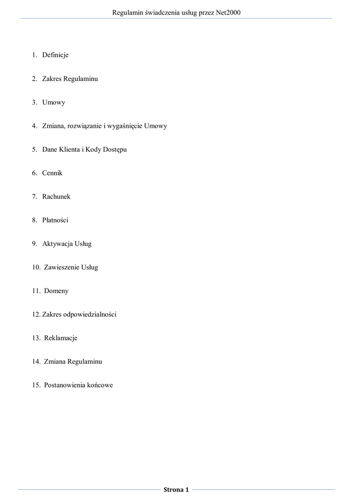 Regulamin świadczenia usług przez Net2000 1. Definicje 2. Zakres Regulaminu 3. Umowy 4. Zmiana, rozwiązanie i wygaśnięcie Umowy 5. Dane Klienta i Kody Dostępu 6. Cennik 7. Rachunek 8. Płatności 9. Aktywacja Usług 10. Zawieszenie Usług 11. Domeny 12. Zakres odpowiedzialności 13. Reklamacje 14. Zmiana Regulaminu 15. Postanowienia końcowe Strona 1 Regulamin świadczenia usług przez Net2000 § 1. Definicje Użyte w niniejszym dokumencie definicje są stosowane i obowiązują we wszelkich dokumentach Net2000, przy czym ewentualne zmiany definicji w innych dokumentach mają pierwszeństwo przed definicjami zawartymi w niniejszym dokumencie. Adres korespondencyjny – adres kontaktowy podany przez Klienta podczas zawierania umowy z Operatorem, w szczególności adres e-mail, na który jest kierowana wszelka korespondencja od Operatora do Klienta Awaria – przerwa w działaniu usługi, z wyłączeniem przerw spowodowanych siłą wyższą, nieprawidłowym działaniem sieci telekomunikacyjnej niezarządzanej przez Operatora, pracami konserwacyjnymi lub przyczynami leżącymi po stronie Klienta. Cennik – dokument o pełnej nazwie „Cennik Usług świadczonych przez NET2000” dostępny pod adresem http://www.net2000.pl/cennik.html, stanowiący podstawę do aktualnej wyceny usługi i wystawienia rachunku dla Klienta. Domena – unikalny ciąg znaków alfanumerycznych dostępnych do rejestracji, składający się z nazwy oraz rozszerzenia oferowanego przez danego Rejestratora Domen. Klient – osoba fizyczna, osoba prawna lub jednostka organizacyjna nieposiadająca osobowości prawnej utworzona zgodnie z przepisami prawa, będąca stroną Umowy. Kod dostępu – unikalna poufna kombinacja użytkownika i hasła przekazana przez Operatora wyłącznie Klientowi, potwierdzające jednoznacznie tożsamość Klienta podczas dokonywania zdalnych operacji związanych z usługą - w szczególności za pomocą panela administracyjnego. Kwota rachunku minimalnego – 50 zł netto. Okres rozliczeniowy – okres czasu za który dokonywane są rozliczenia należności Klienta wobec Operatora z tytułu świadczonych usług, rozpoczynający i kończący się w dniach wskazanych przez Operatora na rachunku lub w umowie. Operator – stosowany zamiennie również w skrócie Net2000 podmiot świadczący usługi drogą elektroniczną zgodnie z postanowieniami regulaminu Net2000 Janina Jackowska ul. Orzeszkowej 9A/4 15-083 Białystok NIP: 542-112-55-46 REGON: 200034814 Opłata wyrównawcza – kwota ulgi przyznanej Klientowi przy zawieraniu umowy, którą Operator może pobrać od Klienta jako ulgę nienależną, w przypadku rozwiązania umowy przed upływem terminu na jaki została zawarta, przez Klienta lub przez Operatora z winy Klienta. Panel administracyjny – bezpłatna usługa zamieszczona na stronach internetowych Operatora za pomocą której Klient w oparciu o unikalny kod dostępu może modyfikować funkcjonowanie innych usług udostępnianych przez Operatora. Strona 2 Regulamin świadczenia usług przez Net2000 Prace konserwacyjne – działania służb technicznych Operatora niezbędne dla zapewnienia prawidłowego działania usługi. Przedstawiciel Operatora – osoba działająca w imieniu i na rzecz Operatora, uprawniona do składania i przyjmowania oświadczeń woli w zakresie zawierania, zmiany lub rozwiązywania umowy, bądź też wykonywania jej postanowień. Rachunek – dokument księgowy będący podstawą dokonywania przez Klienta płatności za usługę świadczoną na jego rzecz przez Operatora. Regulamin – niniejszy dokument - Regulamin Świadczenia Usług przez Net2000. Rejestrator domen – podmiot oferujący usługę rejestracji domen, zarządzający właściwym plikiem strefy odpowiadającym nazwie rejestrowanej domeny. Rejestratorami domen globalnych są podmioty określone w dokumentach ICANN dostępnych pod adresem http://www.icann.org/udrp/udrp.htm. Rejestrację domen polskich prowadzi Naukowa i Akademicka Sieć Komputerowa (NASK) http://www.dns.pl. Sieć Operatora – sieć telekomunikacyjna służąca do świadczenia usług. Specyfikacja usługi – lista podstawowych cech technicznych jakie ma spełniać usługa świadczona w ramach podpisanej przez Operatora i Klienta umowy Transfer Danych – zawarty w specyfikacji określonej usługi limit danych, liczonych na warstwie IP, wysyłanych i odbieranych przez usługę wykupioną przez Klienta, do wykorzystania w okresie rozliczeniowym lub jego części składowej. Umowa – umowa o świadczenie usług zawarta na piśmie pomiędzy Klientem i Operatorem. Usługa – świadczona przez Operatora usługa lub związana z tą usługą usługa dodatkowa. Usługa hostingowa – to usługa polegająca na użyczeniu Klientowi zasobów Operatora, t.j. powierzchni dyskowej na serwerach Operatora oraz transferu danych wraz z wszelkimi usługami dodatkowymi niezbędnymi do spełnienia warunków określonych w specyfikacji usługi. Ustawa – ustawa z dnia 16 lipca 2004 r. Prawo telekomunikacyjne (Dz. U. Nr 171 poz. 1800 z późn. zm.). Zawieszenie usługi – okresowe zaprzestanie świadczenia Klientowi usługi lub jej elementów, w szczególności usług dodatkowych. § 2. Zakres Regulaminu 1. Regulamin określa zasady świadczenia usług przez Operatora. 2. Postanowienia innych dokumentów sygnowanych przez Operatora odmienne od postanowień zawartych w regulaminie, znajdują pierwszeństwo przed postanowieniami regulaminu. 3. Operator może wprowadzić odrębne regulaminy dla świadczonych przez siebie usług, w szczególności związane z akcjami promocyjnymi. 4. Rejestracja wszelkich usług Operatora jest jednoznaczna z akceptacją niniejszego regulaminu. Strona 3 Regulamin świadczenia usług przez Net2000 § 3. Umowy 1. Umowa zawierana jest na czas nieokreślony, chyba że Operator w trybie aktywacji usługi postanowi inaczej. 2. Umowa zawarta na czas ściśle określony, po upływie okresu, na jaki została zawarta, ulega au