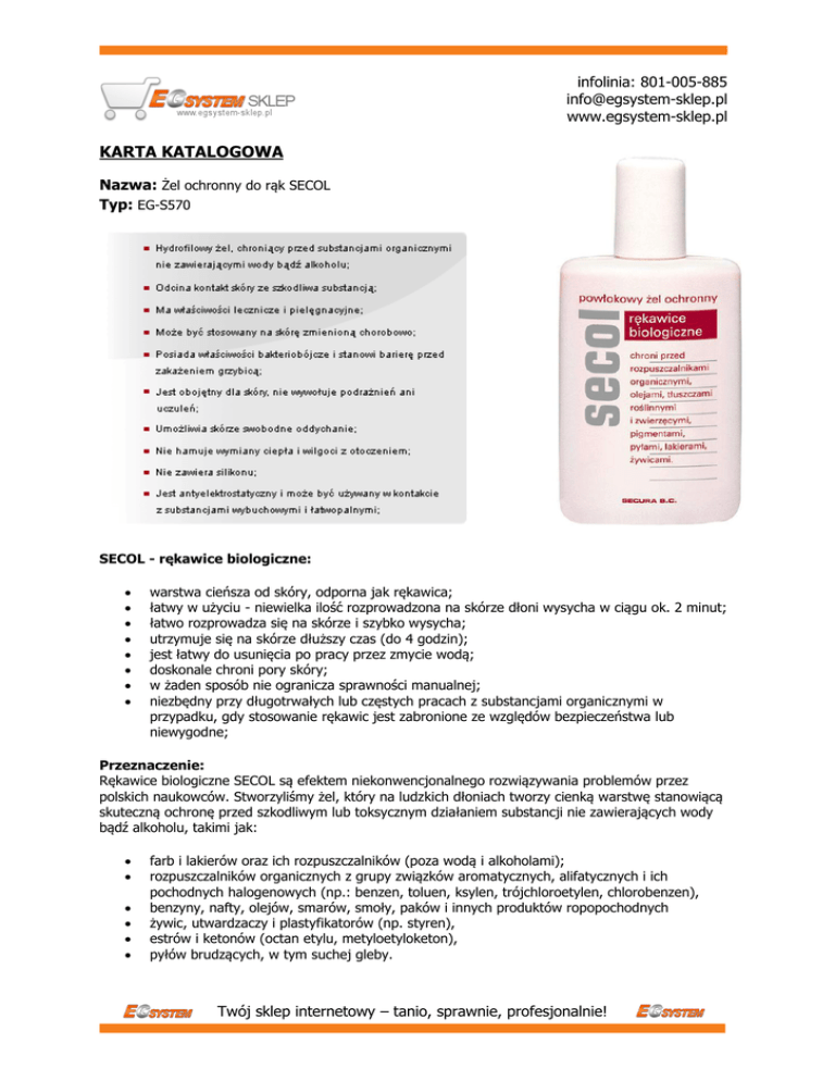 infolinia: 801-005-885 [email protected] www.egsystem-sklep.pl KARTA KATALOGOWA Nazwa: Żel ochronny do rąk SECOL Typ: EG-S570 SECOL - rękawice biologiczne: warstwa cieńsza od skóry, odporna jak rękawica; łatwy w użyciu - niewielka ilość rozprowadzona na skórze dłoni wysycha w ciągu ok. 2 minut; łatwo rozprowadza się na skórze i szybko wysycha; utrzymuje się na skórze dłuższy czas (do 4 godzin); jest łatwy do usunięcia po pracy przez zmycie wodą; doskonale chroni pory skóry; w żaden sposób nie ogranicza sprawności manualnej; niezbędny przy długotrwałych lub częstych pracach z substancjami organicznymi w przypadku, gdy stosowanie rękawic jest zabronione ze względów bezpieczeństwa lub niewygodne; Przeznaczenie: Rękawice biologiczne SECOL są efektem niekonwencjonalnego rozwiązywania problemów przez polskich naukowców. Stworzyliśmy żel, który na ludzkich dłoniach tworzy cienką warstwę stanowiącą skuteczną ochronę przed szkodliwym lub toksycznym działaniem substancji nie zawierających wody bądź alkoholu, takimi jak: farb i lakierów oraz ich rozpuszczalników (poza wodą i alkoholami); rozpuszczalników organicznych z grupy związków aromatycznych, alifatycznych i ich pochodnych halogenowych (np.: benzen, toluen, ksylen, trójchloroetylen, chlorobenzen), benzyny, nafty, olejów, smarów, smoły, paków i innych produktów ropopochodnych żywic, utwardzaczy i plastyfikatorów (np. styren), estrów i ketonów (octan etylu, metyloetyloketon), pyłów brudzących, w tym suchej gleby. Twój sklep internetowy – tanio, sprawnie, profesjonalnie! infolinia: 801-005-885 [email protected] www.egsystem-sklep.pl Niektóre z nich powodują tworzenie i wzrost komórek zrogowaciałych (rozpuszczalniki rozpuszczające tłuszcze i przenikające przez skórę: benzyna, nafta, trójchloroetylen, benzen, octan etylu, a także ropa i produkty destylacji węgla) inne wykazują działanie rakotwórcze (żywice, farby, lakiery, smary, oleje, pigmenty, czterochlorek węgla, hydrazyna i dwuchloroetylen). Rozpuszczalniki organiczne używane są powszechnie w wielu gałęziach przemysłu, głównie chemicznym, petrochemicznym, metalurgicznym. Ocenia się, że 95% wszystkich reakcji chemicznych przebiega w roztworach rozpuszczalników: stosowane są do odtłuszczania powierzchni metalowych przed lakierowaniem czy galwanizacją, służą jako przenośniki ciśnienia w systemach hydraulicznych, znajdują zastosowanie w procesach flotacji, używane są jako środki piorące, plastyfikatory, rozcieńczalniki farb i lakierów itp. Szkodliwe działanie rozpuszczalników na skórę ludzką polega na rozpuszczeniu przez nie ochronnej powłoki tłuszczowej, jak również frakcji tłuszczowej błon komórkowych. Odtłuszczona skóra łatwo wchłania rozpuszczalniki. Mechanizm działania rozpuszczalników organicznych na skórę ludzką nie jest dokładnie poznany. Wiadomo, że skóra jest łatwo przepuszczalna dla substancji toksycznych. Wchłanianie rozpuszczalników przez skórę jest tak znaczne, że wchłonięte ilości dwusiarczku węgla przez powierzchnię jednej dłoni w czasie 1 godziny mogą przewyższać ilości wchłaniane przez płuca w czasie zmiany roboczej przy stężeniu w powietrzu rzędu normy przemysłowej. Rozpuszczalniki mogą wchłaniać się przez skórę także w postaci par. Wchłanianie rozpuszczalników przez skórę zależy od warunków mikroklimatycznych, zwiększa się ze wzrostem temperatury i wilgotności. W Centralnym Instytucie Ochrony Pracy poddano badaniom laboratoryjnym nasz żel ochronny w celu porównania go z innymi rodzajami środków ochrony rąk. Do badań użyto następujących rozpuszczalników: octanu etylu, toluenu, izooktanu, benzyny, benzenu, trójchloroetylenu. Żele, które tworzą powłoki bada się w sposób identyczny, jak rękawice ochronne, w oparciu o normę europejską PN-EN 374 "Rękawice chroniące przed chemikaliami i mikroorganizmami. Ark 3. Określenie odporności na przenikanie chemikaliów". Przepuszczalność rozpuszczalników organicznych przez SECOL i inne środki ochronne pochodzenia zagranicznego określano metodą chromatografii gazowej przy użyciu chromatografu firmy UNICAM typ 610. Uzyskane wyniki przesiąkliwości rozpuszczalników podano w poniższej tabeli. Tab.1. Przesiąkliwość rozpuszczalników organicznych przez warstwy różnych środków ochrony skóry. Rodzaj środka ochrony skóry Przesiąkliwość w [ min ]) Octan etylu Toluen Izooktan SECOL >240 >240 >240 Krem A 1,56 0,08 0,48 Krem B 2,00 0,60 1,24 Krem C 2,32 1,00 3,20 Krem D 3,44 2,64 36,88 Wyniki badań laboratoryjnych wykazują na ogromną przewagę SECOLU nad innymi preparatami zagranicznymi, zalecanymi jako ochrona skóry przed rozpuszczalnikami organicznymi. Przesiąkliwość rozpuszczalników przez warstwę SECOLU jest znacznie mniejsza, niż przez inne ochrony rąk (tab.1.). Rozpuszczalniki organiczne naniesione na warstwę SECOLU nie przesiąkają przez nią aż do wyparowania. Inne wyniki badań laboratoryjnych wykazały, że odporność błony SECOLU na działanie rozpuszczalników organicznych jest zbliżona do odporności rękawic z polialkoholu winylowego, całkowicie odpornych na działanie benzenu, toluenu, trójchloroetylenu i innych. Badanym parametrem była przepuszczalność rozpuszczalników przez SECOL i rękawice ochronne wykonane z innych materiałów. Wyniki obrazuje tab.2 Twój sklep internetowy – tanio, sprawnie, profesjonalnie! infolinia: 801-005-885 [email protected] www.egsystem-sklep.pl Tab.2 Przepuszczalność rozpuszczalników przez SECOL i rękawice ochronne wykonane z innych materiałów. PRZEPUSZCZALNOŚĆ (%) Rozpuszczalnik benzyna trójchloroetylen benzen octan etylu SECOL 5.92 4.72 6.15 3.83 Rękawice z kauczuku naturalnego 99.02 99.96 99.96 98.88 Rękawice z kauczuku poliakrylonitrylowego 7.66 99.69 99.50 99.82 Rękawice z polichlorku winylu 53.82 81.74 57.80 rozkład Rękawice z polialkoholu winy