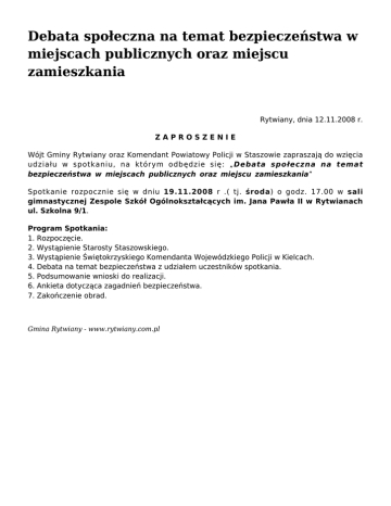 Debata społeczna na temat bezpieczeństwa w miejscach publicznych oraz miejscu zamieszkania Rytwiany, dnia 12.11.2008 r. ZAPROSZENIE Wójt Gminy Rytwiany oraz Komendant Powiatowy Policji w Staszowie zapraszają do wzięcia udziału w spotkaniu, na którym odbędzie się: „Debata społeczna na temat bezpieczeństwa w miejscach publicznych oraz miejscu zamieszkania” Spotkanie rozpocznie się w dniu 19.11.2008 r .( tj. środa) o godz. 17.00 w sali gimnastycznej Zespole Szkół Ogólnokształcących im. Jana Pawła II w Rytwianach ul. Szkolna 9/1. Program Spotkania: 1. Rozpoczęcie. 2. Wystąpienie Starosty Staszowskiego. 3. Wystąpienie Świętokrzyskiego Komendanta Wojewódzkiego Policji w Kielcach. 4. Debata na temat bezpieczeństwa z udziałem uczestników spotkania. 5. Podsumowanie wnioski do realizacji. 6. Ankieta dotycząca zagadnień bezpieczeństwa. 7. Zakończenie obrad. Gmina Rytwiany - www.rytwiany.com.pl