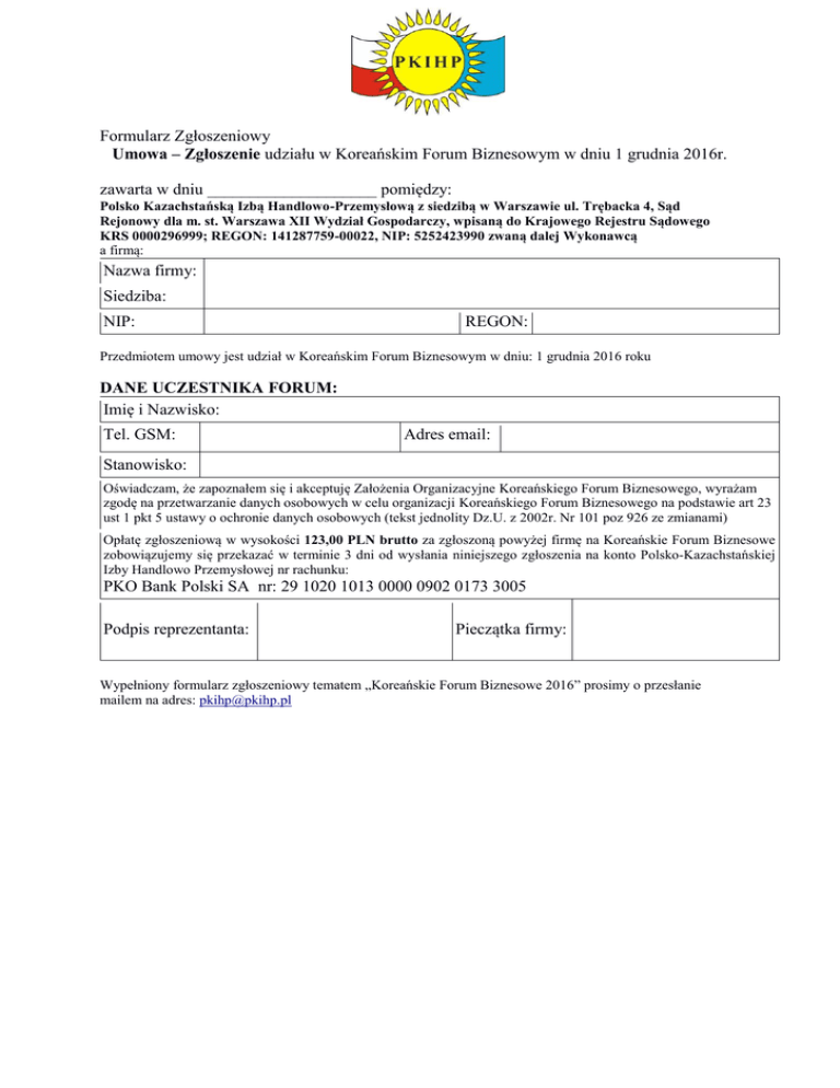 Formularz Zgłoszeniowy Umowa – Zgłoszenie udziału w Koreańskim Forum Biznesowym w dniu 1 grudnia 2016r. zawarta w dniu ____________________ pomiędzy: Polsko Kazachstańską Izbą Handlowo-Przemysłową z siedzibą w Warszawie ul. Trębacka 4, Sąd Rejonowy dla m. st. Warszawa XII Wydział Gospodarczy, wpisaną do Krajowego Rejestru Sądowego KRS 0000296999; REGON: 141287759-00022, NIP: 5252423990 zwaną dalej Wykonawcą a firmą: Nazwa firmy: Siedziba: NIP: REGON: Przedmiotem umowy jest udział w Koreańskim Forum Biznesowym w dniu: 1 grudnia 2016 roku DANE UCZESTNIKA FORUM: Imię i Nazwisko: Tel. GSM: Adres email: Stanowisko: Oświadczam, że zapoznałem się i akceptuję Założenia Organizacyjne Koreańskiego Forum Biznesowego, wyrażam zgodę na przetwarzanie danych osobowych w celu organizacji Koreańskiego Forum Biznesowego na podstawie art 23 ust 1 pkt 5 ustawy o ochronie danych osobowych (tekst jednolity Dz.U. z 2002r. Nr 101 poz 926 ze zmianami) Opłatę zgłoszeniową w wysokości 123,00 PLN brutto za zgłoszoną powyżej firmę na Koreańskie Forum Biznesowe zobowiązujemy się przekazać w terminie 3 dni od wysłania niniejszego zgłoszenia na konto Polsko-Kazachstańskiej Izby Handlowo Przemysłowej nr rachunku: PKO Bank Polski SA nr: 29 1020 1013 0000 0902 0173 3005 Podpis reprezentanta: Pieczątka firmy: Wypełniony formularz zgłoszeniowy tematem „Koreańskie Forum Biznesowe 2016” prosimy o przesłanie mailem na adres: [email protected]