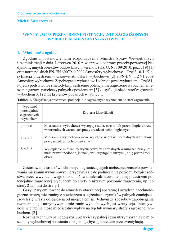 Ochrona przeciwwybuchowa Michał Świerżewski WENTYLACJA PRZESTRZENI POTENCJALNIE ZAGROŻONYCH WYBUCHEM MIESZANIN GAZOWYCH 1. Wiadomości ogólne Zgodnie z postanowieniami rozporządzenia Ministra Spraw Wewnętrznych i Administracji z dnia 7 czerwca 2010 r. w sprawie ochrony przeciwpożarowej budynków, innych obiektów budowlanych i terenów (Dz. U. Nr 109/2010. poz. 719) [1] oraz norm polskich PN-EN 60079-1:2009 Atmosfery wybuchowe – Część 10-1: Klasyfikacja przestrzeni – Gazowe atmosfery wybuchowe [2] i PN-EN 1127-1:2009 Atmosfery wybuchowe. Zapobieganie wybuchowi i ochrona przed wybuchem – Część 1: Pojęcia podstawowe i metodyka przestrzenie potencjalnie zagrożone wybuchem mieszanin gazów i par cieczy palnych z powietrzem [3] klasyfikuje się do stref zagrożenia wybuchem 0, 1 i 2 wg kryteriów podanych w tablicy 1. Tablica 1. Klasyfikacja przestrzeni potencjalnie zagrożonych wybuchem do stref zagrożenia Typy stref potencjalnie zagrożonych wybuchem Kryteria klasyfikacji Strefa 0 Mieszanina wybuchowa występuje stale, często lub przez długie okresy w normalnych warunkach pracy urządzeń technologicznych Strefa 1 Mieszanina wybuchowa może wystąpić w czasie normalnych warunków pracy urządzeń technologicznych Strefa 2 Wystąpienie mieszaniny wybuchowej w normalnych warunkach pracy jest mało prawdopodobne, jednak jeżeli wystąpi to utrzymuje się przez krótki okres Zastosowanie środków ochronnych ograniczających niebezpieczeństwo powstawania mieszanin wybuchowych przyczynia się do podniesienia poziomu bezpieczeństwa przeciwwybuchowego oraz umożliwia zakwalifikowanie danej przestrzeni potencjalnie zagrożonej wybuchem do strefy o niższym poziomie zagrożenia, np. do strefy 2 zamiast do strefy 1. Gazy i pary emitowane do atmosfery otaczającej aparaturę i urządzenia technologiczne tworzą mieszaniny z powietrzem o stężeniach czynników palnych zmniejszających się wraz z odległością od miejsca emisji. Jednym ze sposobów zapobiegania tworzeniu się i utrzymywaniu mieszanin wybuchowych jest wentylacja. Intensywność wietrzenia może mieć istotny wpływ na typ lub wymiary strefy zagrożonej wybuchem. [2 ] Rozmiary chmury palnego gazu lub par cieczy palnej i czas utrzymywania się mieszaniny wybuchowej po ustaniu emisji mogą być ograniczane przez wentylację. 64 Ochrona przeciwwybuchowa Rozróżnia się następujące główne rodzaje wentylacji: · wentylację naturalną, · wentylację sztuczną ogólną, · wentylację sztuczną miejscową. Istnieją również przestrzenie niewentylowane. Wentylacja naturalna jest wywoływana ruchami naturalnymi powietrza pod wpływem różnic temperatur, ciśnień lub wiatru. Na zewnątrz budynków wentylacja naturalna jest często wystarczająca do rozrzedzenia mieszaniny czynników palnych z powietrzem i zapobiegania powstawaniu mieszanin wybuchowych. Wentylacja naturalna może być również efektywna w budynkach, pod warunkiem wykonania w ścianach i sufitach otworów o wystarczających rozmiarach. Na zewnątrz budynków przy ocenie wietrzenia (wentylacji) zakłada się zazwyczaj stałą minimalną prędkość wiatru 0,5 m/s choć często przekracza ona 2 m/s. Przykładem wentylacji naturalnej urządzeń technologicznych na zewnątrz budynków mogą być typowe dla przemysłu chemicznego i petrochemicznego instalacje na estakadach. Wentylacja sztuczna. Ruch powietrza przy wentylacji sztucznej uzyskiwany jest za pomocą wentylatorów nawiewnych i wyciągowych. Wentylację sztuczną stosuje się najczęściej w pomieszczeniach i przestrzeniach przeznaczonych na stały lub okresowy pobyt ludzi. Niekiedy wentylacja sztuczna stosowana jest również na zewnątrz budynków, gdzie konieczne jest kompensowanie niedostatecznie skutecznej wentylacji naturalnej. Wentylacja sztuczna może obejmować całe pomieszczenie lub jego fragmenty albo poszczególne stanowiska pracy, wtedy mówi się o wentylacji miejscowej. Za pomocą wentylacji sztucznej można uzyskiwać: ograniczenie rozmiarów strefy zagrożonej wybuchem, ograniczenie czasu występowania mieszaniny wybuchowej oraz, co jest najważniejsze, zapobiegać powstawaniu i utrzymywaniu się mieszanin wybuchowych oraz przekraczaniu NDS (najwyższych dopuszczalnych stężeń). Wentylacja sztuczna przestrzeni potencjalnie zagrożonych wybuchem powinna spełniać następujące warunki: · każde pomieszczenie powinno mieć osobną wentylację wyciągową, · kierunki odciągania i nawiewu powietrza powinny być zgodne z gęstością względną występujących czynników palnych – przy występowaniu par cieczy palnych i gazów cięższych od powietrza, powietrze powinno być odciągane z nad podłogi pomieszczenia, zaś nawiewane pod sufitem, przy występowaniu gazów lżejszych od powietrza odwrotnie, · powietrze do nawiewu powinno być czerpane z przestrzeni zewnętrznych niezagrożonych wybuchem, · powietrze odciągane powinno być wydalane do przestrzeni zewnętrznych niezagrożonych wybuchem z innych przyczyn niż wyrzut zanieczyszczonego powietrza, · przestrzeń w miejscu wyrzutu zanieczyszczonego powietrza powinna być klasyfikowana do odpowiedniej strefy zagrożenia wybuchem, · przy projektowaniu wentylacji należy brać pod uwagę stopień emisji czynników palnych, Nr 153 65 Ochrona przeciwwybuchowa · w przestrzeniach zagrożonych wybuchem przeznaczonych na stały pobyt ludzi wentylacja podstawowa powinna zapewnić utrzymanie stężeń czynników palnych na poziomie niższym od NDS, · w przestrzeniach zagrożonych wybuchem przeznaczonych na stały pobyt ludzi wentylacja podstawowa powinna być rezerwowana wentylacją awaryjną uruchamianą samoczynnie w razie uszkodzenia wentylacji podstawowej i manualnie z wnętrza i z zewnątrz pomieszczenia, · w instalacjach wentylacji przewody wyciągowe z przestrzeni zagrożonych wybuchem nie powinny się łączyć z przewodami z innych pomieszczeń, · jeżeli przewiduje się, że działanie wentylacji w razie