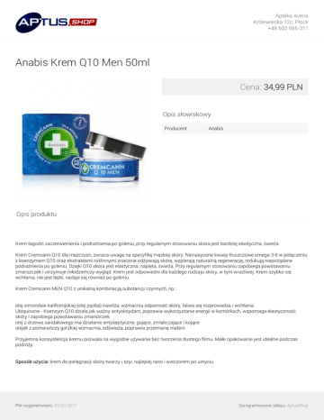 Apteka Avena Królewiecka 12c, Płock +48 502 666 011 Anabis Krem Q10 Men 50ml Cena: 34,99 PLN Opis słownikowy Producent Anabis Opis produktu Krem łagodzi zaczerwienienia i podrażnienia po goleniu, przy regularnym stosowaniu skóra jest bardziej elastyczna, świeża Krem Cremcann Q10 dla mężczyzn, zwraca uwagę na specyfikę męskiej skóry. Nienasycone kwasy tłuszczowe omega 3-6 w połączeniu z koenzymem Q10 oraz ekstraktami roślinnymi znacznie odżywiają skórę, wspierają naturalną regenerację, redukują niepożądane podrażnienia po goleniu. Dzięki Q10 skóra jest elastyczna, napięta, świeża. Przy regularnym stosowaniu zapobiega powstawaniu zmarszczek i utrzymuje młodzieńczy wygląd. Krem jest odpowiedni dla każdego rodzaju skóry, w tym wrażliwej. Krem szybko się wchłania, nie jest lepki, nadaje się również po goleniu. Krem Cremcann MEN Q10 z unikalną kombinacją substancji czynnych, np.: olej simondsie kalifornijskiej (olej jojoba) nawilża, wzmacnia odporność skóry, łatwo się rozprowadza i wchłania Ubiquinone - Koenzym Q10 działa jak ważny antyoksydant, poprawia wykorzystanie energii w komórkach, wspomaga elastyczność skóry i zapobiega powstawaniu zmarszczek olej z drzewa sandałowego ma działanie antyseptyczne, gojące, zmiękczające i kojące olejek z pomarańczy gorzkiej wzmacnia, odświeża, poprawia przemianę materii Przyjemna konsystencja kremu pozwala na wygodne używanie bez tworzenia tłustego filmu. Małe opakowanie jest idealne podczas podróży. Sposób użycia: krem do pielęgnacji skóry twarzy i szyi, najlepiej rano i wieczorem po umyciu. Plik wygenerowano: 03-03-2017 Powered by TCPDF (www.tcpdf.org) Oprogramowanie sklepu: AptusShop
