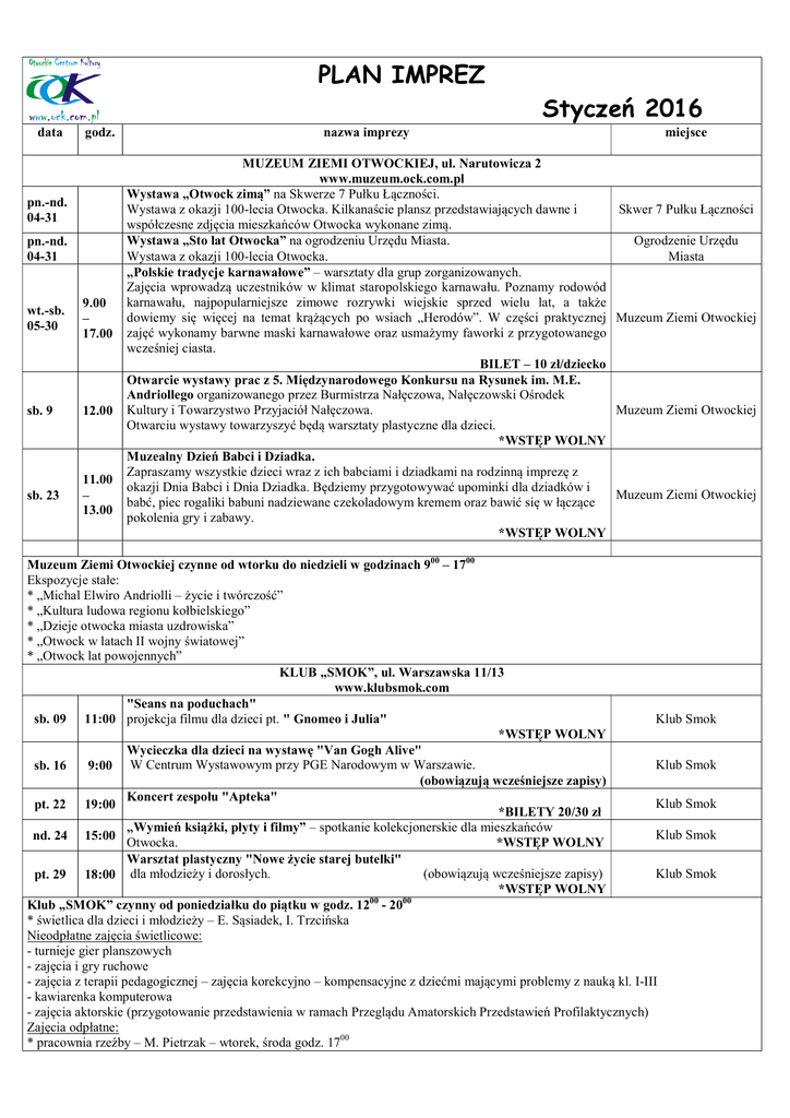 PLAN IMPREZ data godz. pn.-nd. 04-31 pn.-nd. 04-31 wt.-sb. 05-30 9.00 – 17.00 sb. 9 12.00 sb. 23 11.00 – 13.00 nazwa imprezy Styczeń 2016 MUZEUM ZIEMI OTWOCKIEJ, ul. Narutowicza 2 www.muzeum.ock.com.pl Wystawa „Otwock zimą” na Skwerze 7 Pułku Łączności. Wystawa z okazji 100-lecia Otwocka. Kilkanaście plansz przedstawiających dawne i współczesne zdjęcia mieszkańców Otwocka wykonane zimą. Wystawa „Sto lat Otwocka” na ogrodzeniu Urzędu Miasta. Wystawa z okazji 100-lecia Otwocka. „Polskie tradycje karnawałowe” – warsztaty dla grup zorganizowanych. Zajęcia wprowadzą uczestników w klimat staropolskiego karnawału. Poznamy rodowód karnawału, najpopularniejsze zimowe rozrywki wiejskie sprzed wielu lat, a także dowiemy się więcej na temat krążących po wsiach „Herodów”. W części praktycznej zajęć wykonamy barwne maski karnawałowe oraz usmażymy faworki z przygotowanego wcześniej ciasta. BILET – 10 zł/dziecko Otwarcie wystawy prac z 5. Międzynarodowego Konkursu na Rysunek im. M.E. Andriollego organizowanego przez Burmistrza Nałęczowa, Nałęczowski Ośrodek Kultury i Towarzystwo Przyjaciół Nałęczowa. Otwarciu wystawy towarzyszyć będą warsztaty plastyczne dla dzieci. *WSTĘP WOLNY Muzealny Dzień Babci i Dziadka. Zapraszamy wszystkie dzieci wraz z ich babciami i dziadkami na rodzinną imprezę z okazji Dnia Babci i Dnia Dziadka. Będziemy przygotowywać upominki dla dziadków i babć, piec rogaliki babuni nadziewane czekoladowym kremem oraz bawić się w łączące pokolenia gry i zabawy. *WSTĘP WOLNY miejsce Skwer 7 Pułku Łączności Ogrodzenie Urzędu Miasta Muzeum Ziemi Otwockiej Muzeum Ziemi Otwockiej Muzeum Ziemi Otwockiej Muzeum Ziemi Otwockiej czynne od wtorku do niedzieli w godzinach 900 – 1700 Ekspozycje stałe: * „Michal Elwiro Andriolli – życie i twórczość” * „Kultura ludowa regionu kołbielskiego” * „Dzieje otwocka miasta uzdrowiska” * „Otwock w latach II wojny światowej” * „Otwock lat powojennych” KLUB „SMOK”, ul. Warszawska 11/13 www.klubsmok.com "Seans na poduchach" Klub Smok sb. 09 11:00 projekcja filmu dla dzieci pt. " Gnomeo i Julia" *WSTĘP WOLNY Wycieczka dla dzieci na wystawę "Van Gogh Alive" Klub Smok sb. 16 9:00 W Centrum Wystawowym przy PGE Narodowym w Warszawie. (obowiązują wcześniejsze zapisy) Koncert zespołu "Apteka" Klub Smok pt. 22 19:00 *BILETY 20/30 zł „Wymień książki, płyty i filmy” – spotkanie kolekcjonerskie dla mieszkańców Klub Smok nd. 24 15:00 Otwocka. *WSTĘP WOLNY Warsztat plastyczny "Nowe życie starej butelki" (obowiązują wcześniejsze zapisy) Klub Smok pt. 29 18:00 dla młodzieży i dorosłych. *WSTĘP WOLNY Klub „SMOK” czynny od poniedziałku do piątku w godz. 1200 - 2000 * świetlica dla dzieci i młodzieży – E. Sąsiadek, I. Trzcińska Nieodpłatne zajęcia świetlicowe: - turnieje gier planszowych - zajęcia i gry ruchowe - zajęcia z terapii pedagogicznej – zajęcia korekcyjno – kompensacyjne z dziećmi mającymi problemy z nauką kl. I-III - kawiarenka komputerowa - zajęcia aktorskie (przygotowanie przedstawienia w ramach Przeglądu Amatorskich Przedstawień Profilaktycznych) Zajęcia odpłatne: * pracownia rzeźby – M. Pietrzak – wtorek, środa godz. 1700 * „Maluszkowo” zajęcia dla dzieci od 2 do 4 lat przygotowujące dziecko do pobytu w przedszkolu – gry i zabawy ruchowe, zajęcia muzyczne, wprawki plastyczne – E. Sąsiadek – wtorek godz. 900 * zajęcia teatralne – E. Sąsiadek – wtorek 1600 * zajęcia plastyczne – I. Trzcińska – czwartek 1600 * zajęcia muzyczne – M. Gajewski - wtorek 1800, czwartek 1700 * zajęcia kulinarne – E. Sąsiadek – poniedziałek 1700 KLUB „MLĄDZ”, ul. Majowa 202 www.klubmladz.ock.com.pl Jasełka „ W żłobie leży” Klub Mlądz nd. 10 15.00 Jasełka w wykonaniu dzieci uczestniczących w kole teatralnym w Klubie Mlądz. *WSTĘP WOLNY „Ptasia stołówka” 15.00- Warsztaty z wykonywania zimowych kul z połączenia nasion i tłuszczu. Klub Mlądz nd. 17 17.00 Prelekcja dotycząca właściwego sposobu dokarmiania ptaków . *WSTĘP WOLNY „Dzień Babci i Dziadka” - impreza taneczno muzyczna Impreza taneczno-muzyczna skierowana do najstarszych mieszkańców Mlądza z okazji 16.00święta Babci i Dziadka. Klub Mlądz sb. 23 20.00 W programie wspólne śpiewanie, prowadzenie zabawy tanecznej dla seniorów. *WSTĘP WOLNY KLUB „MLĄDZ” czynny od poniedziałku do piątku w godz. 1200 -2000 * świetlica dla dzieci i młodzieży – M. Malesa – poniedziałek – piątek godz. 1200 – 1700 Nieodpłatne zajęcia świetlicowe: - warsztaty plastyczne tematyczne (wielkanocne, bożonarodzeniowe) - turnieje gier planszowych - zajęcia i gry ruchowe - kawiarenka komputerowa - doraźna pomoc dzieciom i młodzieży w zajęciach plastycznych, gazetkach, szkolnych pracach dodatkowych Zajęcia nieodpłatne: * zespół ludowy „Mlądz” – G.Powałka – wtorek godz. 1700 * grupa teatralna „Cylinder” – M.Malesa – piątek godz. 1700 * dziecięca sekcja teatralna „Jaskółeczka” – M.Malesa – piątek godz. 1600 Zajęcia odpłatne: * wiklina – T.Sokolik – poniedziałek, wtorek, środa godz. 1600 * zajęcia plastyczne – I. Trzcińska – wtorek godz. 1700 * warsztaty kreatywności grupa przedszkolna – M. Duraj- Kwas – poniedziałek godz. 1700 * warsztaty kreatywności grupa szkolna – M. Duraj- Kwas – poniedziałek godz. 1815 * „Sport na wesoło” – zajęcia ogólnorozwojowe dla dzieci od 3-go roku życia – wtorek, środa, piątek 1630 IMPRESARIAT www.impresariat.ock.com.pl nd. 10 11:00 Ogłoszenie wyników i wręczenie nagród w XXV Konkursie Szopek Bożonarodzeniowych *WSTĘP WOLNY ŚWIATEŁKO DO NIEBA – pokaz sztucznych ogni w ramach 24. Finału Wielkiej 20.00 Orkiestry Świątecznej Pomocy *WSTĘP WOLNY 9:00 XXIII PRZEGLĄD JASEŁEK wt. - śr. Prezentacja przedstawień teatralnych o tematyce bożonarodzeniowej w wykonaniu 13-