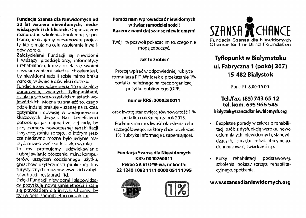 Fundacja Szansa dla Niewidomych od 22 lat wspiera niewidomych, niedo widzących i ich bliskich. Organizujemy różnorodne szkolenia, konferencje, spo tkania, realizujemy niesamowite projek ty, które mają na celu wspieranie inwali dów wzroku. Założycielami Fundacji są niewidomi i widzący przedsiębiorcy, informatycy i rehabilitanci, którzy dzielą się swoimi doświadczeniami i wiedzą. Ich celem jest, by niewidomi radzili sobie mimo braku wzroku, w świecie dźwięku i dotyku. Fundacja zawiaduje siecią 16 oddziałów doradczych, zwanych Tyflopunktami. działających we wszystkich miastach wo jewódzkich. Można tu znaleźć to, czego gdzie indziej brakuje - szansę na sukces, optymizm i odwagę w podejmowaniu kluczowych decyzji. Nasi beneficjenci potrzebują jak najmądrzejszej rady, by przy pomocy nowoczesnej rehabilitacji i wykorzystaniu sprzętu, o którym jesz cze niedawno można było jedynie ma rzyć, zniwelować skutki braku wzroku. To my promujemy udźwiękawianie i ubrajlawianie otoczenia, m.in.: kompu terów, urządzeń codziennego użytku, gmachów użyteczności publicznej, tras turystycznych, muzeów, wszelkich zabyt ków, hoteli, restauracji itd. Dzięki Fundacji niewidomi i słabowidzącv pozyskują nowe umiejętności i staia się przykładem dla innych. Chcemy. bv byli w pełni samodzielni i niezależni. Pomóż nam wprowadzać niewidomych w świat samodzielności! Razem z nami daj szansę niewidomym! Twój 1 % pozwoli pokazać im to, czego nie mogą zobaczyć. Jak to zrobić? Proszę wpisać w odpowiedniej rubryce formularza PIT„Wniosek o przekazanie 1% podatku należnego na rzecz organizacji pożytku publicznego (OPP)" numer KRS: 0000260011 oraz kwotę stanowiącą równowartość 1 % podatku należnego za rok 2013. Podatnik ma możliwość określenia celu szczegółowego, na który chce przekazać 1% (rubryka Informacje uzupełniające). Fundacja Szansa dla Niewidomych K R S:0000260011 Pekao SA VI O/W-wa, nr konta: 22 1240 1082 1111 0000 05141795 SZANSA K CHA NC£ Fundacja S zan sa dla N iew idom ych C h a n c e fo r th e Blind F o u n d a tio n Tyflopunkt w Białymstoku ul. Fabryczna 1 (pokój 307) 15-482 Białystok Pon.-Pt. 8.00-16.00 Tel./fax: (85) 743 65 12 tel. kom. 695 966 545 [email protected] • Bezpłatne porady w zakresie rehabili tacji osób z dysfunkcją wzroku, nowo ociemniałych, niewidomych, słabowidzących, sprzętu rehabilitacyjnego, dofinansowań, świadczeń itp. • Kursy rehabilitacji podstawowej, szkolenia, pokazy sprzętu rehabilita cyjnego, spotkania. www.szansadlaniewidomych.org Z A P R A S Z A M Y N A BEZPŁATNE S Z K O L E N IA Z ZA K R E SU N O W O C ZE SN E J REHABILITACJI wszystkich, którzy chcą „żyć lepiej i ciekawiej". U nas jest to realne. Proponujemy wzięcie udziału w nowa torskich szkoleniach rehabilitacyjnych, w których można swobodnie wybrać te matykę zajęć, w których chce się uczest niczyć. Oferujemy naprawdę szeroki wy bór tematów: Świat dotyku i dźwięku - jak się w nim poruszać, jak przekonać innych do nas i naszej specyfiki, czy nasze otoczenie jest przygotowane w taki sposób, byśmy mogli sobie dobrze radzić? Dom - czy nasz dom jest atrakcyjny dla innych? Co powinniśmy umieć, by tak było? Zdrowie - Musimy być zdrowi i sprawni, by sprostać wymaganiom innych. Kuchnia - Prawda, że kucharzenie lub asystowanie podczas przygotowywania posiłków może być wspaniałym relak sem i nowoczesną rehabilitacją zarazem? TYFLOSport - niewidomi i niedowidzący chcą konkurować z innymi i odnosić zwy cięstwa. TYFLOEdukacja - jak się uczyć, gdy bra kuje nam książek i pieniędzy na ich zakup? A jednak można! Porozmawiajmy o tym. TYFLOInformatyka - dzisiaj nic nie dzia ła bez informatyki. Jak można sobie pora dzić, gdy wszystkie wyświetlacze i ekrany są dla nas niełaska we? Rozwiązaniem tego problemu jest udźwiękowienie i ubrajlowienie urządzeń. Wtedy możemy czuć się jak inni użytkownicy - bez kompleksów. Niewidomy poliglota - niepełnosprawni, którzy znają języki obce są bardzo cenieni. Nasi beneficjenci mogą to osiągnąć. Mobilność - kiedyś wystarczyły białe laski do poruszania się po mieście, teraz musi my używać urządzeń elektronicznych, by móc sprostać oczekiwaniom innych. Uprawnienia - bez prawa ani rusz! Kultura - porozmawiamy o sprawach, 0 których rozmawiają wszyscy. Dlaczego mają nas omijać rodzinne lub przyjaciel skie rozmowy o wycieczkach, o historii 1zabytkach? M y też możemy być doinfor mowani. Hobby - wszyscy niewidomi mają jakieś hobby. Fundacja pomoże je rozwinąć, by nasi beneficjenci mogli zaimponować swoją wiedzą. Turystyka - w nowoczesnym świecie zwiedzać mogą wszyscy. Niech nasi be neficjenci z tego skorzystają. Autoprezentacja - wygląd jest bardzo ważny. Jeden rzut oka i widzący wiedzą, na ile nas stać, co potrafimy zrobić. Na uczmy się jak należy o siebie dbać. Nowoczesne technologie - Fundacja dysponuje wieloma urządzeniami i pro gramami, które zaprezentuje w trakcie zajęć. Niektóre z nich mogą się stać wła snością Państwa. Motywacja - czy to wszystko da się osią gnąć, gdy nie mamy ochoty, humoru, motywacji? Pouczmy się jak rozumieć innych i prezentować siebie, by wszystko stało się ciekawsze i łatwiejsze. Projekt Nowocześnie zrehabilitowani niewido m i „widzą" i wiedzą więcej! Sieć Tyflopunktów drogą do samodzielności inwalidów wzroku, niezależnie od miejsca zamieszkania jest współ finansowany ze środków PFRON.