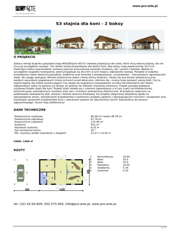 www.pro-arte.pl S3 stajnia dla koni - 2 boksy O PROJEKCIE Zobacz wersję budynku gospodarczego BGS3Stajnia S03 to ciekawa propozycja dla osób, które chcą własną stajnię, ale nie chcą jej szczególnie rozwijać. Ten obiekt został przewidziany dla dwóch koni, oba boksy mają powierzchnię 10,5 m2. Zwierzęta można wyprowadzać zarówno poprzez komunikację wewnątrz budynku, jak i prosto z boksów. Będzie to szczególnie wygodne rozwiązanie, jeżeli przygotuje się dla nich w tym miejscu odpowiedni wybieg. Ponadto w budynku przewidziano także obszerną paszalnię, siodlarnię oraz łazienkę z przepływowym, umywalkowo – natryskowym ogrzewaczem wody. Na uwagę zasługuje również przestronna wiata z lewej strony budynku. Okaże się ona bardzo pożyteczna przy każdych warunkach pogodowych (może ochronić przed deszczem, słońcem itp., można tutaj zostawić samochód). Czy ta stajnia będzie dla Ciebie wystarczająca? Czy okaże się wygodnym rozwiązaniem za kilka lub kilkanaście lat? Warto odpowiedzieć sobie na pytania już dzisiaj, by później nie żałować chybionej inwestycji. Projekt posiada poddasze użytkowe.Projekt stajni dla koni. Projekt stajni składa się z czterech egzemplarzy a w tym części architektonicznej, konstrukcyjnej, wewnętrznych instalacji wod.-kan i instalacji wewnętrznej elektrycznej. W projekcie załączone są podstawowe zestawienie stali, drewna i stolarki okienno-drzwiowej. Do projektu dołączamy bezpłatną zgodę na wprowadzenie zmian, oświadczenie projektantów o wykonaniu projektu zgodnie z obowiązującymi normami i przepisami oraz kserokopie uprawnień projektantów wraz z aktualnym wpisem do izby.Kochasz konie? Zapraszamy do serwisu ogłoszeniowego i forum http://allekonie.pl DANE TECHNICZNE Powierzchnia użytkowa Powierzchnia zabudowy Powierzchnia całkowita Kubatura Wysokość budynku Kąt nachylenia dachu Min. wymiary działki (szerokość x długość) 80.58 m²+wiata 38.78 m² 67.79 m² 174.38 m² 552 m³ 6.32 m 35 ° 23.27 x 14.55 m CENA: 1400 zł RZUTY 1. 2. 3. 4. 5. 6 Komunikacja Boks Boks Paszalnia Siodlarnia Łazienka 16.94 10.5 10.5 10.02 5.34 4.33 tel. (32) 43-50-829, 502 575 920, [email protected], www.pro-arte.pl 1/1 Powered by TCPDF (www.tcpdf.org)