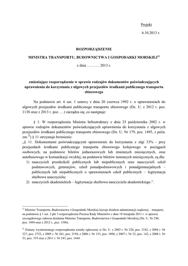 Projekt 6.10.2013 r. ROZPORZĄDZENIE MINISTRA TRANSPORTU, BUDOWNICTWA I GOSPODARKI MORSKIEJ1) z dnia ………. 2013 r. zmieniające rozporządzenie w sprawie rodzajów dokumentów poświadczających uprawnienia do korzystania z ulgowych przejazdów środkami publicznego transportu zbiorowego Na podstawie art. 6 ust. 1 ustawy z dnia 20 czerwca 1992 r. o uprawnieniach do ulgowych przejazdów środkami publicznego transportu zbiorowego (Dz. U. z 2012 r. poz. 1138 oraz z 2013 r. poz. …) zarządza się, co następuje: § 1. W rozporządzeniu Ministra Infrastruktury z dnia 25 października 2002 r. w sprawie rodzajów dokumentów poświadczających uprawnienia do korzystania z ulgowych przejazdów środkami publicznego transportu zbiorowego (Dz. U. Nr 179, poz. 1495, z późn. zm.2)) § 11 otrzymuje brzmienie: „§ 11. Dokumentami poświadczającymi uprawnienie do korzystania z ulgi 33% - przy przejazdach środkami publicznego transportu zbiorowego kolejowego w pociągach osobowych, na podstawie biletów jednorazowych lub imiennych miesięcznych, oraz autobusowego w komunikacji zwykłej, na podstawie biletów imiennych miesięcznych, są dla: 1) nauczycieli przedszkoli publicznych lub niepublicznych oraz nauczycieli szkół podstawowych, gimnazjów, szkół ponadpodstawowych i ponadgimnazjalnych – publicznych lub niepublicznych o uprawnieniach szkół publicznych – legitymacja służbowa nauczyciela; 2) nauczycieli akademickich – legitymacja służbowa nauczyciela akademickiego.”. 1) Minister Transportu, Budownictwa i Gospodarki Morskiej kieruje działem administracji rządowej – transport, na podstawie § 1 ust. 2 pkt 3 rozporządzenia Prezesa Rady Ministrów z dnia 18 listopada 2011 r. w sprawie szczegółowego zakresu działania Ministra Transportu, Budownictwa i Gospodarki Morskiej (Dz. U. Nr 248, poz. 1494 oraz z 2012 r., poz. 1396). 2) Zmiany wymienionego rozporządzenia zostały ogłoszone w Dz. U. z 2003 r. Nr 220, poz. 2182, z 2004 r. Nr 227, poz. 2752, z 2005 r. Nr 261, poz. 2194, z 2006 r. Nr 153, poz. 1098, z 2007 r. Nr 23, poz. 142, z 2008 r. Nr 53, poz. 319 oraz z 2011 r. Nr 243, poz. 1444. § 2. Rozporządzenie wchodzi w życie z dniem 1 stycznia 2014r. . MINISTER TRANSPORTU, BUDOWNICTWA I GOSPODARKI MORSKIEJ W porozumieniu: MINISTER PRACY I POLITYKI SPOŁECZNEJ MINISTER EDUKACJI NARODOWEJ MINISTER NAUKI I SZKOLNICTWA WYŻSZEGO UZASADNIENIE Ustawa z dnia 20 czerwca 1992 r. o uprawnieniach do ulgowych przejazdów środkami publicznego transportu zbiorowego (Dz. U. z 2012 r., poz. 1138), zwanej dalej „ustawą o ulgach” przyznaje ulgi przy przejazdach środkami publicznego transportu zbiorowego (kolejowego i autobusowego, z wyłączeniem komunikacji miejskiej) niektórym kategoriom osób. W zależności od kategorii osób, rodzaju środka transportu i rodzaju biletu wymiar ulgi przyjmuje różne wartości procentowe. Ustawa o ulgach w art. 6 ust. 1 zawiera upoważnienie dla ministra właściwego do spraw transportu do określenia, w drodze rozporządzenia, w porozumieniu w ministrami właściwymi do spraw: pracy i zabezpieczenia społecznego, oświaty i wychowania oraz szkolnictwa wyższego, rodzajów dokumentów poświadczających uprawnienia do korzystania z ulgowych przejazdów dla określonych kategorii osób. W dniu 16 listopada 2010 r. Trybunał Konstytucyjny wydał orzeczenie (sygn. akt K 2/10) w którym stwierdził niezgodność art. 4 ust. 7 pkt 1 oraz art. 5 ust. 2 pkt 1 ustawy z dnia 20 czerwca 1992 r. o uprawnieniach do ulgowych przejazdów środkami publicznego transportu zbiorowego (Dz. U. z 2012 r., poz. 1138) w zakresie, w jakim wyłączają nauczycieli zatrudnionych w przedszkolach z kręgu nauczycieli uprawnionych do ulgowych przejazdów środkami publicznego transportu zbiorowego - z art. 32 ust. 1 w związku z art. 2 Konstytucji. Wykonanie orzeczenia Trybunału Konstytucyjnego z dnia 16 listopada 2010 r. stanowi uchwalona przez Sejm RP ustawa z dnia 11 października 2013 r. o zmianie ustawy o uprawnieniach do ulgowych przejazdów środkami publicznego transportu zbiorowego oraz ustawy – Karta Nauczyciela. Wskazana nowelizacja nadała nauczycielom przedszkoli uprawnienie w wymiarze 33% do ulgowych przejazdów środkami publicznego transportu zbiorowego oraz obniżyła wymiar ulgi dla wszystkich grup nauczycieli z obecnie obowiązującej 37% do 33%. Obniżenie to dotyczy również nauczycieli akademickich. Powyższa ustawa nowelizująca, w konsekwencji przyznania uprawnień do ulgi nauczycielom przedszkoli, dokonała również odpowiedniej zmiany ustawy z dnia 26 stycznia 1982 r. – Karta Nauczyciela (Dz. U. z 2006 r., poz. 674, z późn. zm.), rozciągając stosowanie przepisów dotyczących wydawania legitymacji nauczycielom zatrudnionym w szkołach na nauczycieli zatrudnionych w przedszkolach (art. 11a) w celu umożliwienia dokumentowania przez nich uprawnień do ulgowych przejazdów. Wobec powyższych zmian ustawowych zaszła również konieczność stosownej zmiany rozporządzenia Ministra Infrastruktury z dnia 25 października 2002 r. w sprawie rodzajów dokumentów poświadczających uprawnienie do korzystania z ulgowych przejazdów środkami publicznego transportu zbiorowego (Dz. U. z 2002 r. Nr 179, poz. 1495 z późn. zm.). Przedmiotowa nowelizacja przewiduje zmianę § 11 wymienionego rozporządzenia, zgodnie z którym dokumentami poświadczającymi uprawnienie do korzystania z ulgi 33% - przy przejazdach środkami publicznego transportu zbiorowego kolejowego w pociągach osobowych, na podstawie biletów jednorazowych lub imiennych miesięcznych, oraz autobusowego w komunikacji zwykłej, na podstawie biletów imiennych miesięcznych, są dla: 1) nauczycieli przedszkoli publicznych lub niepublicznych oraz nauczycieli szkół podstawowych, gimnazjów, szkół ponadpodstawowych i ponadgimnazjalnych – publicznych lub niepublicznych o uprawnieniach szkół publicznych – legitymacja służbowa nauczyciela; 2) nauczycieli akademickich 