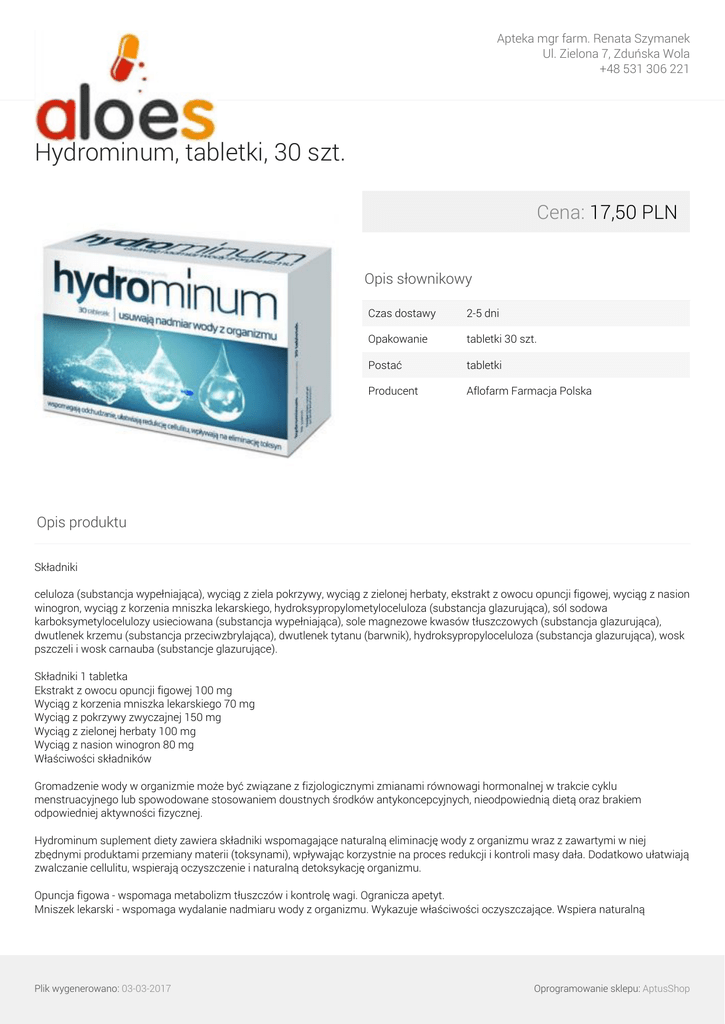 Apteka mgr farm. Renata Szymanek Ul. Zielona 7, Zduńska Wola +48 531 306 221 Hydrominum, tabletki, 30 szt. Cena: 17,50 PLN Opis słownikowy Czas dostawy 2-5 dni Opakowanie tabletki 30 szt. Postać tabletki Producent Aflofarm Farmacja Polska Opis produktu Składniki celuloza (substancja wypełniająca), wyciąg z ziela pokrzywy, wyciąg z zielonej herbaty, ekstrakt z owocu opuncji figowej, wyciąg z nasion winogron, wyciąg z korzenia mniszka lekarskiego, hydroksypropylometyloceluloza (substancja glazurująca), sól sodowa karboksymetylocelulozy usieciowana (substancja wypełniająca), sole magnezowe kwasów tłuszczowych (substancja glazurująca), dwutlenek krzemu (substancja przeciwzbrylająca), dwutlenek tytanu (barwnik), hydroksypropyloceluloza (substancja glazurująca), wosk pszczeli i wosk carnauba (substancje glazurujące). Składniki 1 tabletka Ekstrakt z owocu opuncji figowej 100 mg Wyciąg z korzenia mniszka lekarskiego 70 mg Wyciąg z pokrzywy zwyczajnej 150 mg Wyciąg z zielonej herbaty 100 mg Wyciąg z nasion winogron 80 mg Właściwości składników Gromadzenie wody w organizmie może być związane z fizjologicznymi zmianami równowagi hormonalnej w trakcie cyklu menstruacyjnego lub spowodowane stosowaniem doustnych środków antykoncepcyjnych, nieodpowiednią dietą oraz brakiem odpowiedniej aktywności fizycznej. Hydrominum suplement diety zawiera składniki wspomagające naturalną eliminację wody z organizmu wraz z zawartymi w niej zbędnymi produktami przemiany materii (toksynami), wpływając korzystnie na proces redukcji i kontroli masy dała. Dodatkowo ułatwiają zwalczanie cellulitu, wspierają oczyszczenie i naturalną detoksykację organizmu. Opuncja figowa - wspomaga metabolizm tłuszczów i kontrolę wagi. Ogranicza apetyt. Mniszek lekarski - wspomaga wydalanie nadmiaru wody z organizmu. Wykazuje właściwości oczyszczające. Wspiera naturalną Plik wygenerowano: 03-03-2017 Oprogramowanie sklepu: AptusShop Apteka mgr farm. Renata Szymanek Ul. Zielona 7, Zduńska Wola +48 531 306 221 detoksykację organizmu. Pokrzywa - wspomaga eliminację wody z organizmu i metabolizm tłuszczów. Wpływa korzystnie na witalność i zachowanie energii. Zielona herbata - posiada właściwości antyoksydacyjne, dzięki czemu chroni organizm przed szkodliwym działaniem wolnych rodników. Dodatkowo promuje wydalanie wody z organizmu. Wyciąg z nasion winogron - pomaga w redukcji cellulitu i wspomaga odchudzanie. Wspiera kontrolę masy dała, pomaga modelować sylwetkę. Zalecane dzienne spożycie Dorośli: 1 tabletka dziennie. Plik wygenerowano: 03-03-2017 Powered by TCPDF (www.tcpdf.org) Oprogramowanie sklepu: AptusShop