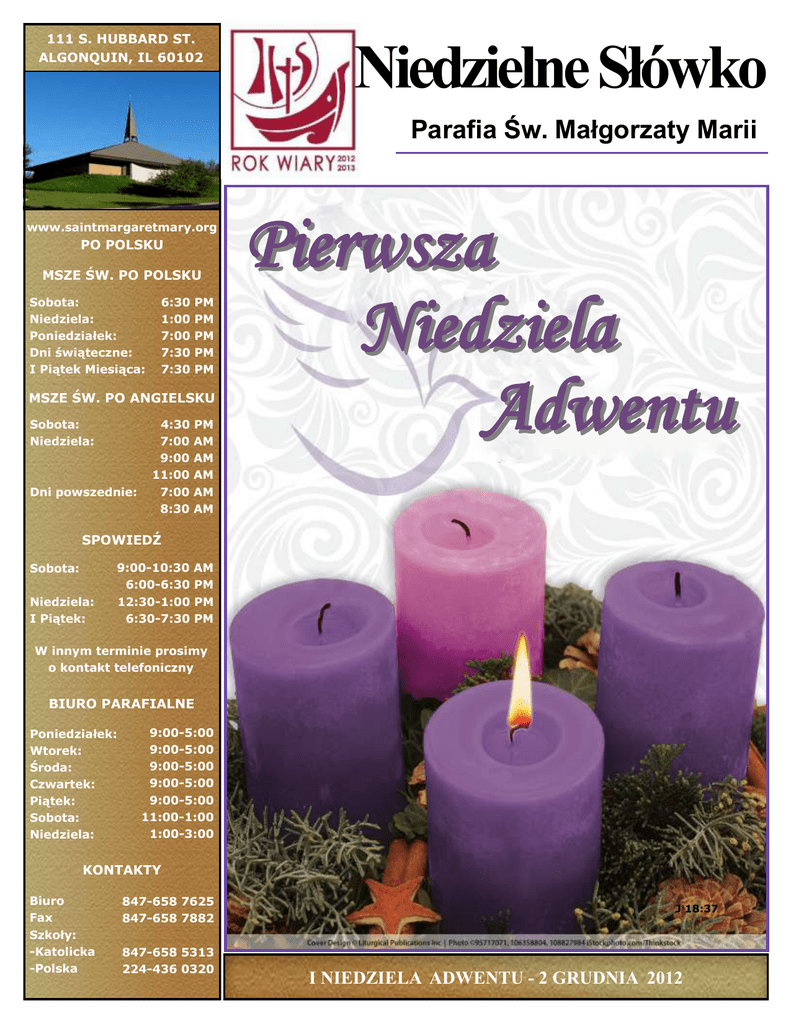 111 S. HUBBARD ST. ALGONQUIN, IL 60102 Niedzielne Słówko Parafia Św. Małgorzaty Marii www.saintmargaretmary.org PO POLSKU MSZE ŚW. PO POLSKU Sobota: Niedziela: Poniedziałek: Dni świąteczne: I Piątek Miesiąca: 6:30 1:00 7:00 7:30 7:30 PM PM PM PM PM MSZE ŚW. PO ANGIELSKU Sobota: Niedziela: Dni powszednie: 4:30 7:00 9:00 11:00 7:00 8:30 PM AM AM AM AM AM Pierwsza Niedziela Adwentu SPOWIEDŹ Sobota: Niedziela: I Piątek: 9:00-10:30 AM 6:00-6:30 PM 12:30-1:00 PM 6:30-7:30 PM W innym terminie prosimy o kontakt telefoniczny BIURO PARAFIALNE Poniedziałek: Wtorek: Środa: Czwartek: Piątek: Sobota: Niedziela: 9:00-5:00 9:00-5:00 9:00-5:00 9:00-5:00 9:00-5:00 11:00-1:00 1:00-3:00 KONTAKTY Biuro Fax Szkoły: -Katolicka -Polska 847-658 7625 847-658 7882 847-658 5313 224-436 0320 J 18:37 I NIEDZIELA ADWENTU - 2 GRUDNIA 2012 Niedzielne Słówko Od Proboszcza “ Uważajcie na siebie, żeby ten dzień nie przyszedł na was znienacka jak potrzask” Drodzy Przyjaciele! Archiasz, który był odważnym dowódcą Spartan, uczestniczył w wesołej uczcie. W międzyczasie przybył goniec z Aten, listem od przyjaciela i prośbą, aby Archiasz natychmiast przeczytał ten list. Archiasz jednak zlekceważył tą prośbę i odkładając list, powiedział: “ Poważniejsze sprawy niech poczekają do jutra”. Nie dożył jednak jutra. W czasie uczty został zamordowany przez wrogów. W liście było napisane: “ Archiaszu, błagam Cię, abyś natychmiast uciekał z domu, w którym czeka na Ciebie sztylet skrytobójców.” Gdyby Archiasz nie odkładał przeczytania listu od przyjaciela, uratowałby samego siebie. Dzisiaj, w pierwszą niedzielę Adwentu, nasz największy przyjaciel Jezus Chrystus , kieruje do nas słowa zachęty, abyśmy nie odkładali na jutro troski o tak ważną sprawę, jaką jest życie wieczne i zbawienie naszych Dusz. W Ewangelii Chrystus mówi: “ Uważajcie na siebie, aby wasze serca nie były ociężałe wskutek obżarstwa, pijaństwa i trosk doczesnych, żeby ten dzień nie przypadł na was znienacka jak potrzask”. Ewangelia według św. Łukasza 21,25 - 28.34 - 36 Jezus powiedział do swoich uczniów: „Będą znaki na słońcu, księżycu i gwiazdach, a na ziemi trwoga narodów bezradnych wobec szumu morza i jego nawałnicy. Ludzie mdleć będą ze strachu, w oczekiwaniu wydarzeń zagrażających ziemi. Albowiem moce niebios zostaną wstrząśnięte. Wtedy ujrzą Syna Człowieczego, przychodzącego na obłoku z wielką mocą i chwałą. A gdy się to dziać zacznie, nabierzcie ducha i podnieście głowy, ponieważ zbliża się wasze odkupienie. Uważajcie na siebie, aby wasze serca nie były ociężałe wskutek obżarstwa, pijaństwa i trosk doczesnych, żeby ten dzień nie przypadł na was znienacka jak potrzask. Przyjdzie on bowiem na wszystkich, którzy mieszkają na całej ziemi. Czuwajcie więc i módlcie się w każdym czasie, abyście mogli uniknąć tego wszystkiego, co ma nastąpić, i stanąć przed Synem Człowieczym”. Adwent, który właśnie zaczynamy, to czas pogłębienia naszej wiary i odnowienia życia duchowego. To czas na praktykowanie codziennej modlitwy, czytania Pisma Świętego, to okres szczerej i głębokiej spowiedzi. Zapraszam Was więc do chrześcijańskiego przeżywania tego okresu. Nie będzie to łatwe, ponieważ w rzeczywistości, w której żyjemy, czas adwentu to czas zakupów, spotkań towarzyskich, czas zabiegania i starania się o rzeczy tego świata. Nie dajmy się złapać w tą pułapkę, ponieważ może się okazać, że przemęczeni i zagonieni w tych zewnętrznych aspektach przygotowań do świąt, nie zauważymy i nie usłyszymy Chrystusa pukającego do drzwi naszych serc w Dzień Bożego Narodzenia. Naszą wspólną formą przygotowań na Boże Narodzenie, będą Adwentowe Rekolekcje Parafialne, które zaczną się w sobotę 15-go grudnia, a zakończą w poniedziałek 17-go grudnia. Rekolekcjonistą będzie O. Tomasz Ryba, Franciszkanin z Chicopee w stanie Massachusetts. Serdecznie Was zapraszam do wzięcia udziału w rekolekcjach. Nasze pragnienie i oczekiwanie na Narodzenie Zbawiciela Świata, Jezusa Chrystusa, wyraźmy słowami znanej adwentowej pieśni religijnej: Czekam na Ciebie Jezu mój mały, ciche błagania ku niebu ślę. Twojego przyjścia czeka świat cały, sercem gorącym przyzywa Cię. Spójrz, tęsknimy na tej ziemi, przybądź Jezu pociesz nas! Szczerze kochać Cię będziemy, przyjdź o Jezu, bo już czas! O.Piotr Sarnicki OFM Conv Niedzielne Słówko Ogłoszenia Służba Liturgiczna Ołtarza Ministranci Sobota Niedziela 8.Xll.2012 9.Xll.2012 Gabriel Waz Gosia Dobek Krystian Kalinowski Michał Dobek Maciek Kawecki Ola Bębenek Kasia Kotowski Dawid Gorski Jarek Kawecki Lektorzy Rena Smigielski Tadeusz Baldyga BÓG ZAPŁAĆ W zeszłym tygodniu Rycerze Columbusa udekorowali budynek kościoła i klasztoru kolorowymi lampkami i ustawili Bożonarodzeniowe szopki . Z całego serca im za to dziękuję. Bóg zapłać Ministrowie Eucharystii Marcin Wojtulewicz Grazyna Rolkowska Zuzanna Waz Grzegorz Dobek Elżbieta Bartosz Piotr KotowskiCastiglione Grzegorz Dobek Janina Adamczyk Tadeusz Leszewicz Iwona Szyda Ro dz in n y Sy l w e st er 31 Grudnia 2012 Godz. 7:30Pm - 1:00Am Szkoła Św. Małgorzaty Marii Sala Gimnastyczna również za wasze ofiary złożone w ostatni weekend podczas drugiej kolekty na redukcję długu parafii. Wyzbieraliśmy $ 7,563 w tym na Mszach Św. w języku polskim $ 1,350. ZAPRASZAMY Niedzielne Słówko Ogłoszenia BÓG ZAPŁAĆ Bardzo serdecznie dziękuję Radzie parafialnej za zorganizowanie Zabawy Andrzejkowej, która odbyła się w sobotę 24-go listopada. Dziękuję wszystkim sponsorom za ufundowanie nagród na loterię fantową: A.K. General Flooring-Adam Kucharczyk Dr. Boguslaw Bonczak Konrad's Bakery Allstate Ins. - Beata Jaworski Rosmart Deli Dr. Maciej Malinski Century 21 1st Class Homes- Monika Marat & Monika Wasilewski Precise Chiropractic - Dr. Sebastian Fuksa Sugar Hills Baker