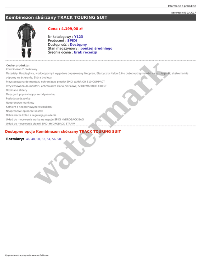Informacje o produkcie Utworzono 03-03-2017 Kombinezon skórzany TRACK TOURING SUIT Cena : 4.199,00 zł Nr katalogowy : Y123 Producent : SPIDI Dostępność : Dostępny Stan magazynowy : poniżej średniego Średnia ocena : brak recenzji Cechy produktu: Kombinezon 2 cześciowy odporny na ścieranie, Skóra bydlęca er m ar k Materiały: Rozciągliwy, wodoodporny i wygodnie dopasowany Neopren, Elastyczny Nylon 6.6 o dużej wytrzymałości na rozciąganie, ekstremalnie Przystosowana do montażu ochraniacza pleców SPIDI WARRIOR 510 COMPACT Przystosowana do montażu ochraniacza klatki piersiowej SPIDI WARRIOR CHEST Odpinane slidery Mały garb poprawiający aerodynamikę Posiada podszewkę Neoprenowe mankiety Kołnierz z neoprenowymi wstawkami Neoprenowe opinacze kostek Ochraniacze kolan z regulacją położenia Układ do mocowania worka na napoje SPIDI HYDROBACK BAG Układ do mocowania słomki SPIDI HYDROBACK STRAW Dostępne opcje Kombinezon skórzany TRACK TOURING SUIT w at Rozmiary: 46, 48, 50, 52, 54, 56, 58. Wygenerowano w programie www.oscGold.com