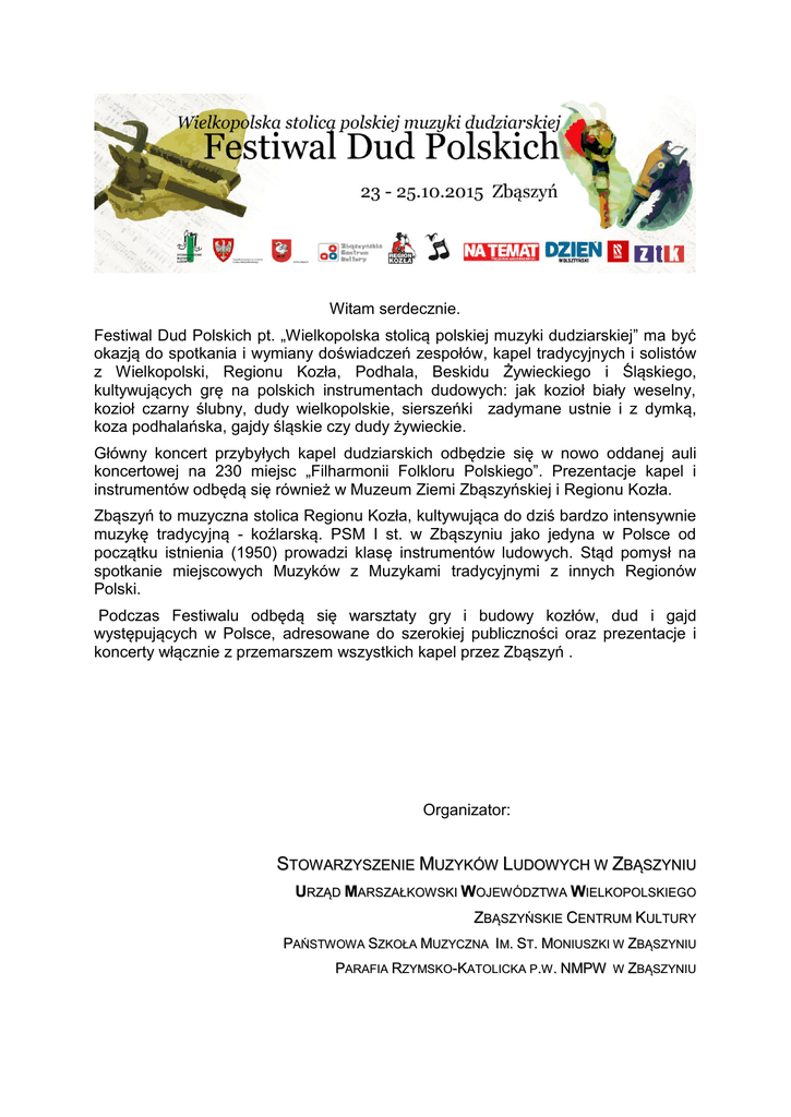 Witam serdecznie. Festiwal Dud Polskich pt. „Wielkopolska stolicą polskiej muzyki dudziarskiej” ma być okazją do spotkania i wymiany doświadczeń zespołów, kapel tradycyjnych i solistów z Wielkopolski, Regionu Kozła, Podhala, Beskidu Żywieckiego i Śląskiego, kultywujących grę na polskich instrumentach dudowych: jak kozioł biały weselny, kozioł czarny ślubny, dudy wielkopolskie, sierszeńki zadymane ustnie i z dymką, koza podhalańska, gajdy śląskie czy dudy żywieckie. Główny koncert przybyłych kapel dudziarskich odbędzie się w nowo oddanej auli koncertowej na 230 miejsc „Filharmonii Folkloru Polskiego”. Prezentacje kapel i instrumentów odbędą się również w Muzeum Ziemi Zbąszyńskiej i Regionu Kozła. Zbąszyń to muzyczna stolica Regionu Kozła, kultywująca do dziś bardzo intensywnie muzykę tradycyjną - koźlarską. PSM I st. w Zbąszyniu jako jedyna w Polsce od początku istnienia (1950) prowadzi klasę instrumentów ludowych. Stąd pomysł na spotkanie miejscowych Muzyków z Muzykami tradycyjnymi z innych Regionów Polski. Podczas Festiwalu odbędą się warsztaty gry i budowy kozłów, dud i gajd występujących w Polsce, adresowane do szerokiej publiczności oraz prezentacje i koncerty włącznie z przemarszem wszystkich kapel przez Zbąszyń . Organizator: STOWARZYSZENIE MUZYKÓW LUDOWYCH W ZBĄSZYNIU URZĄD MARSZAŁKOW SKI WOJEW ÓDZTW A WIELKOPOLSKIEGO ZBĄSZYŃSKIE CENTRUM KULTURY PAŃSTW OW A SZKOŁA MUZYCZNA IM. ST. MONIUSZKI W ZBĄSZYNIU PARAFIA RZYMSKO-KATOLICKA P.W . NMPW W ZBĄSZYNIU PROGRAM FESTIWALU piątek, 23 października 2015r. 1500 - 1800 przyjazd i zakwaterowanie uczestników (Hotelik Sportowy ul. Mostowa 10a) i odprawa opiekunów i kierowników kapel. 1800 - 1900 kolacja (Dom Katolicki ul. Plac Rybaki 1.) 1900 - 2100 warsztatowe prezentacje gry i budowy wszystkich rodzajów dud polskich (Dom Katolicki) sobota, 24 października 2015r. 930 - 1030 śniadanie (Dom Katolicki) 1100 - 1400 prelekcja i warsztaty dudziarskie (Muzeum Ziemi Zbąszyńskiej i Regionu Kozła ul. Rynek 8) 14 00 - 1500 Obiad (Dom Katolicki) 15 30 - 1600 wspólna fotografia przy Pomniku Koźlarza (Rynek) 1600 - 1700 korowód kapel i zespołów do Filharmonii Folkloru Polskiego ul.17 Stycznia 69 i wspólna fotografia. 1700 - 1830 koncert galowy w auli Filharmonii Folkloru Polskiego - wstęp wolny. 1930 - 2200 kolacja i wspólne muzykowanie - wieczór integracyjny (Dom Katolicki) niedziela, 25 października 2015r. 1000 - 1100 śniadanie (Dom Katolicki) 1200 - 1245 Msza św. w intencji muzyków ludowych w kościele p.w. NMPW 1300 - 1430 Koncert galowy w kościele p.w. NMP Wniebowziętej 1430 - 1500 korowód pod pomnik Jana Pawła II - wspólna fotografia. 1500 - 1700 obiad, wręczenie nagród i zakończenie festiwalu (Dom Katolicki)