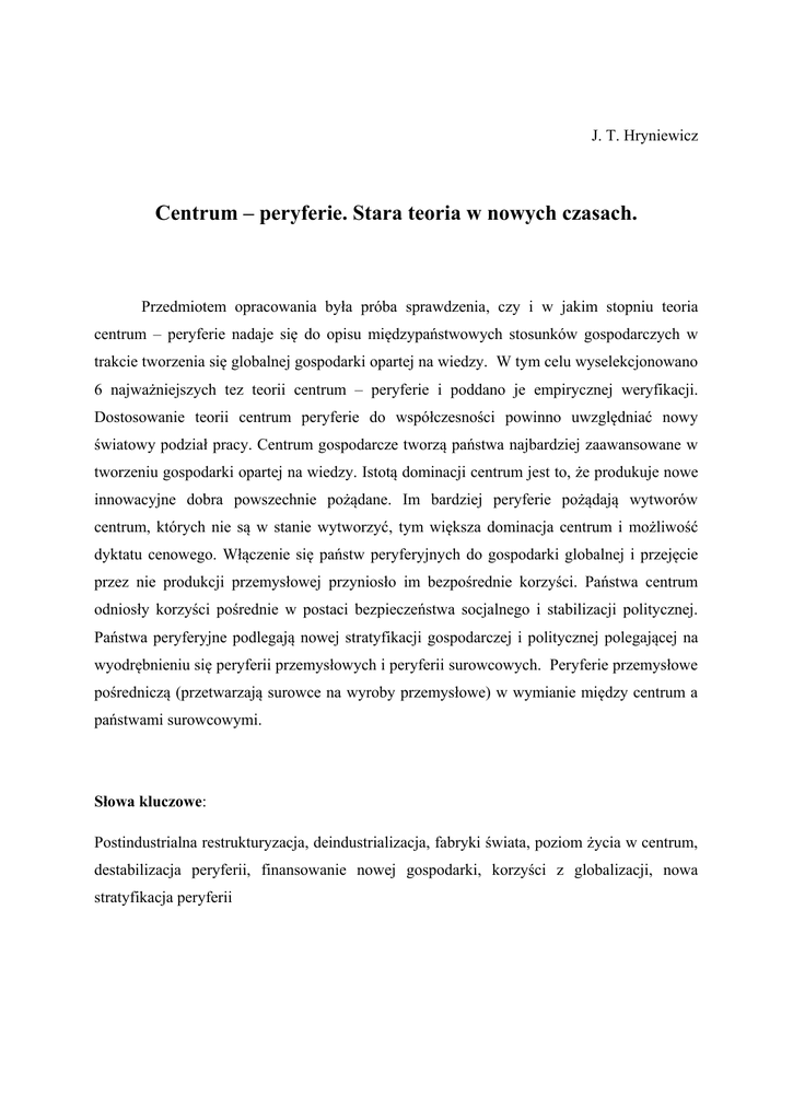 J. T. Hryniewicz Centrum – peryferie. Stara teoria w nowych czasach. Przedmiotem opracowania była próba sprawdzenia, czy i w jakim stopniu teoria centrum – peryferie nadaje się do opisu międzypaństwowych stosunków gospodarczych w trakcie tworzenia się globalnej gospodarki opartej na wiedzy. W tym celu wyselekcjonowano 6 najważniejszych tez teorii centrum – peryferie i poddano je empirycznej weryfikacji. Dostosowanie teorii centrum peryferie do współczesności powinno uwzględniać nowy światowy podział pracy. Centrum gospodarcze tworzą państwa najbardziej zaawansowane w tworzeniu gospodarki opartej na wiedzy. Istotą dominacji centrum jest to, że produkuje nowe innowacyjne dobra powszechnie pożądane. Im bardziej peryferie pożądają wytworów centrum, których nie są w stanie wytworzyć, tym większa dominacja centrum i możliwość dyktatu cenowego. Włączenie się państw peryferyjnych do gospodarki globalnej i przejęcie przez nie produkcji przemysłowej przyniosło im bezpośrednie korzyści. Państwa centrum odniosły korzyści pośrednie w postaci bezpieczeństwa socjalnego i stabilizacji politycznej. Państwa peryferyjne podlegają nowej stratyfikacji gospodarczej i politycznej polegającej na wyodrębnieniu się peryferii przemysłowych i peryferii surowcowych. Peryferie przemysłowe pośredniczą (przetwarzają surowce na wyroby przemysłowe) w wymianie między centrum a państwami surowcowymi. Słowa kluczowe: Postindustrialna restrukturyzacja, deindustrializacja, fabryki świata, poziom życia w centrum, destabilizacja peryferii, finansowanie nowej gospodarki, korzyści z globalizacji, nowa stratyfikacja peryferii