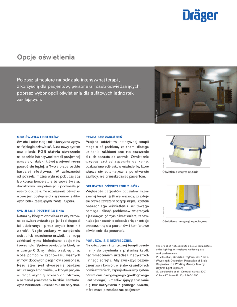 Opcje oświetlenia MOC ŚWIATŁA I KOLORÓW PRACA BEZ ZAKŁÓCEŃ Światło i kolor mogą mieć korzystny wpływ na fizjologię człowieka1. Nasz nowy system oświetlenia RGB ułatwia stworzenie na oddziale intensywnej terapii przyjemnej atmosfery, dzięki której pacjenci mogą poczuć się lepiej, a Twoja praca będzie bardziej efektywna. W zależności od potrzeb, można wybrać pobudzającą lub kojącą temperaturę barwową światła, dodatkowo uzupełniając i podkreślając wystrój oddziału. To rozwiązanie oświetleniowe jest dostępne dla systemów sufitowych belek zasilających Ponta i Opera. Pacjenci oddziałów intensywnej terapii mogą mieć problemy ze snem, dlatego unikanie zakłóceń snu ma znaczenie dla ich powrotu do zdrowia. Oświetlenie wnętrza szuflad zapewnia delikatne, pozbawione odblasków oświetlenie, które włącza się automatycznie po otwarciu szuflady, nie przeszkadzając pacjentom. Naturalny biorytm człowieka zależy zarówno od światła widzialnego, jak i od długości fal odbieranych przez zmysły inne niż wzrok 2 . Nagłe zmiany w natężeniu światła lub monotonne oświetlenie mogą zakłócać rytmy biologiczne pacjentów i personelu. System oświetlenia biodynamicznego CIS, symulując przebieg dnia, może pomóc w zachowaniu ważnych rytmów dobowych pacjentów i personelu. Rezultatem jest stworzenie bardziej naturalnego środowiska, w którym pacjenci mogą szybciej wracać do zdrowia, a personel pracować w bardziej komfortowych warunkach – niezależnie od pory dnia. Oświetlenie wnętrza szuflady DELIKATNE OŚWIETLENIE Z GÓRY Większość pacjentów oddziałów intensywnej terapii, jeśli nie wszyscy, znajduje się prawie zawsze w pozycji leżącej. System pośredniego oświetlenia sufitowego pomaga uniknąć problemów związanych z jaskrawym górnym oświetleniem, zapewniając jednocześnie odpowiednią orientację przestrzenną dla pacjentów i komfortowe oświetlenie dla personelu. D-1292-2011 SYMULACJA PRZEBIEGU DNIA D-1284-2011 D-14566-2014 Polepsz atmosferę na oddziale intensywnej terapii, z korzyścią dla pacjentów, personelu i osób odwiedzających, poprzez wybór opcji oświetlenia dla sufitowych jednostek zasilających. Oświetlenie nawigacyjne podłogowe PORUSZAJ SIĘ BEZPIECZNIEJ Na oddziałach intensywnej terapii często mamy do czynienia z plątaniną kabli, nagromadzeniem urządzeń medycznych i innego sprzętu. Aby zwiększyć bezpieczeństwo i komfort w słabo oświetlonych pomieszczeniach, zaprojektowaliśmy system oświetlenia nawigacyjnego (podłogowego i sufitowego), umożliwiający poruszanie się bez korzystania z górnego światła, które może przeszkadzać pacjentom. 1 2 The effect of high correlated colour temperature office lighting on employee wellbeing and work performance P. Mills et al., Circadian Rhythms 2007; 5: 2. Wavelength-Dependent Modulation of Brain Responses to a Working Memory Task by Daytime Light Exposure G. Vandewalle et al., Cerebral Cortex 2007, Volume17, Issue12, Pp. 2788-2795 PAKIET OŚWIETLENIA DANE TECHNICZNE Oświetlenie orientacyjne sufitowe – 7,5 W Integrowane z wysięgnikami kolumn wszystkich typów Zasilanie sieciowe Temperatura barwowa światła diod LED Oświetlenie orientacyjne podłogowe – 7,5 W Integrowane z głowicami zasilającymi kolumn Agila® i Movita® Zasilanie sieciowe Temperatura barwowa światła diod LED Oświetlenie wnętrza szuflady – 0,4 W Zasilanie sieciowe Temperatura barwowa światła diod LED Standardy podłączenia zasilacza Wtyczka Euro Wtyczka UK Wtyczka US Wtyczka australijska IEC wtyczka DIN 100 – 240 V ±10 %, 50/60 Hz 5400 K, światło białe zimne 100 – 240 V ±10 %, 50/60 Hz 5400 K, światło białe zimne 100 – 240 V ±10 %, 50/60 Hz 5400 K, światło białe zimne CEE 7/16 BS 1363 NEMA 1-15 AS 3112 EN 60320 Dostępne w zależności od konfiguracji urządzenia i półek. Moduł oświetleniowy RGB 3 × 54 W Integrowany z systemem Ponta, w tym jednostka sterująca i okablowanie Programy oświetlenia 8 scenariuszy oświetlenia i 4 sekwencje oświetleniowe Zasilanie sieciowe 220 – 240 V, 50/60 Hz Wymiary (D × S × G) 1118 × 230 × 30 mm Panel sterujący RGB ECD w zestawie z zasilaczem Kolor Napięcie robocze Wymiary (W × G × S) Lakier fortepianowy, czarny 10 – 24 V DC, 6 A 103 × 88 × 34 mm Pilot zdalnego sterowania RGB IR w zestawie z odbiornikiem na podczerwień Moduł oświetleniowy CIS 2 × 54 W Integrowany z systemem Ponta, w tym okablowanie i czasowy programator oświetlenia Zasilanie sieciowe 220 – 240 V, 50/60 Hz Wymiary (D × S × G) 1118 × 230 × 30 mm Lampy należy zamawiać oddzielnie. Opcje oświetleniowe dostępne dla jednostek zasilających Agila®, Movita®, Forta® i Ponta. CENTRALA Drägerwerk AG & Co. KGaA Moislinger Allee 53–55 23558 Lubeka, Niemcy www.draeger.com Producent: Dräger Medical GmbH Moislinger Allee 53–55 23558 Lubeka, Niemcy Od sierpnia 2015: Dräger Medical GmbH zmienia nazwę na Drägerwerk AG & Co. KGaA. POLSKA Dräger Polska Sp. z o.o. ul. Sułkowskiego 18a 85 - 655 Bydgoszcz Tel +48 52 346 14-33 (-34, -35) Fax+48 52 346 14-37 [email protected] 90 69 294 | 15.03-1 | Communications & Sales Marketing | PP | LE | Printed in Germany | Nie zawiera chloru – spełnia warunki ochrony środowiska | Zastrzegamy prawo zmian | © 2015 Drägerwerk AG & Co. KGaA 02 |