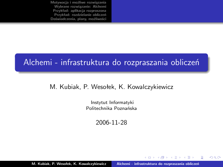 Motywacja i możliwe rozwiązania Wybrane rozwiązanie: Alchemi Przykład: aplikacja rozproszona Przykład: rozdzielanie obliczeń Doświadczenia, plany, możliwości Alchemi - infrastruktura do rozpraszania obliczeń M. Kubiak, P. Wesołek, K. Kowalczykiewicz Instytut Informatyki Politechnika Poznańska 2006-11-28 M. Kubiak, P. Wesołek, K. Kowalczykiewicz Alchemi - infrastruktura do rozpraszania obliczeń Motywacja i możliwe rozwiązania Wybrane rozwiązanie: Alchemi Przykład: aplikacja rozproszona Przykład: rozdzielanie obliczeń Doświadczenia, plany, możliwości Motywacja Potrzeby: Grant KBN A. Jaszkiewicza: rozproszone algorytmy metaheurystyczne Obliczenia własne: algorytmy stochastyczne wymagają wielokrotnego uruchamiania (próba losowa) Przypuszczalne potrzeby pracowników Zakładu Możliwości: Lab. 45: 15 × Pentium 4 3,2 GHz; spora moc obliczeniowa Argument P. Zielniewicza: lab. 45 da więcej niż nowe serwery obliczeniowe M. Kubiak, P. Wesołek, K. Kowalczykiewicz Alchemi - infrastruktura do rozpraszania obliczeń Motywacja i możliwe rozwiązania Wybrane rozwiązanie: Alchemi Przykład: aplikacja rozproszona Przykład: rozdzielanie obliczeń Doświadczenia, plany, możliwości Motywacja Wniosek: Warto udostępnić dla potrzeb Zakładu komputery w lab. 45 jako jeden zasób obliczeniowy Zastrzeżenie: Nie chcemy tworzyć konkurencji dla PCSS Istota działań: zagospodarowanie istniejącego sprzętu dla zaspokojenia wewnętrznych potrzeb Zakładu M. Kubiak, P. Wesołek, K. Kowalczykiewicz Alchemi - infrastruktura do rozpraszania obliczeń Motywacja i możliwe rozwiązania Wybrane rozwiązanie: Alchemi Przykład: aplikacja rozproszona Przykład: rozdzielanie obliczeń Doświadczenia, plany, możliwości Rozważane rozwiązania Potencjalni kandydaci: Condor (próby zakończone niepowodzeniem) Globus (nieznane; „kolubryna”) Alchemi (nieznane) Parallel Knoppix + MPI (nieznane) oprogramowanie dostępne na www.sourceforge.net M. Kubiak, P. Wesołek, K. Kowalczykiewicz Alchemi - infrastruktura do rozpraszania obliczeń Motywacja i możliwe rozwiązania Wybrane rozwiązanie: Alchemi Przykład: aplikacja rozproszona Przykład: rozdzielanie obliczeń Doświadczenia, plany, możliwości Alchemi: cechy podstawowe Wymagania: platforma .NET 2.0 system operacyjny Windows (koniecznie?) Funkcjonalność: łączenie mocy obliczeniowej (LAN, Internet) wykonywanie zadań niezależnych w sposób równoległy (istniejące, skompilowane aplikacje) wykonywanie aplikacji rozproszonych (wykorzystanie biblioteki Alchemi w .NET 2.0) praca w tle prosty system upawnień Open-source (http://www.sf.net/projects/alchemi) M. Kubiak, P. Wesołek, K. Kowalczykiewicz Alchemi - infrastruktura do rozpraszania obliczeń Motywacja i możliwe rozwiązania Wybrane rozwiązanie: Alchemi Przykład: aplikacja rozproszona Przykład: rozdzielanie obliczeń Doświadczenia, plany, możliwości Architektura logiczna M. Kubiak, P. Wesołek, K. Kowalczykiewicz Alchemi - infrastruktura do rozpraszania obliczeń Motywacja i możliwe rozwiązania Wybrane rozwiązanie: Alchemi Przykład: aplikacja rozproszona Przykład: rozdzielanie obliczeń Doświadczenia, plany, możliwości Fizyczna alokacja M. Kubiak, P. Wesołek, K. Kowalczykiewicz Alchemi - infrastruktura do rozpraszania obliczeń Motywacja i możliwe rozwiązania Wybrane rozwiązanie: Alchemi Przykład: aplikacja rozproszona Przykład: rozdzielanie obliczeń Doświadczenia, plany, możliwości Rozwinięcie liczby π aplikacja demonstracyjna Alchemi obliczanie kolejnych cyfr rozwinięcia liczby π zadania poszczególnych maszyn: obliczyć 10 kolejnych cyfr rozwinięcia M. Kubiak, P. Wesołek, K. Kowalczykiewicz Alchemi - infrastruktura do rozpraszania obliczeń Motywacja i możliwe rozwiązania Wybrane rozwiązanie: Alchemi Przykład: aplikacja rozproszona Przykład: rozdzielanie obliczeń Doświadczenia, plany, możliwości Uruchomienie istniejącej aplikacji w Alchemi Program: MSLS_2OPT.exe Wejście: tai75d.dat Wyjście: standardowe Parametry: -f -c 1000 -u tai75d.dat S 10 M. Kubiak, P. Wesołek, K. Kowalczykiewicz Alchemi - infrastruktura do rozpraszania obliczeń Motywacja i możliwe rozwiązania Wybrane rozwiązanie: Alchemi Przykład: aplikacja rozproszona Przykład: rozdzielanie obliczeń Doświadczenia, plany, możliwości Uruchomienie istniejącej aplikacji w Alchemi <task> <manifest> <embedded_file name="MSLS_2OPT.exe" location="MSLS_2OPT.exe" /> </manifest> M. Kubiak, P. Wesołek, K. Kowalczykiewicz Alchemi - infrastruktura do rozpraszania obliczeń Motywacja i możliwe rozwiązania Wybrane rozwiązanie: Alchemi Przykład: aplikacja rozproszona Przykład: rozdzielanie obliczeń Doświadczenia, plany, możliwości Uruchomienie istniejącej aplikacji w Alchemi <job id="0"> <input> <embedded_file name="tai75d.dat" location="tai75d.dat" /> </input> <work run_command="MSLS_2OPT -f -c 1000 -u tai75d.dat S 10 > result0.txt" /> <output> <embedded_file name="result0.txt"/> </output> </job> </task> M. Kubiak, P. Wesołek, K. Kowalczykiewicz Alchemi - infrastruktura do rozpraszania obliczeń Motywacja i możliwe rozwiązania Wybrane rozwiązanie: Alchemi Przykład: aplikacja rozproszona Przykład: rozdzielanie obliczeń Doświadczenia, plany, możliwości Uruchomienie istniejącej aplikacji w Alchemi wiele niezależnych uruchomień ⇒ wiele sekcji <job> w jednym <task> wielokrotne uruchomienie tego samego na jednej maszynie ⇒ polecenie systemowe for M. Kubiak, P. Wesołek, K. Kowalczykiewicz Alchemi - infrastruktura do rozpraszania obliczeń Motywacja i możliwe rozwiązania Wybrane rozwiązanie: Alchemi Przykład: aplikacja rozproszona Przykład: rozdzielanie obliczeń Doświadczenia, plany, możliwości Doświadczenia Minusy/ograniczenia: system Windows, platforma .NET ograniczona funkcjonalność Console ograniczona funkcjonalność JobSubmitter kłopoty instalacyjne (uruchamianie usług) kłopoty z bazą danych MSDE hasła przechowywane w bazie danych w postac