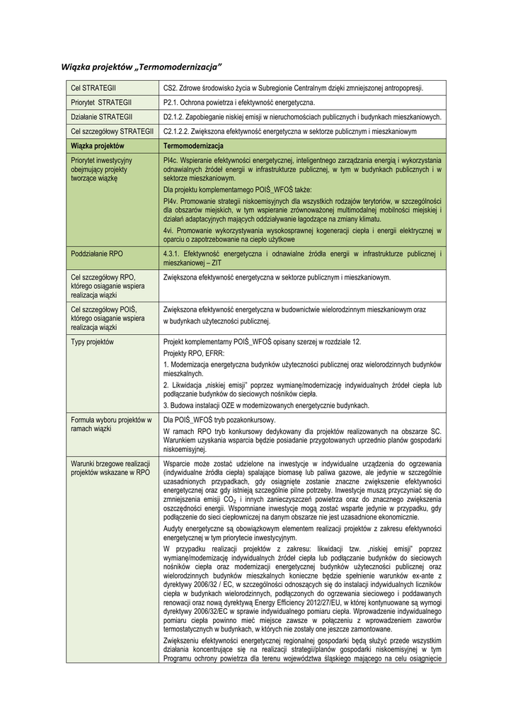 Wiązka projektów „Termomodernizacja” Cel STRATEGII CS2. Zdrowe środowisko życia w Subregionie Centralnym dzięki zmniejszonej antropopresji. Priorytet STRATEGII P2.1. Ochrona powietrza i efektywność energetyczna. Działanie STRATEGII D2.1.2. Zapobieganie niskiej emisji w nieruchomościach publicznych i budynkach mieszkaniowych. Cel szczegółowy STRATEGII C2.1.2.2. Zwiększona efektywność energetyczna w sektorze publicznym i mieszkaniowym Wiązka projektów Termomodernizacja Priorytet inwestycyjny obejmujący projekty tworzące wiązkę PI4c. Wspieranie efektywności energetycznej, inteligentnego zarządzania energią i wykorzystania odnawialnych źródeł energii w infrastrukturze publicznej, w tym w budynkach publicznych i w sektorze mieszkaniowym. Dla projektu komplementarnego POIŚ_WFOŚ także: PI4v. Promowanie strategii niskoemisyjnych dla wszystkich rodzajów terytoriów, w szczególności dla obszarów miejskich, w tym wspieranie zrównoważonej multimodalnej mobilności miejskiej i działań adaptacyjnych mających oddziaływanie łagodzące na zmiany klimatu. 4vi. Promowanie wykorzystywania wysokosprawnej kogeneracji ciepła i energii elektrycznej w oparciu o zapotrzebowanie na ciepło użytkowe Poddziałanie RPO 4.3.1. Efektywność energetyczna i odnawialne źródła energii w infrastrukturze publicznej i mieszkaniowej – ZIT Cel szczegółowy RPO, którego osiąganie wspiera realizacja wiązki Zwiększona efektywność energetyczna w sektorze publicznym i mieszkaniowym. Cel szczegółowy POIŚ, którego osiąganie wspiera realizacja wiązki Zwiększona efektywność energetyczna w budownictwie wielorodzinnym mieszkaniowym oraz w budynkach użyteczności publicznej. Typy projektów Projekt komplementarny POIŚ_WFOŚ opisany szerzej w rozdziale 12. Projekty RPO, EFRR: 1. Modernizacja energetyczna budynków użyteczności publicznej oraz wielorodzinnych budynków mieszkalnych. 2. Likwidacja „niskiej emisji” poprzez wymianę/modernizację indywidualnych źródeł ciepła lub podłączanie budynków do sieciowych nośników ciepła. 3. Budowa instalacji OZE w modernizowanych energetycznie budynkach. Formuła wyboru projektów w ramach wiązki Dla POIŚ_WFOŚ tryb pozakonkursowy. W ramach RPO tryb konkursowy dedykowany dla projektów realizowanych na obszarze SC. Warunkiem uzyskania wsparcia będzie posiadanie przygotowanych uprzednio planów gospodarki niskoemisyjnej. Warunki brzegowe realizacji projektów wskazane w RPO Wsparcie może zostać udzielone na inwestycje w indywidualne urządzenia do ogrzewania (indywidualne źródła ciepła) spalające biomasę lub paliwa gazowe, ale jedynie w szczególnie uzasadnionych przypadkach, gdy osiągnięte zostanie znaczne zwiększenie efektywności energetycznej oraz gdy istnieją szczególnie pilne potrzeby. Inwestycje muszą przyczyniać się do zmniejszenia emisji CO₂ i innych zanieczyszczeń powietrza oraz do znacznego zwiększenia oszczędności energii. Wspomniane inwestycje mogą zostać wsparte jedynie w przypadku, gdy podłączenie do sieci ciepłowniczej na danym obszarze nie jest uzasadnione ekonomicznie. Audyty energetyczne są obowiązkowym elementem realizacji projektów z zakresu efektywności energetycznej w tym priorytecie inwestycyjnym. W przypadku realizacji projektów z zakresu: likwidacji tzw. „niskiej emisji” poprzez wymianę/modernizację indywidualnych źródeł ciepła lub podłączanie budynków do sieciowych nośników ciepła oraz modernizacji energetycznej budynków użyteczności publicznej oraz wielorodzinnych budynków mieszkalnych konieczne będzie spełnienie warunków ex-ante z dyrektywy 2006/32 / EC, w szczególności odnoszących się do instalacji indywidualnych liczników ciepła w budynkach wielorodzinnych, podłączonych do ogrzewania sieciowego i poddawanych renowacji oraz nową dyrektywą Energy Efficiency 2012/27/EU, w której kontynuowane są wymogi dyrektywy 2006/32/EC w sprawie indywidualnego pomiaru ciepła. Wprowadzenie indywidualnego pomiaru ciepła powinno mieć miejsce zawsze w połączeniu z wprowadzeniem zaworów termostatycznych w budynkach, w których nie zostały one jeszcze zamontowane. Zwiększeniu efektywności energetycznej regionalnej gospodarki będą służyć przede wszystkim działania koncentrujące się na realizacji strategii/planów gospodarki niskoemisyjnej w tym Programu ochrony powietrza dla terenu województwa śląskiego mającego na celu osiągnięcie poziomów dopuszczalnych substancji w powietrzu oraz pułapu stężenia ekspozycji. W związku z powyższym, działania związane z modernizacją energetyczną budynków (użyteczności publicznej i mieszkalnych wielorodzinnych) będą promowały jej kompleksowy wymiar (tzw. głęboka modernizacja oparta o system monitorowania i zarządzania energią), uwzględniającą również wysokosprawne źródła ciepła oraz modernizację sieci dystrybucji ciepła (w tym wymianę źródeł ciepła). Wsparciem będą objęte budynki mieszkalne wielorodzinne (m. in. budynki czynszowe, komunalne, które charakteryzują się wysoką – prawie 70% - tzw. luką remontową) oraz budynki użyteczności publicznej (m. in. budynki użyteczności publicznej objęte obowiązkiem modernizacji energetycznej termomodernizacji na podstawie art. 5 ust. 1 dyrektywy 2012/27/UE w sprawie efektywności energetycznej). Inwestycje w rozbudowę i modernizacje sieci ciepłowniczych będą dopuszczalne pod warunkiem dopuszczenia takiego wsparcia przez stosowne zapisy w Umowie Partnerstwa. Przy wyborze projektów do realizacji IZ będzie kierowała się m.in. następującymi kryteriami: efektywność kosztowa w powiązaniu z osiąganymi efektami ekologicznymi w stosunku do planowanych nakładów finansowych; wielkość redukcji CO₂; redukcja emisji pyłu PM10 (w przypadku wymiany źródeł energii); zastosowanie elementów budownictwa niskoenergetycznego / technologii zmniejszających zapotrzebowanie na energię; wpisywanie s